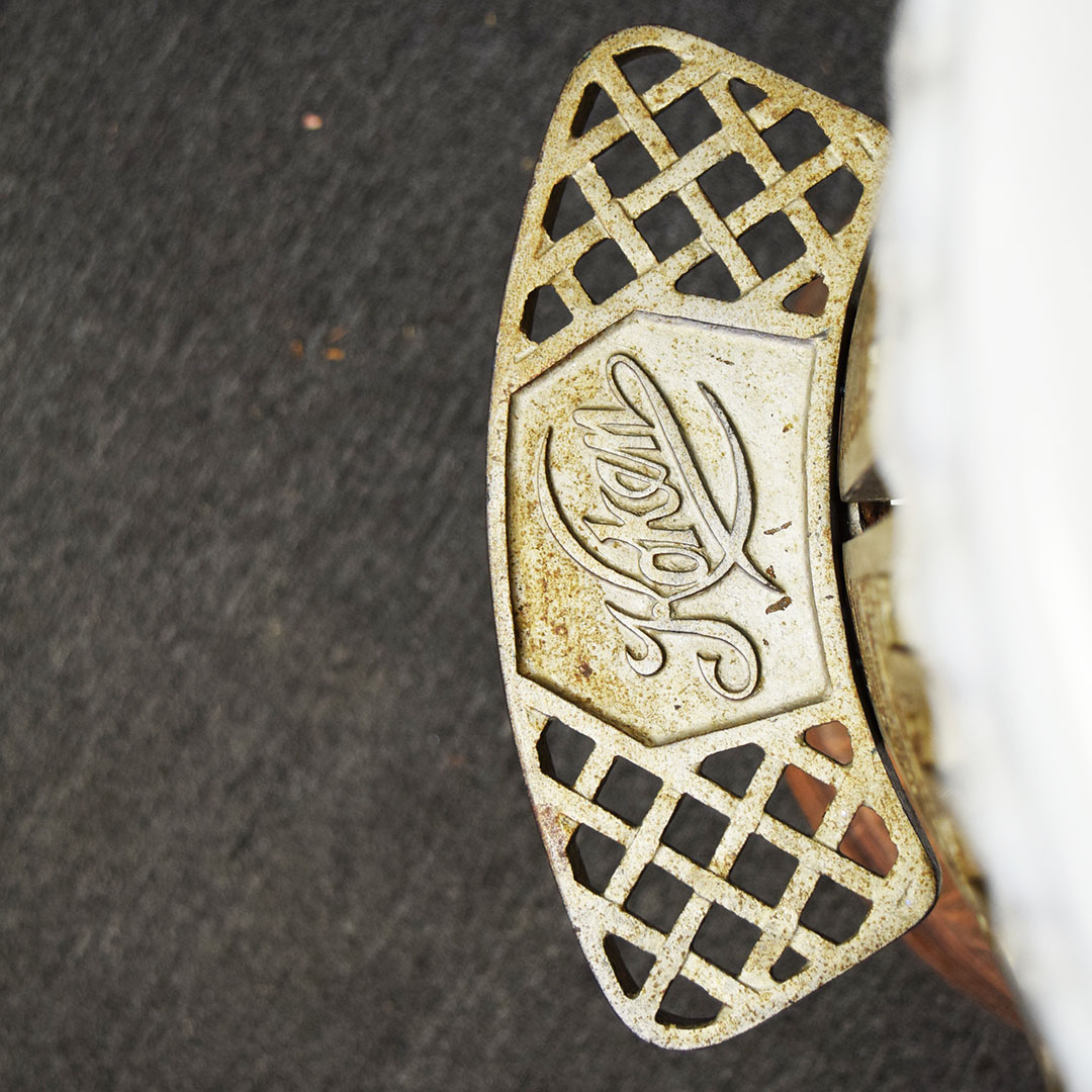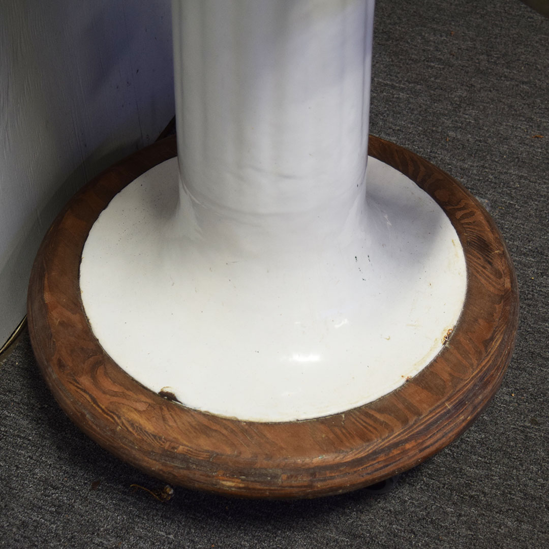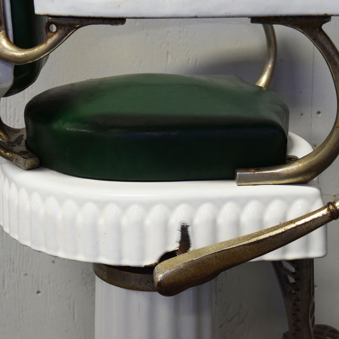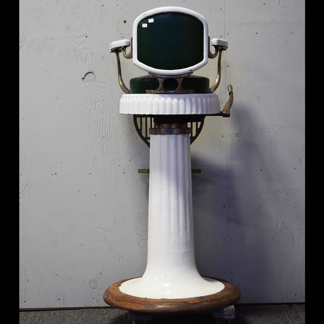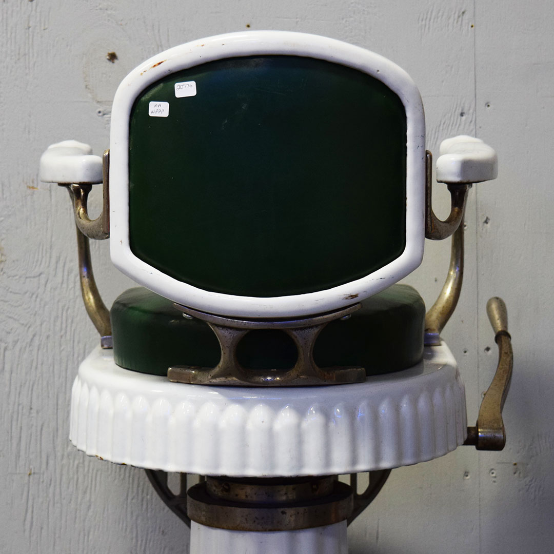 Are you Looking for a unique item to add to your barbershop collection? This Koken Child’s Barbershop Chair may be what you’re looking for! Finished in white porcelain, Koken produced it to fit a toddler exclusively when it was time for a haircut. The pedestal, seat base, arms, and back are white porcelain, and the seating surfaces are original leather. The back support, arm supports, and footrests are metal, as is the hydraulic arm on the right side. Chipping can be seen on the porcelain finish, most notably by the arm on the right side and some chips on the base. On the original leather seat, a small cut is on the front edge and a wear split on the back edge. The metal trim is all original and has typical wear for the age. The hydraulics do not work. A wooden base on the bottom completes the chair and adds stability. This child’s barber chair dates from the 1920s to 1930s and is in unrestored condition. Due to the size and weight, please get in touch with us for a shipping estimate. 20970-WPPP