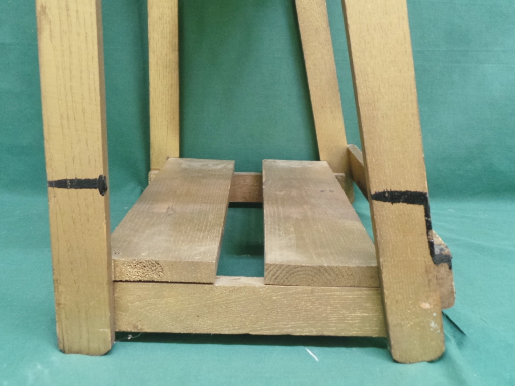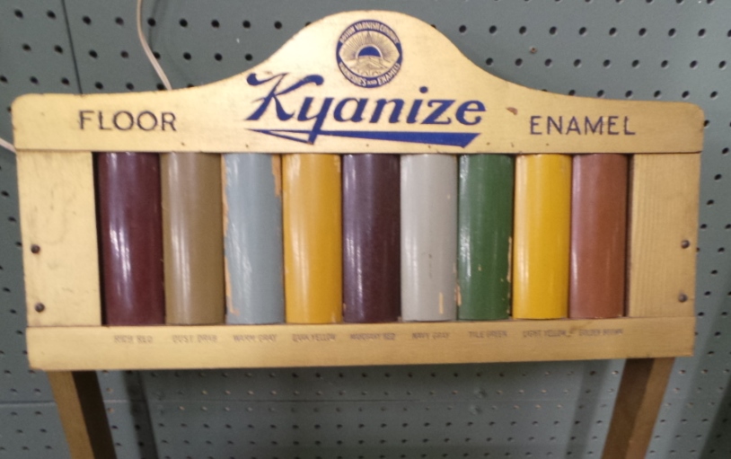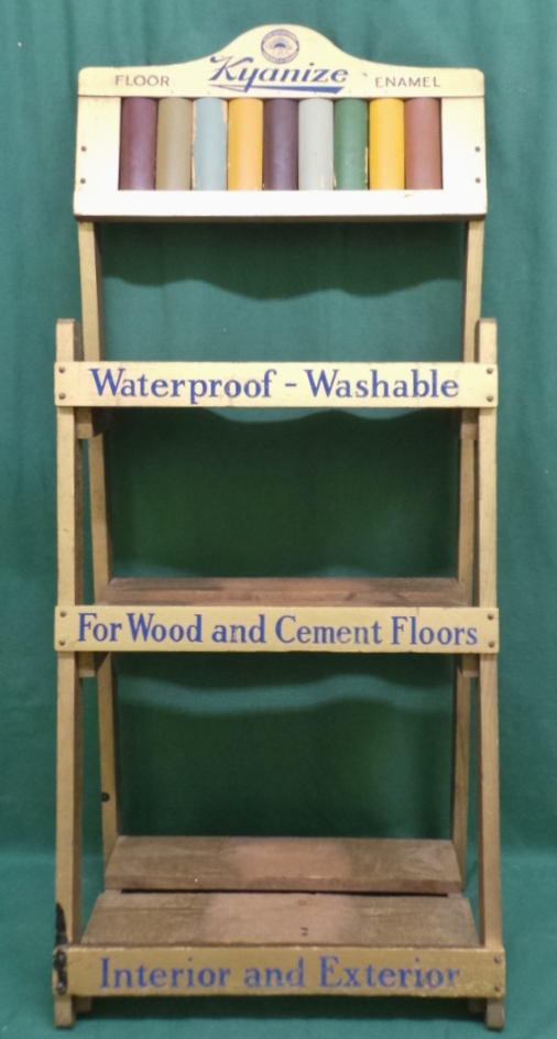 Walking into your local hardware store in the 1930’s you would be greeted by this great looking wooden paint rack advertising Kyanize paints. This rack showcased the different floor enamel paint colors and displayed the quarts and gallons for you to purchase. The different colors that were available were: Rich Red, Dust Drab, Warm Gray, Dark Yellow, Mahogany Red, Navy Gray, Tile Green, Light Yellow, and Golden Brown. Not very exciting names, but Kyanize was there to sell paint, not glamorize it! The shelves are different sizes, and different slogans, taking every chance to sell their product. The top shelf measures 7 inches deep and has the statement “Waterproof -Washable”. The middle shelf measures 9 inches deep and has the statement “For Wood and Cement Floors”. The bottom shelf measures 12 inches deep and has the statement “Interior and Exterior”. Made of wood and finished with nails and flat headed screws, it is marked “Made By Leominister Novelty Corp. Leominister, Mass.” on the back of the rack. Sometime in it’s life some black paint was dropped on the left side of the rack and dripped to the back leg. We did not try to remove the paint, it may remove the original finish and did not want to risk that. This rack stands 46 inches tall, 20 inches wide, and 16 inches deep. Great addition to any room, plus you can use the shelves to display some of your collection! This is an oversized shippable item. Please contact us for shipping quote. 17879-