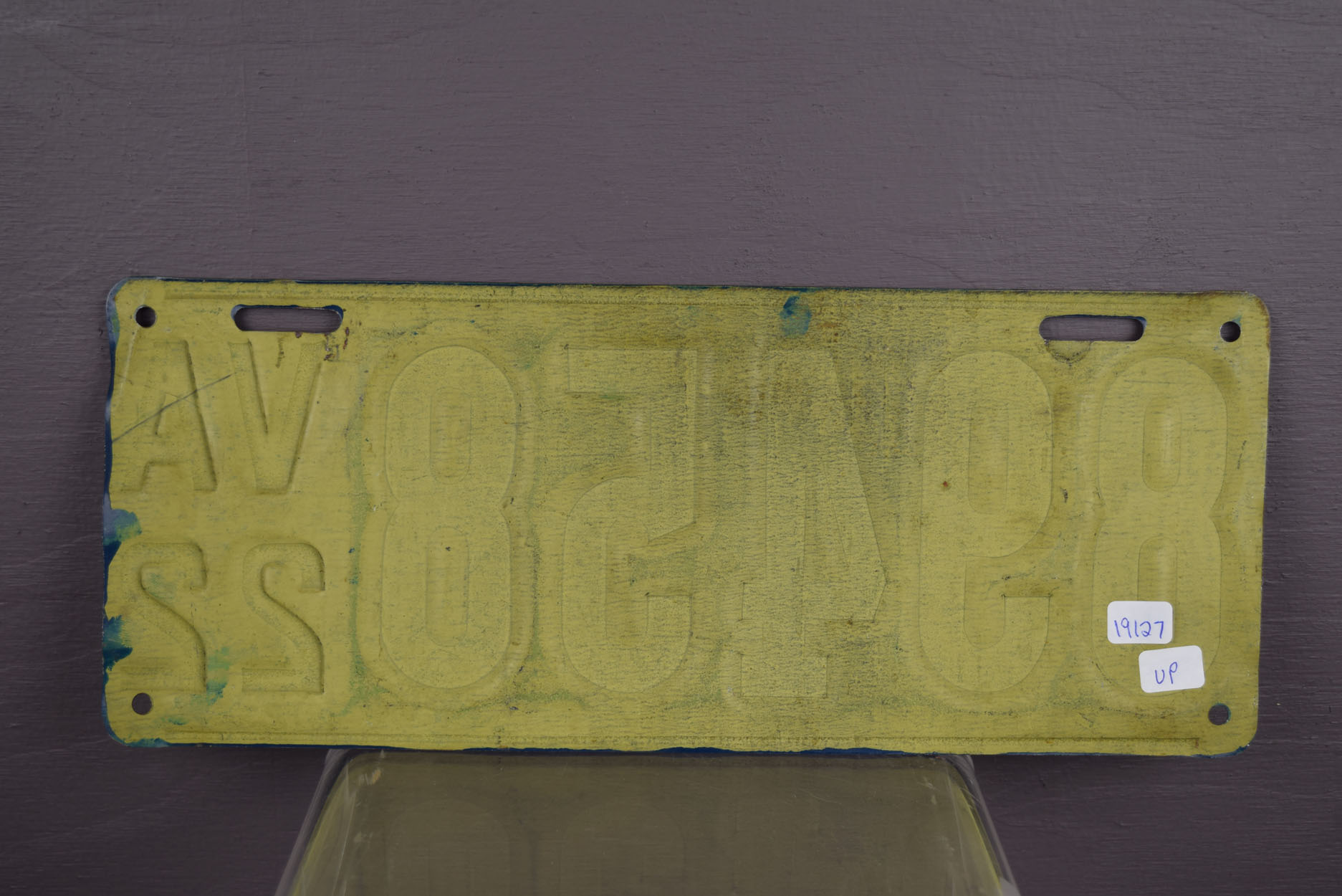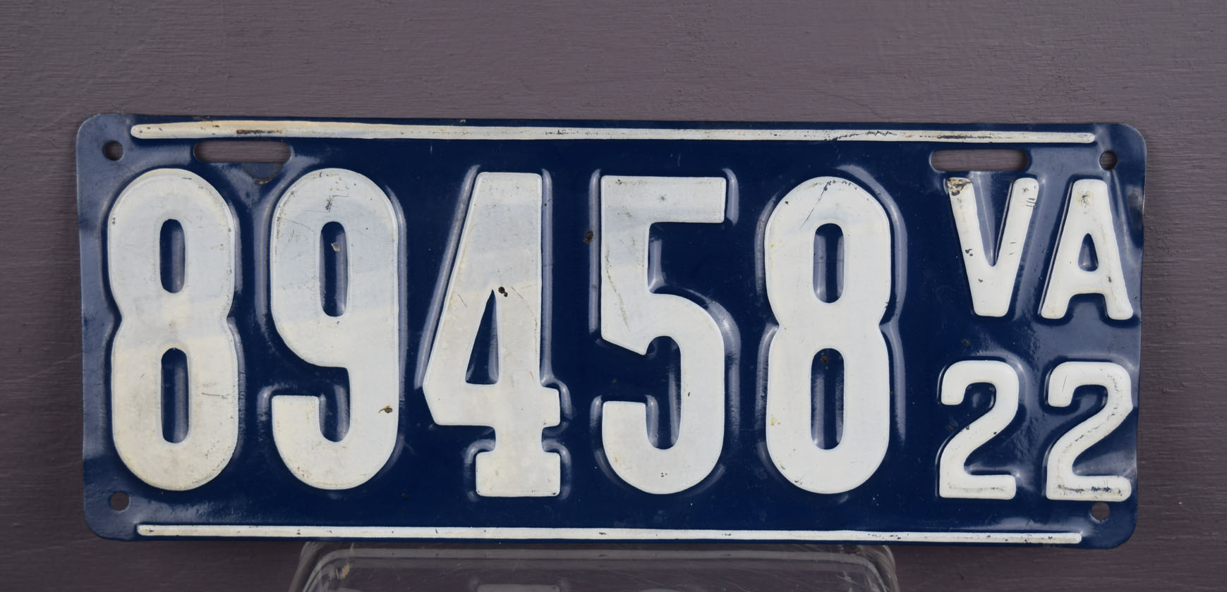 In the 1920’s, cars were large, so license tags were large as well! This plate measures thirteen and a half inches long by five and a half inches tall. The colors were changed yearly in Virginia, and this one has a dark blue background with white raised numbers/letters. A hole in each corner was added in the past for display purposes. Originally the tag was attached to the vehicle using the two oblong top holes. Some minor wear on the white letters with a small bend in the upper right corner can be seen on this vintage plate. It is in amazing shape for a century old! 19127-UP