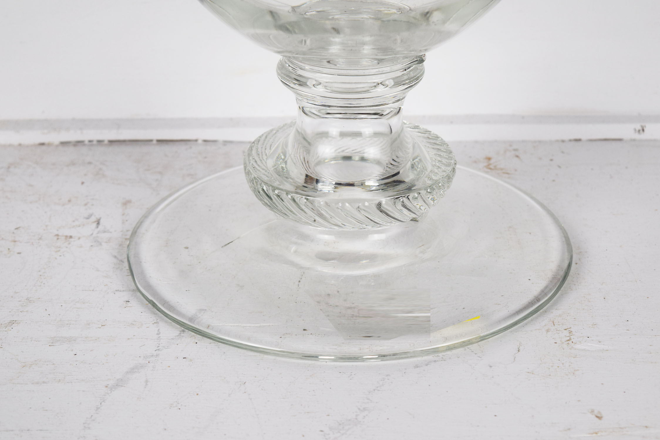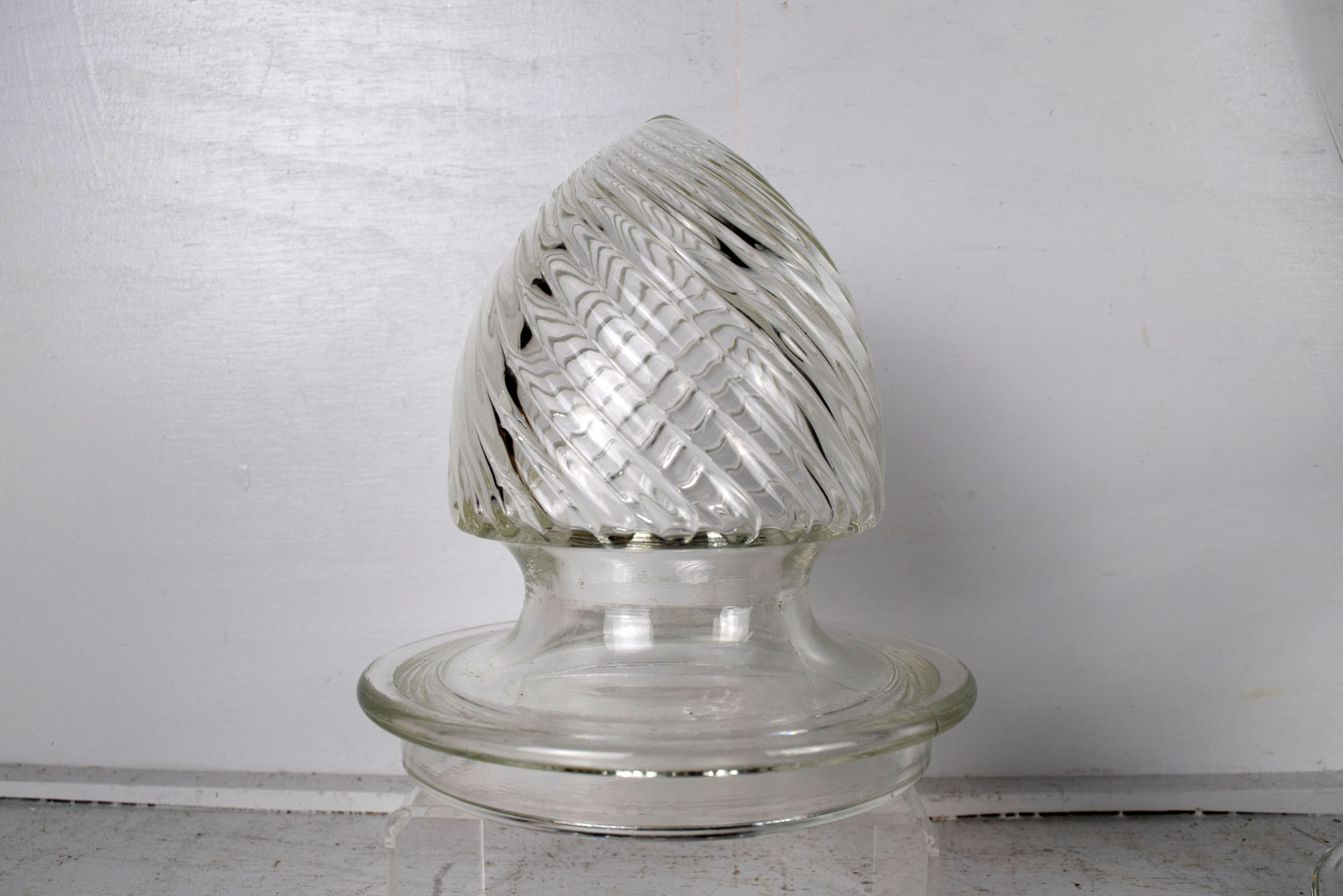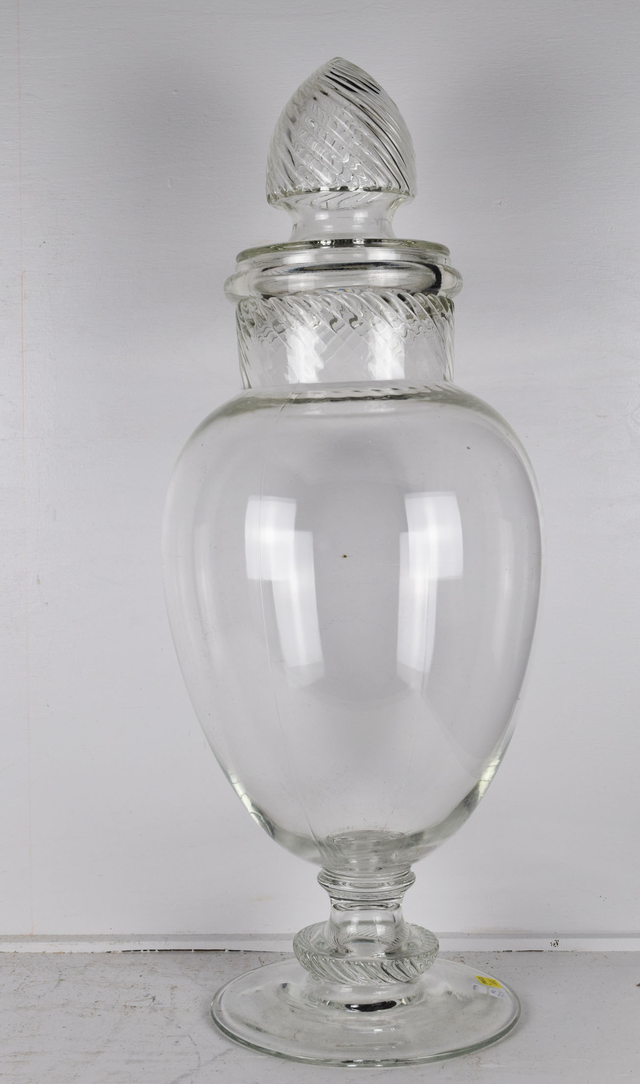 Just right for your country store display, this large glass Apothecary jar measures thirty inches tall by twelve inches in diameter. It features a swirl top and bottom with a smooth top which fits nicely in the jar. A very small chip can be felt inside the lip. The glass has the typical age bubbles which occurred during production. This is one of the largest Apothecary jars we have seen, and it will go nicely on your back bar display. 19790-OOY