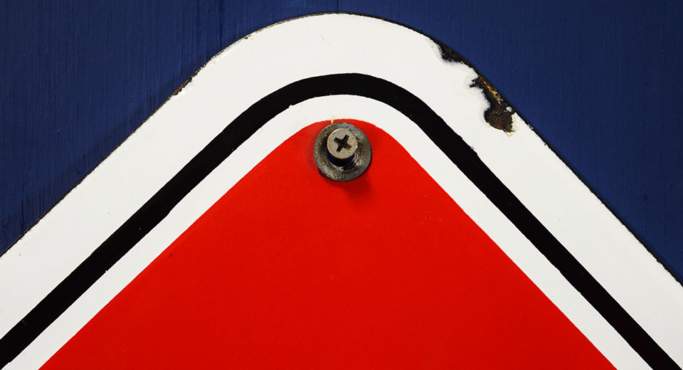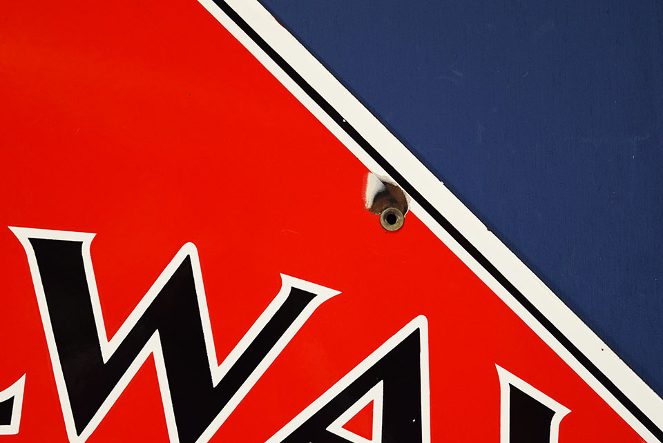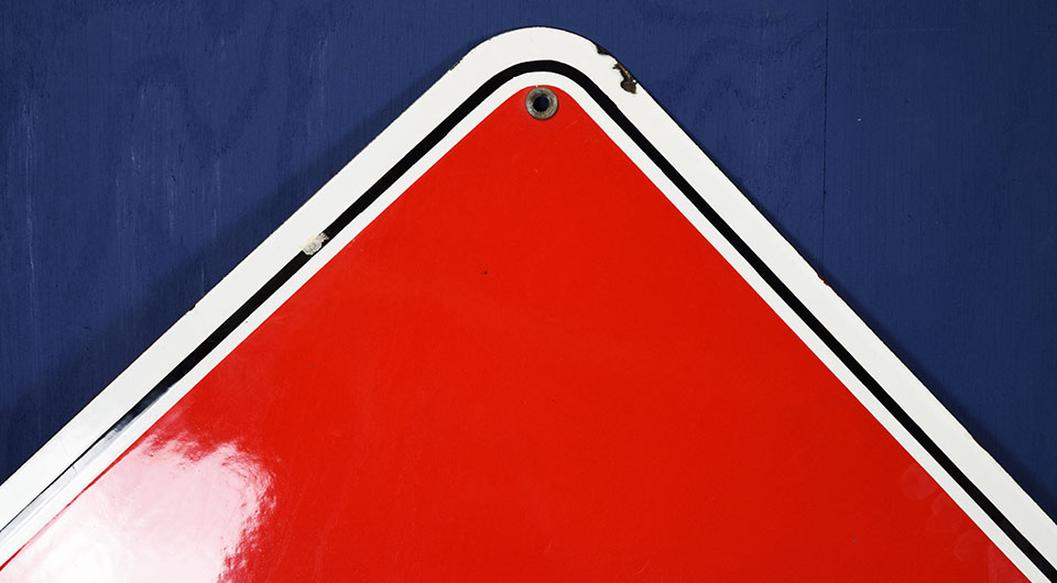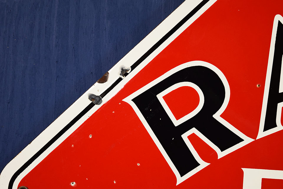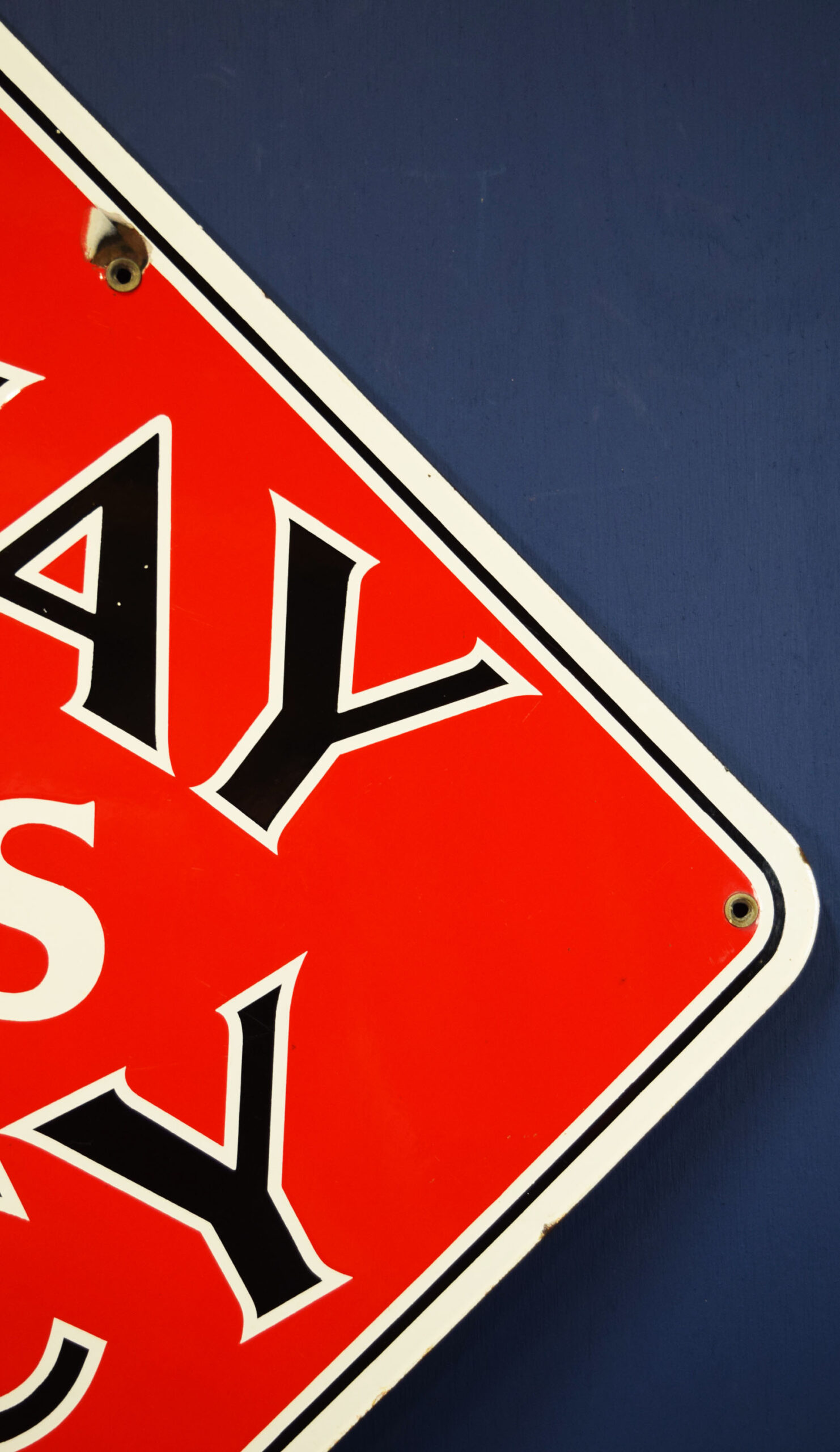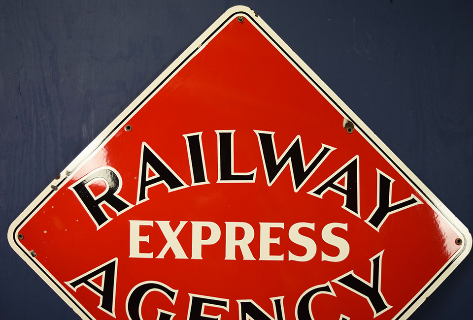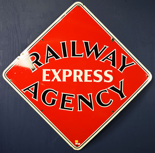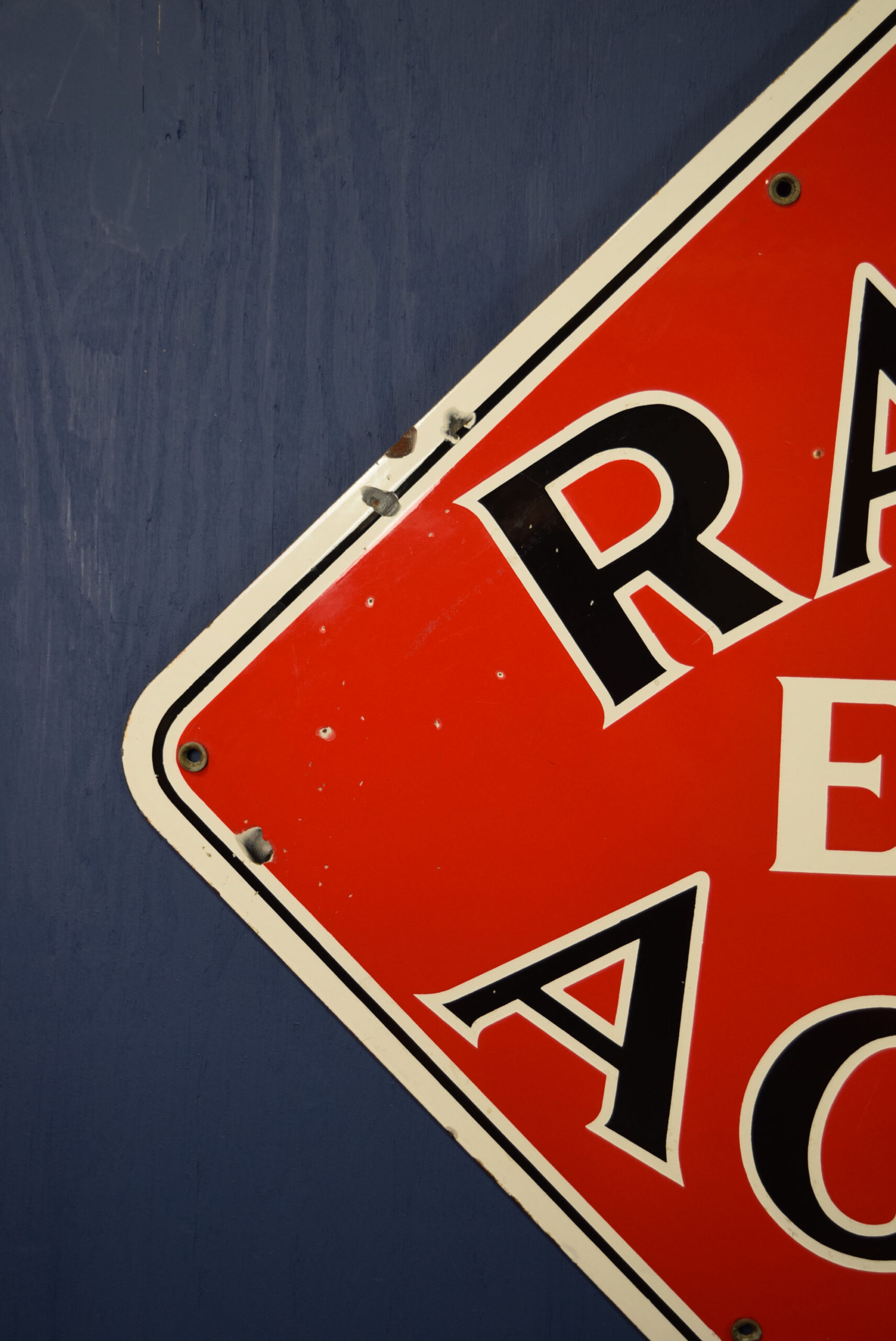 Dating from the late 1930’s to mid 1940’s, this ultra rare porcelain faced sign has beautiful colors with large letters. It measures 49.5 inches top to bottom and side to side, and hangs from the top to provide a nice diamond shape. You can see some minor chips in the porcelain around the outer edge, with a few around the white outer border and just inside the red background. The field of this rare sign has great gloss and great colors. Great piece to add to your railroad sign collection! 20087-QQYP