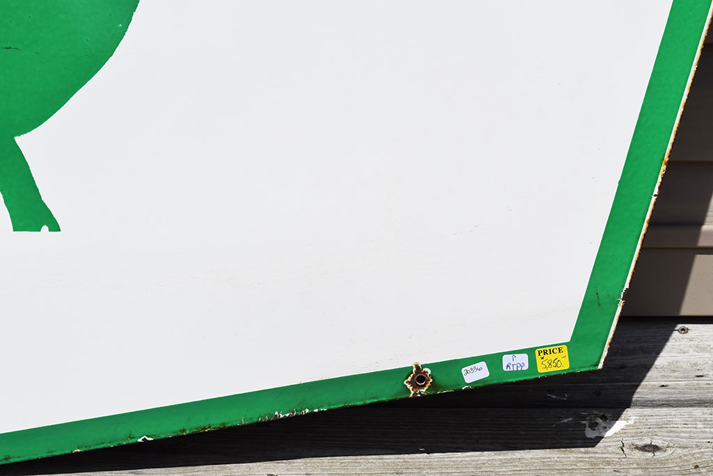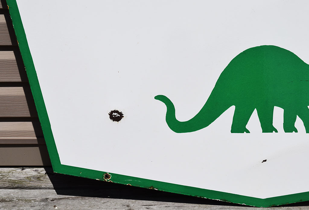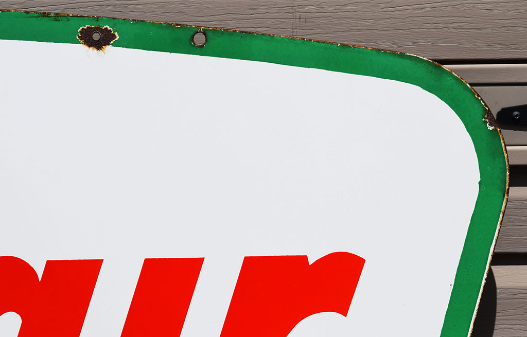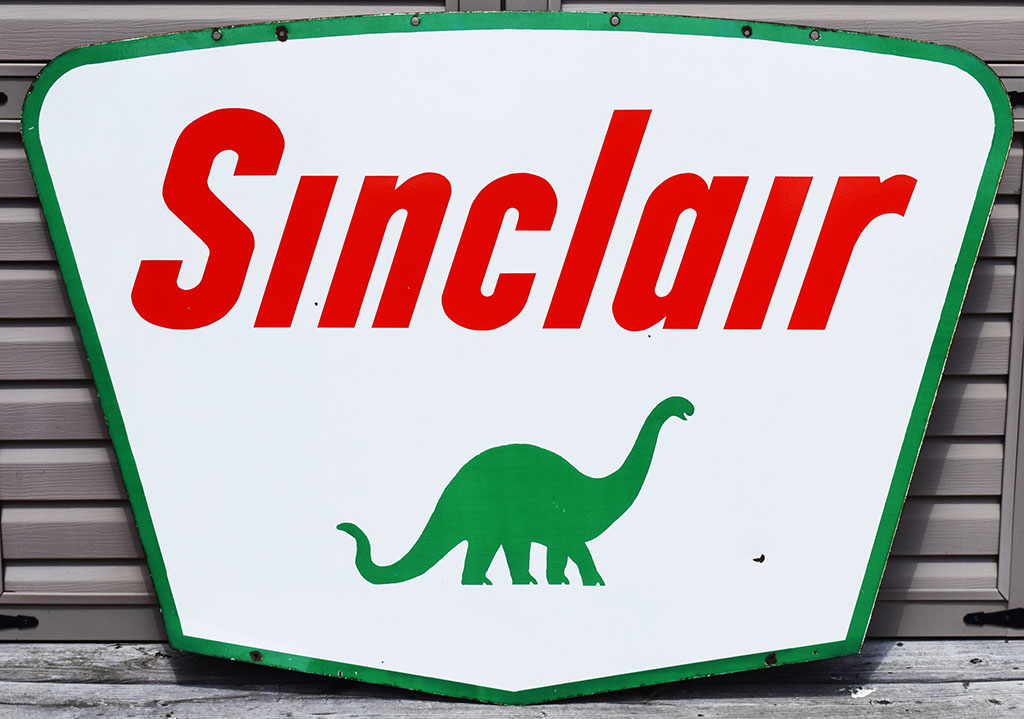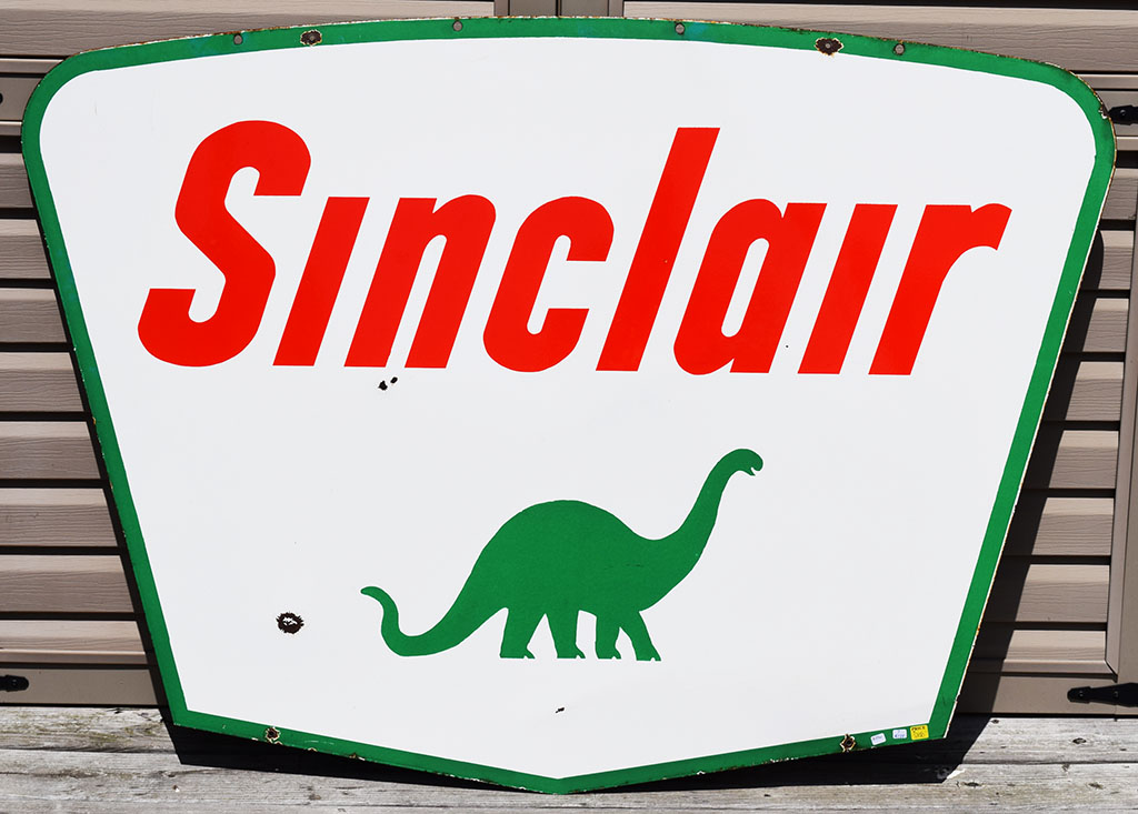 Check out this large Sinclair porcelain sign that just arrived! It measures forty-three inches tall by sixty inches across and is die cut, plus has a beautiful porcelain finish! The red Sinclair letters stand out nicely against the white background, while the green Dino logo is prominent at the bottom. Because this was used outside, some minor chipping can be seen in the porcelain finish around the outer edge, along with four added mounting holes (two top and two bottom). One side has a chip, which echoed to the other side producing some porcelain loss. Really one of the better Sinclair signs we have seen in a long time, so make the call and add this beauty to your collection! 20336-RTPP
