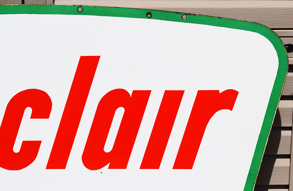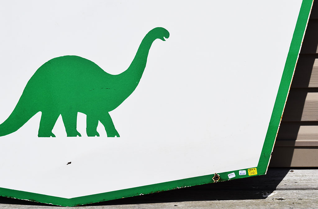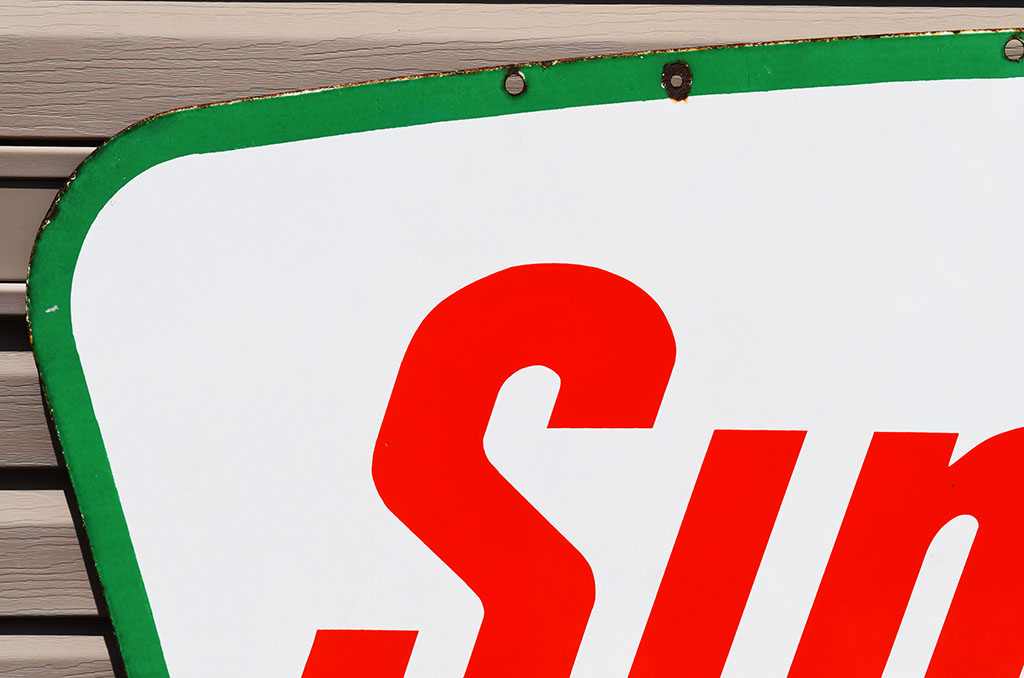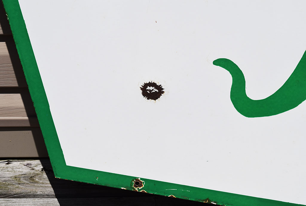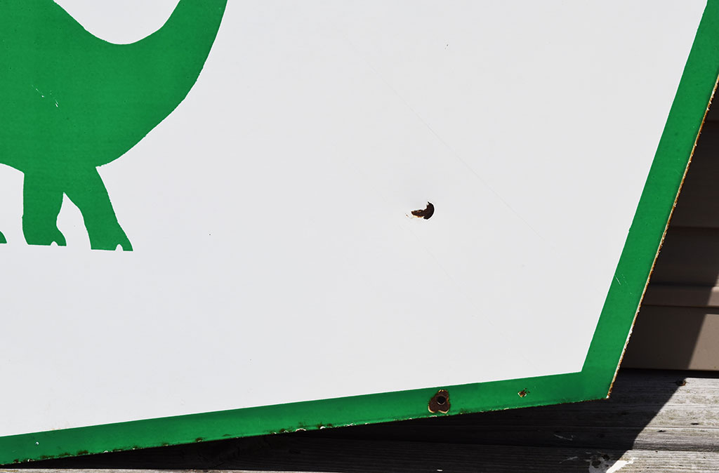 Check out this large Sinclair porcelain sign that just arrived! It measures forty-three inches tall by sixty inches across and is die cut, plus has a beautiful porcelain finish! The red Sinclair letters stand out nicely against the white background, while the green Dino logo is prominent at the bottom. Because this was used outside, some minor chipping can be seen in the porcelain finish around the outer edge, along with four added mounting holes (two top and two bottom). One side has a chip, which echoed to the other side producing some porcelain loss. Really one of the better Sinclair signs we have seen in a long time, so make the call and add this beauty to your collection! 20336-RTPP