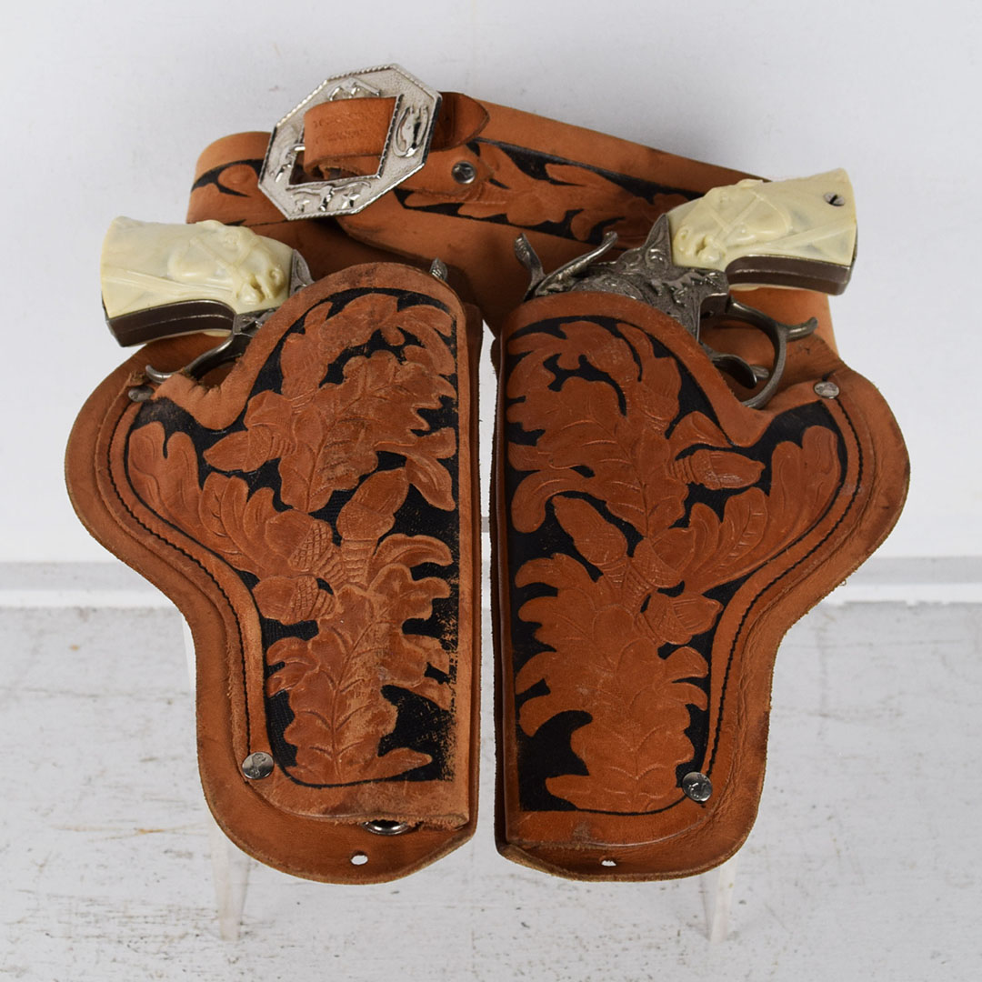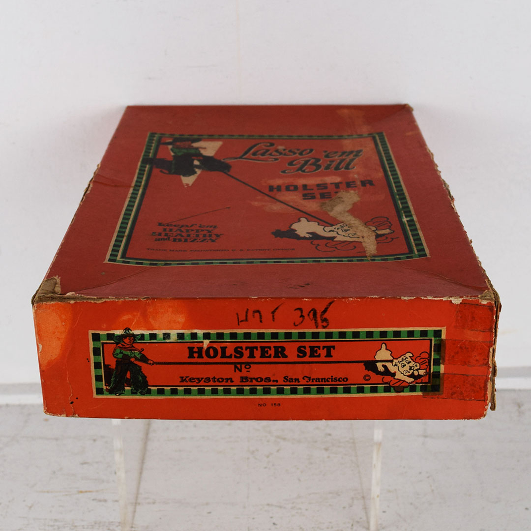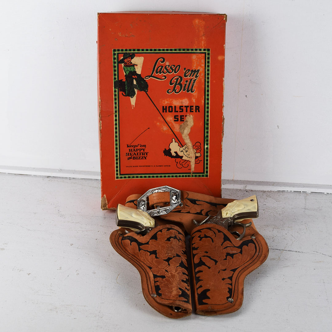 Every young boy was enamoured with Westerns in the 1950s and always had a holster around their waist, ready for action. This Lasso ‘em Bill holster set is complete with the original box, plus a pair of Gene Autry cap pistols! The leather holster is in great condition with typical wear. Both pistols are in nice condition. The outer box has minor wear, with a corner split. One end of the box has black crayon writing, and the other end has the writing “Ping Pong Set”. The outer box measures 13.5 inches tall by 8.5 inches wide. 21509-UP
