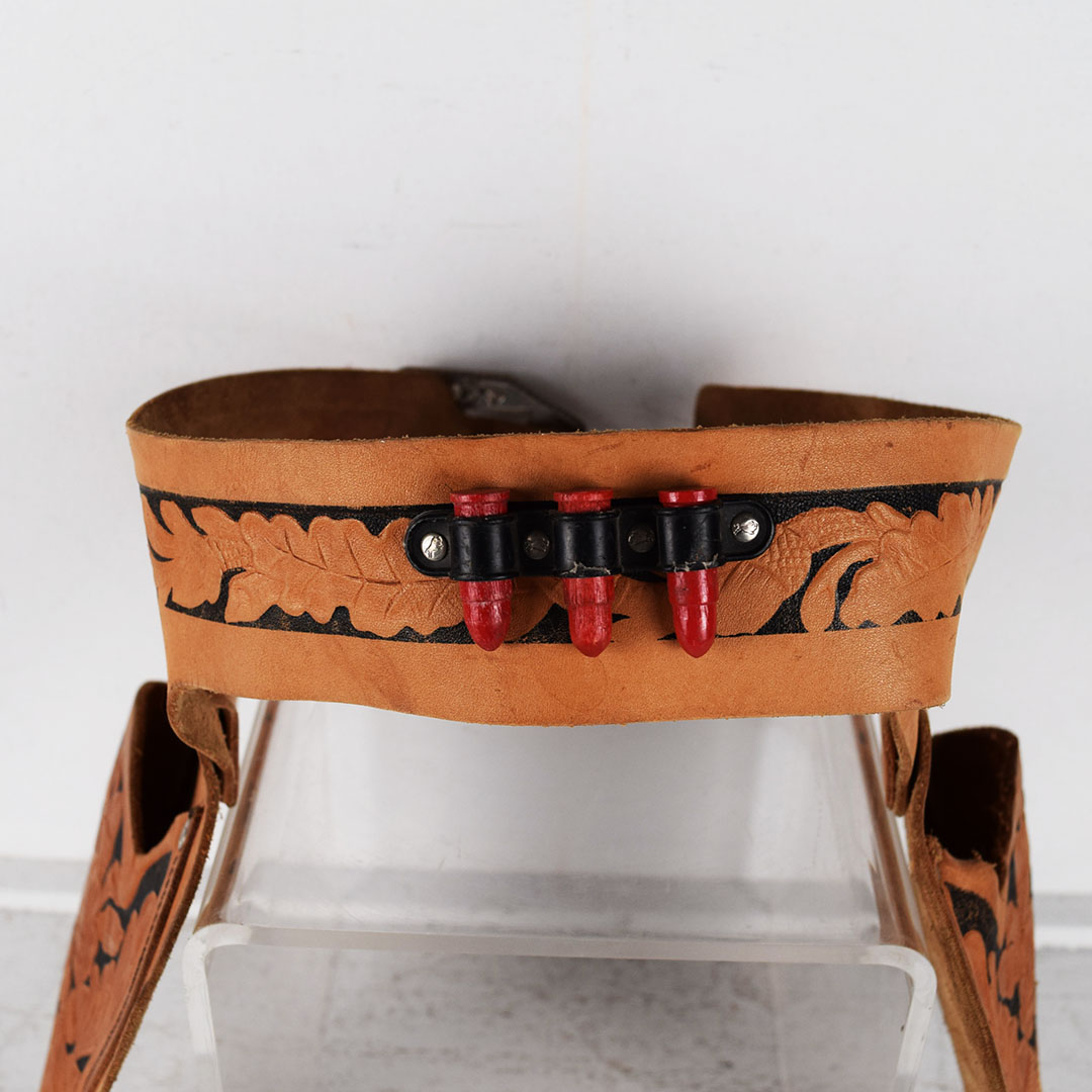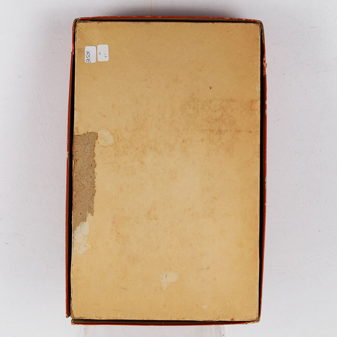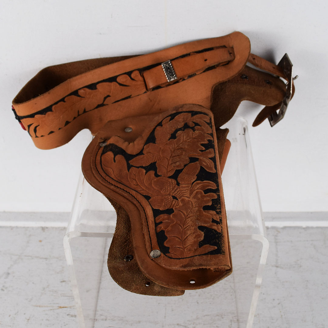 Every young boy was enamoured with Westerns in the 1950s and always had a holster around their waist, ready for action. This Lasso ‘em Bill holster set is complete with the original box, plus a pair of Gene Autry cap pistols! The leather holster is in great condition with typical wear. Both pistols are in nice condition. The outer box has minor wear, with a corner split. One end of the box has black crayon writing, and the other end has the writing “Ping Pong Set”. The outer box measures 13.5 inches tall by 8.5 inches wide. 21509-UP