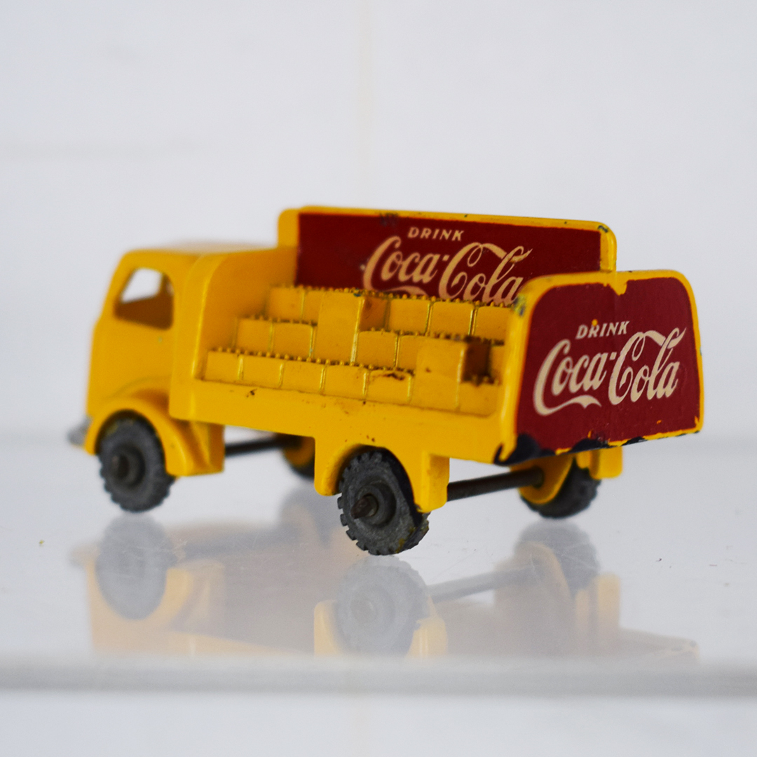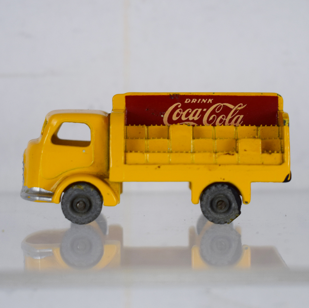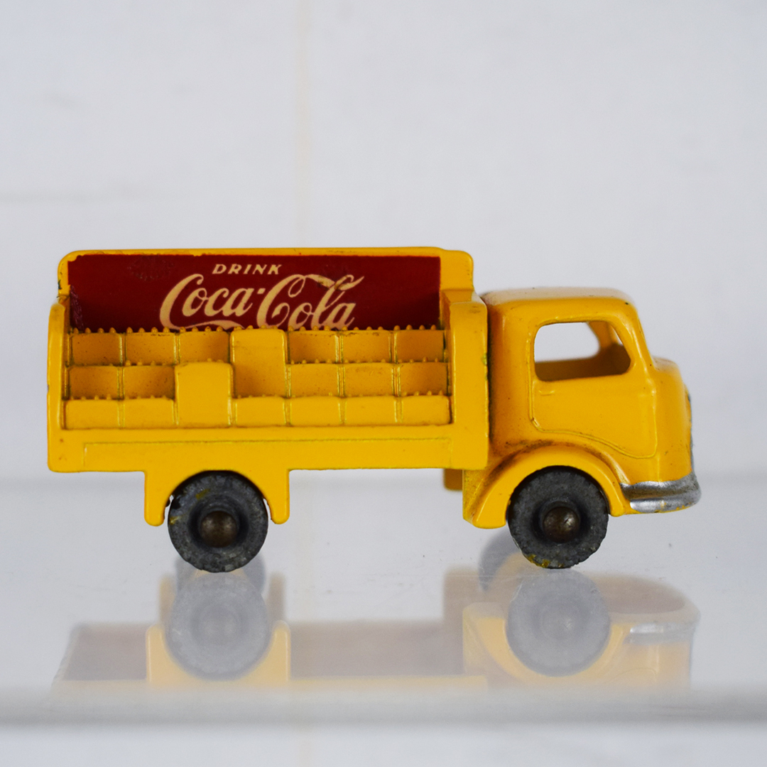 Much cheaper than the real thing, this 1957 Lesney Coca-Cola delivery truck allowed kids to carry it in their pants pocket everywhere. The yellow body features staggered cases on the back of the truck, with red and white Coca-Cola logos. The earliest models of this truck (this one) had grey wheels, while later ones had black wheels. It measures 1 inch tall by 2.25 inches long and is free of major chips. On the back of the truck, along with the rear wheels, black paint is evident. 21349-QP