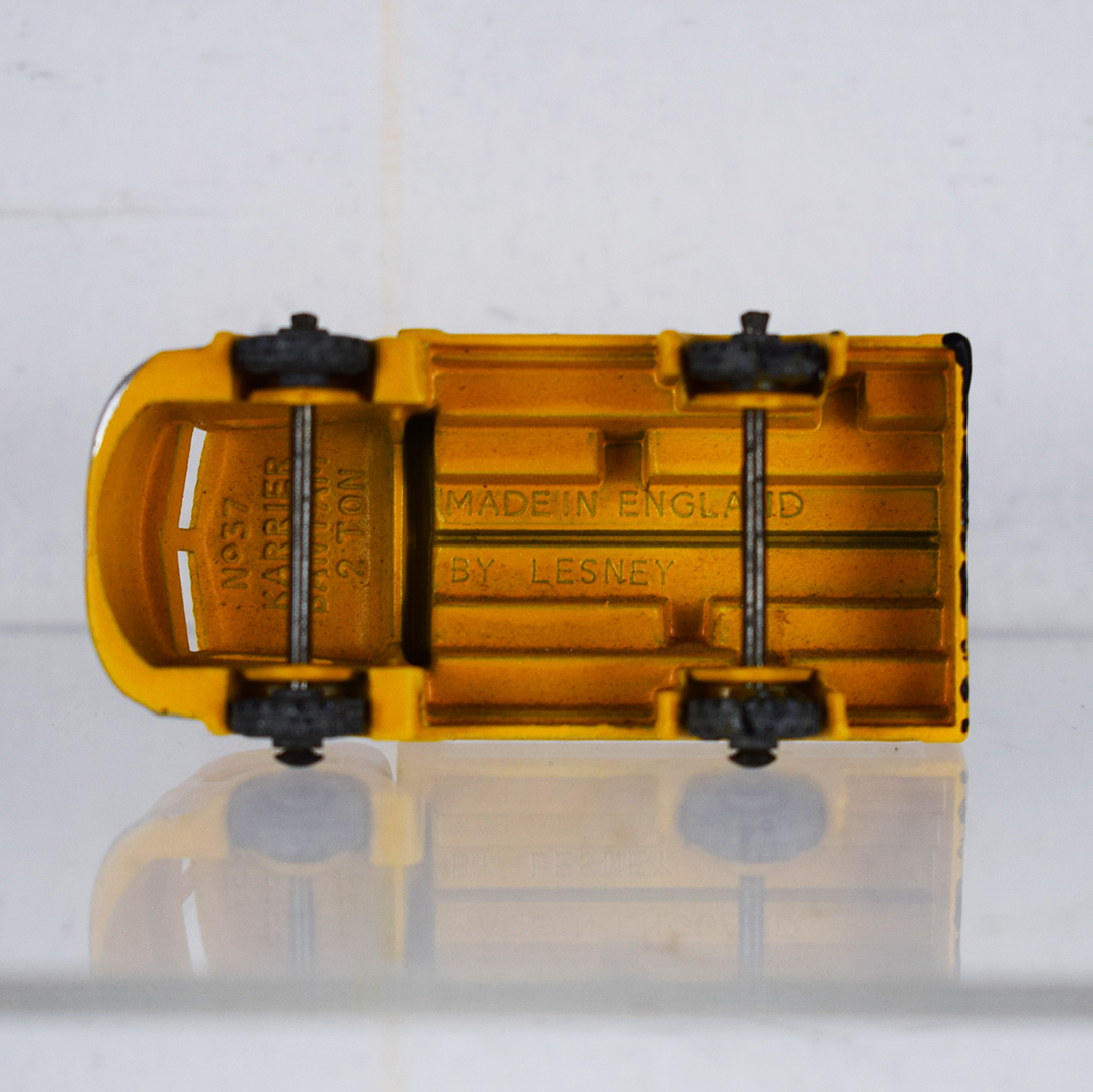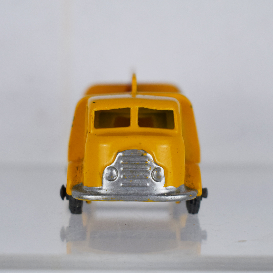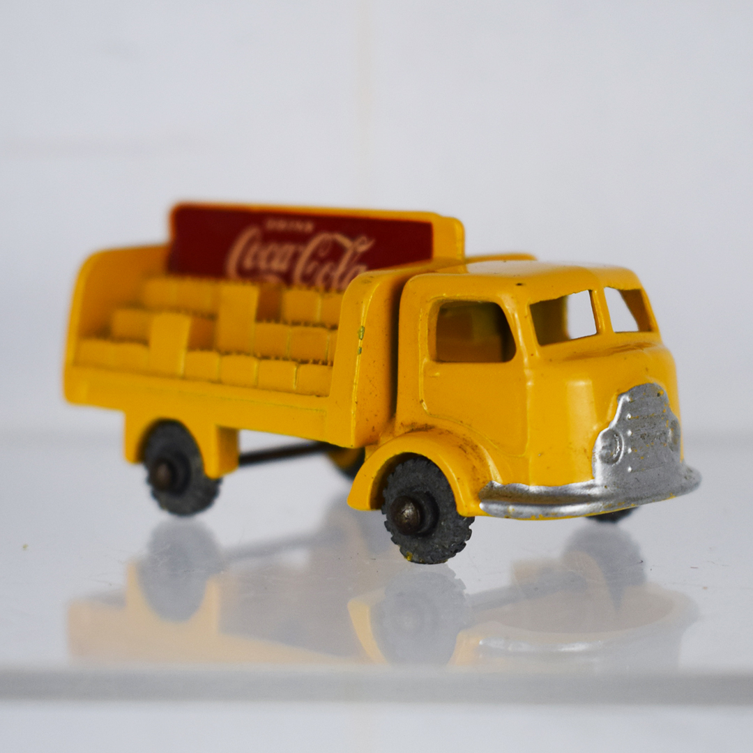 Much cheaper than the real thing, this 1957 Lesney Coca-Cola delivery truck allowed kids to carry it in their pants pocket everywhere. The yellow body features staggered cases on the back of the truck, with red and white Coca-Cola logos. The earliest models of this truck (this one) had grey wheels, while later ones had black wheels. It measures 1 inch tall by 2.25 inches long and is free of major chips. On the back of the truck, along with the rear wheels, black paint is evident. 21349-QP