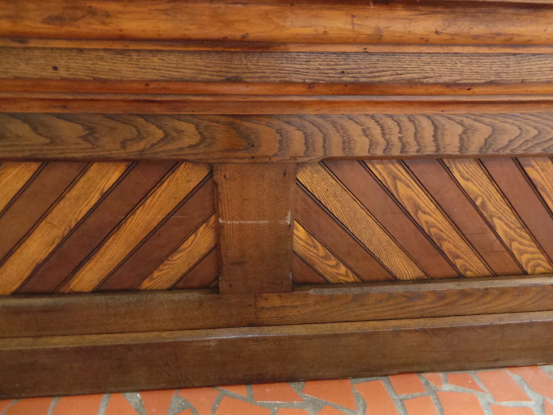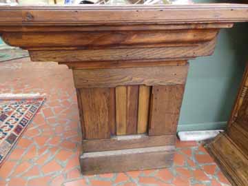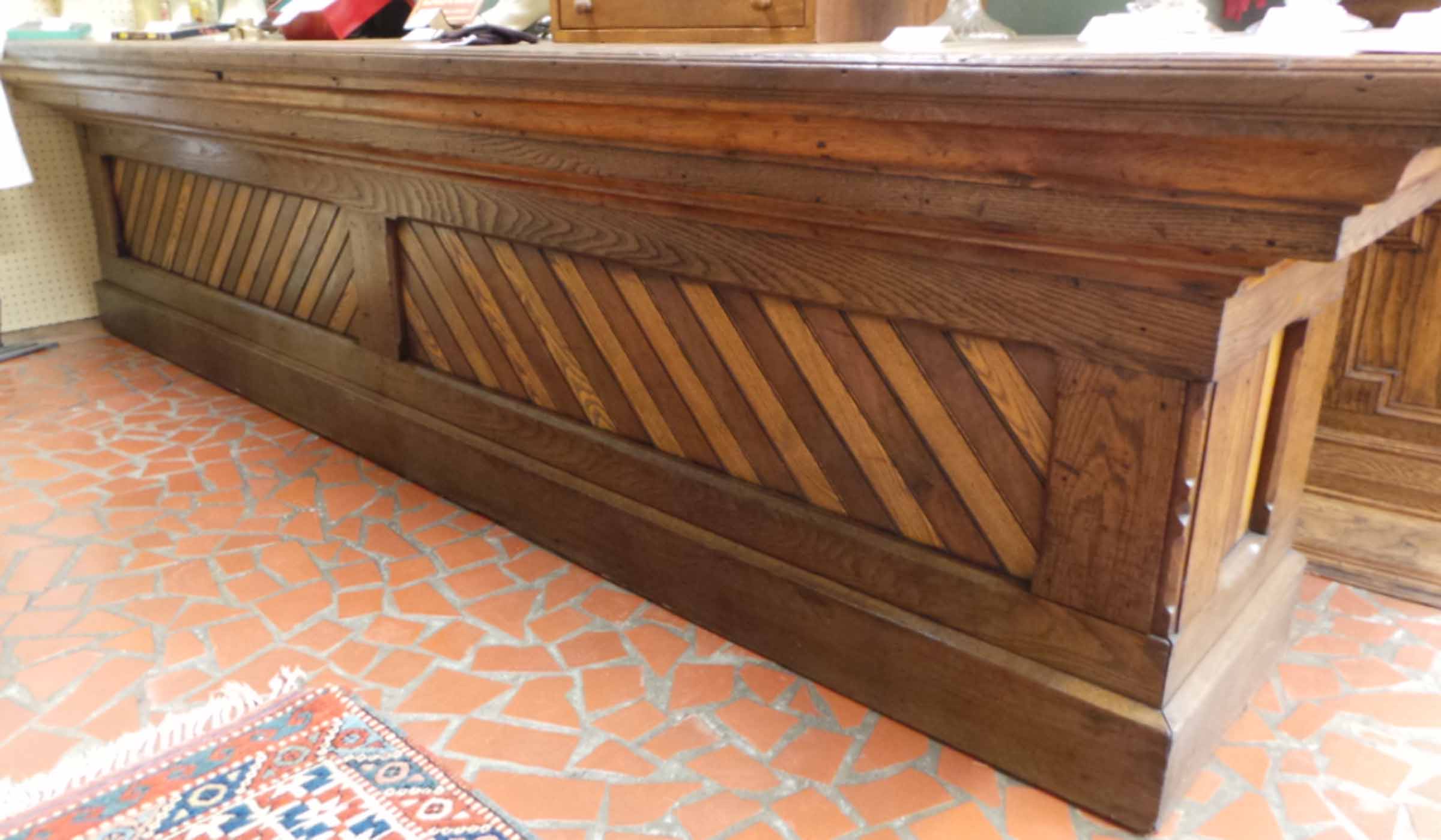 How do you take a plain jane counter and make it spectacular? You mix the wood on the top and sides to give it an extra pizzaz! This oak counter measures eleven foot, 4 inches long and features different slats of wood on the top to give it a pattern top that is twenty-nine inches deep. The front of this counter is made the same way with different inlays to give it a very nice look. Although it did not need it, the corners are carved to give it an even better look. The height of this counter is thirty-two inches tall and it has a solid wainscoting back. Some minor scratches on the top with a patched hole on the left side of the counter are typical for a general store counter. As you know, these were made to last, and of course the did! This beautiful example will look perfect in your home or business setting. This item will require a 3rd party shipper or pickup. Please contact us for more information. 18163-QUPP