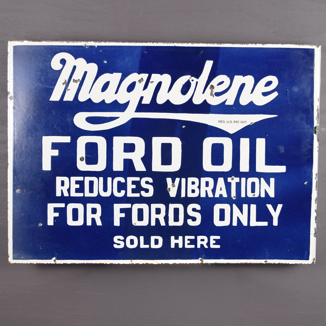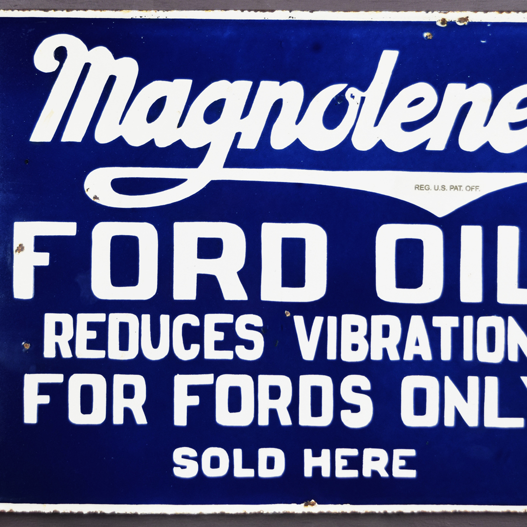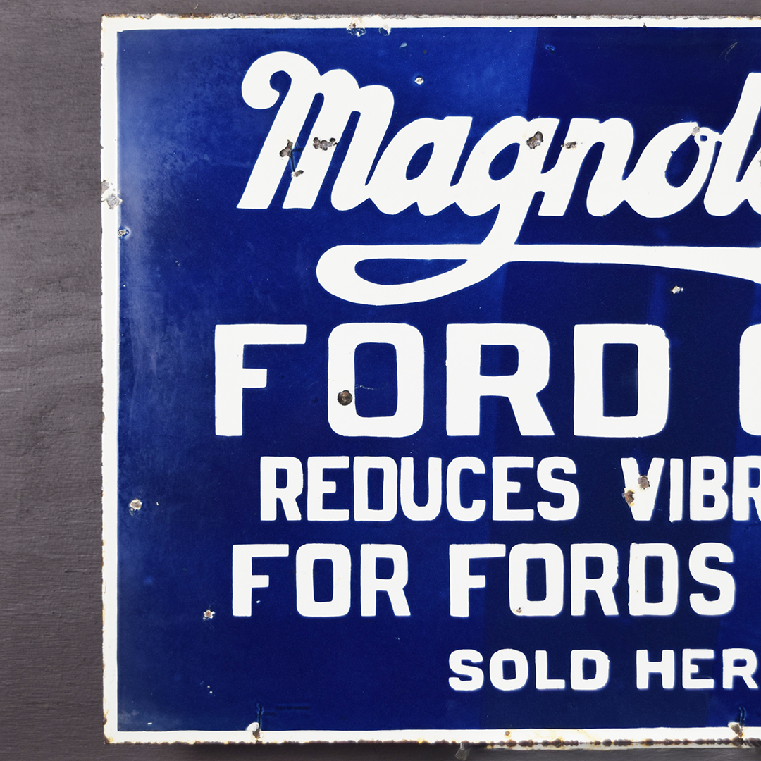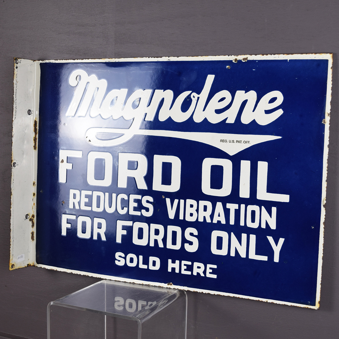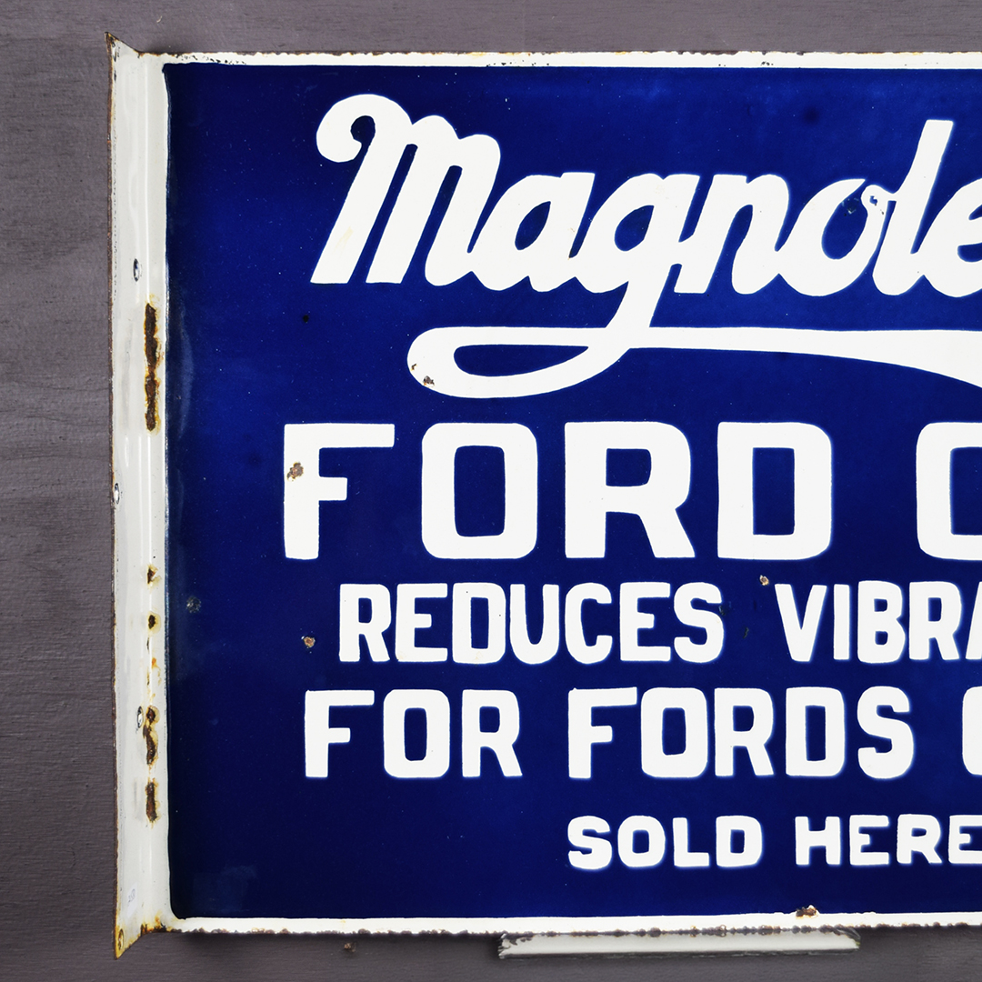 Dating from the 1930s, this Magnolene Ford Oil flange is double-sided and features a glossy porcelain finish on each side. The oil was designed for Ford products only and was intended to reduce engine vibrations. It measures 16 inches tall by 22.5 inches wide with a 2.25-inch flange on the side. The colors pop nicely on this flange, with nice porcelain shelving on each side. Minor chips are visible on each side, with no touch-up applied, and there are minor chips around the outer edges as well. Larger porcelain chips are visible inside the curved flange area and on the opposite side. 21581-QEWP