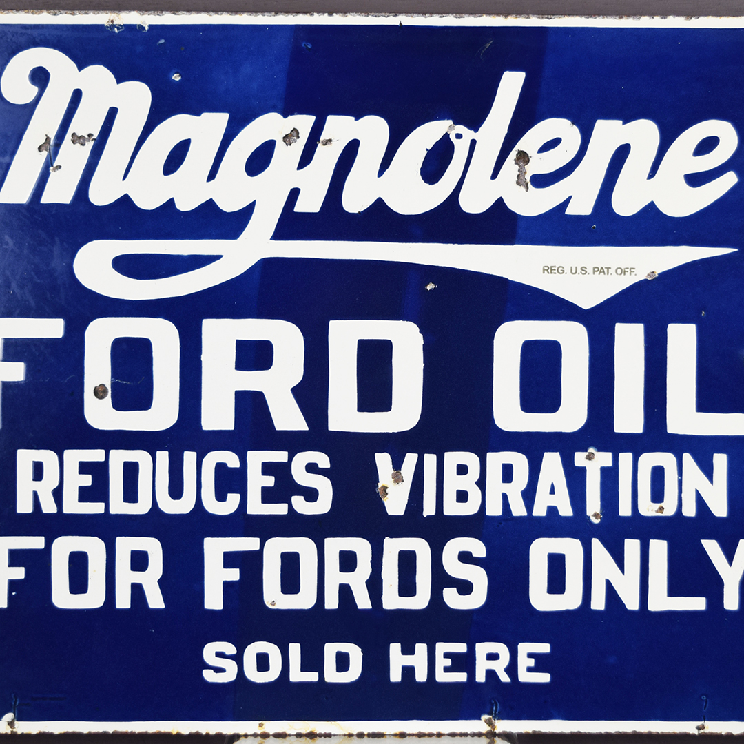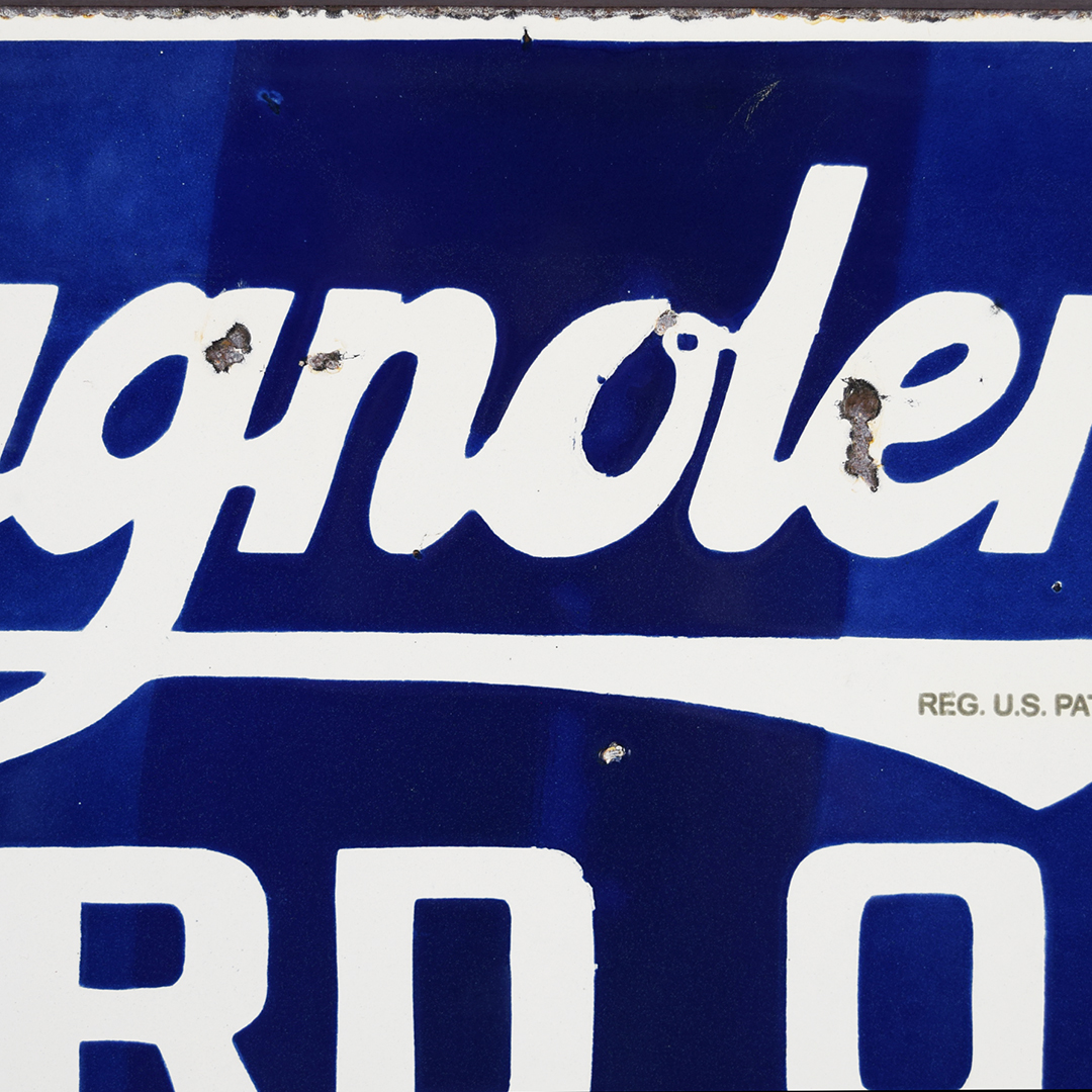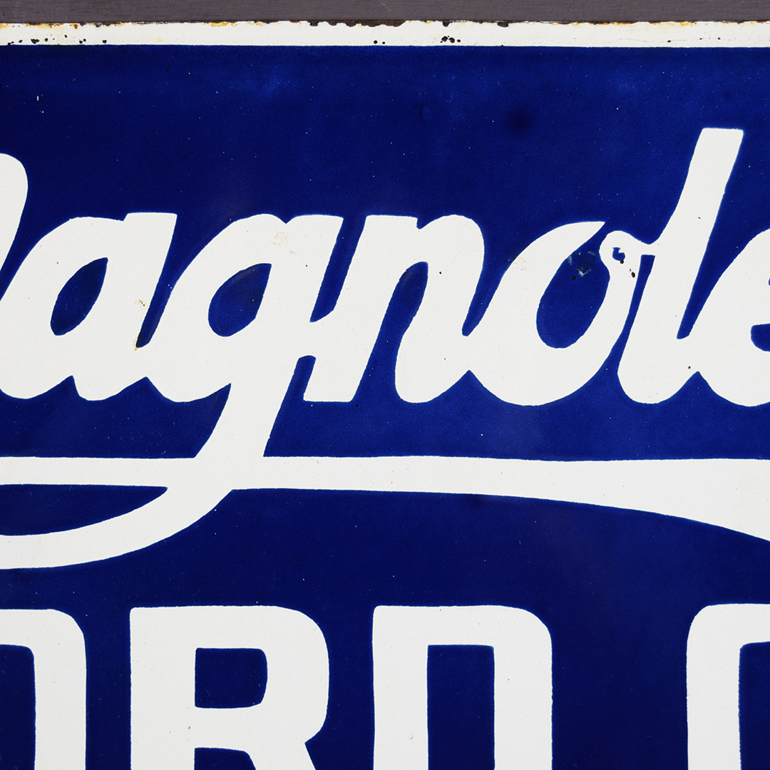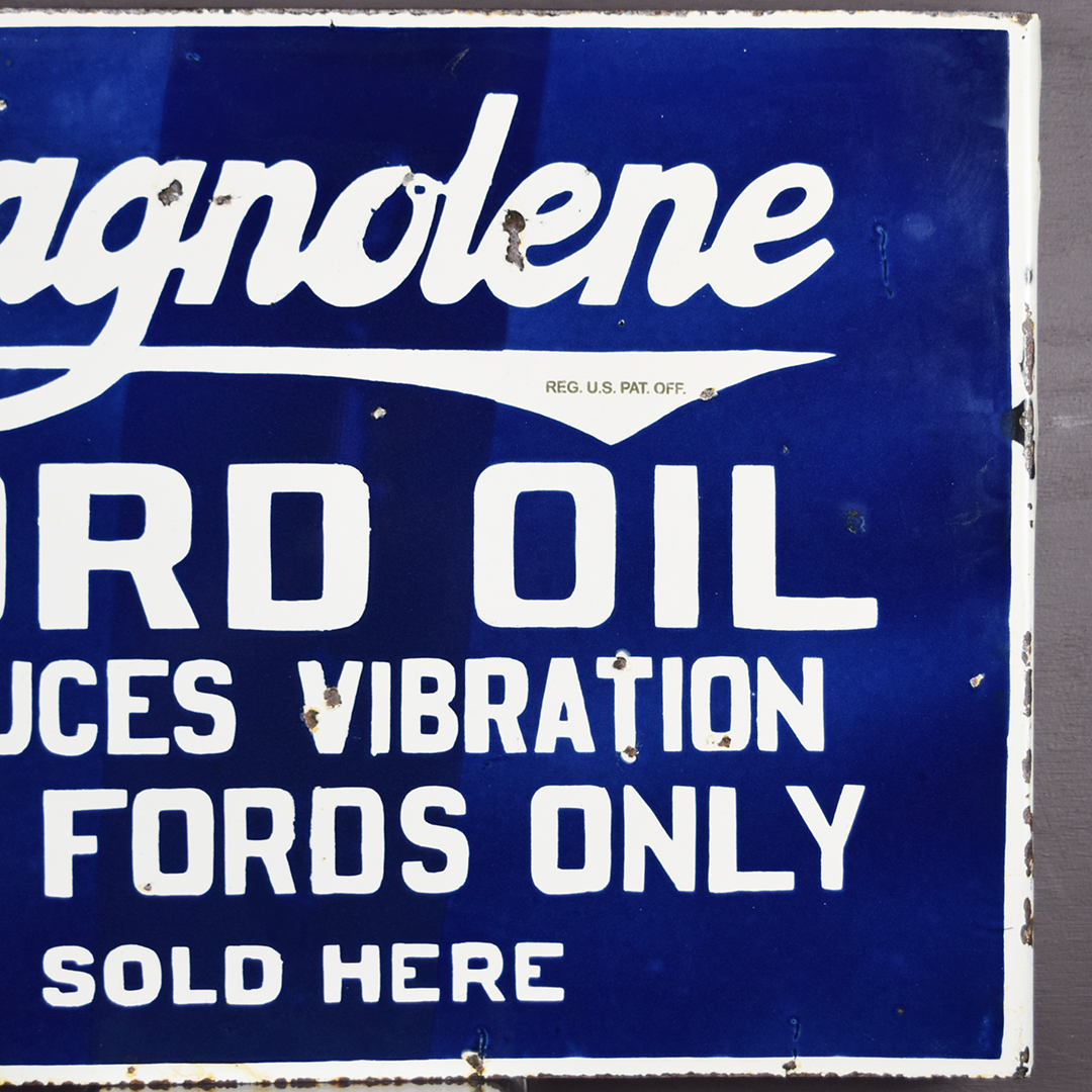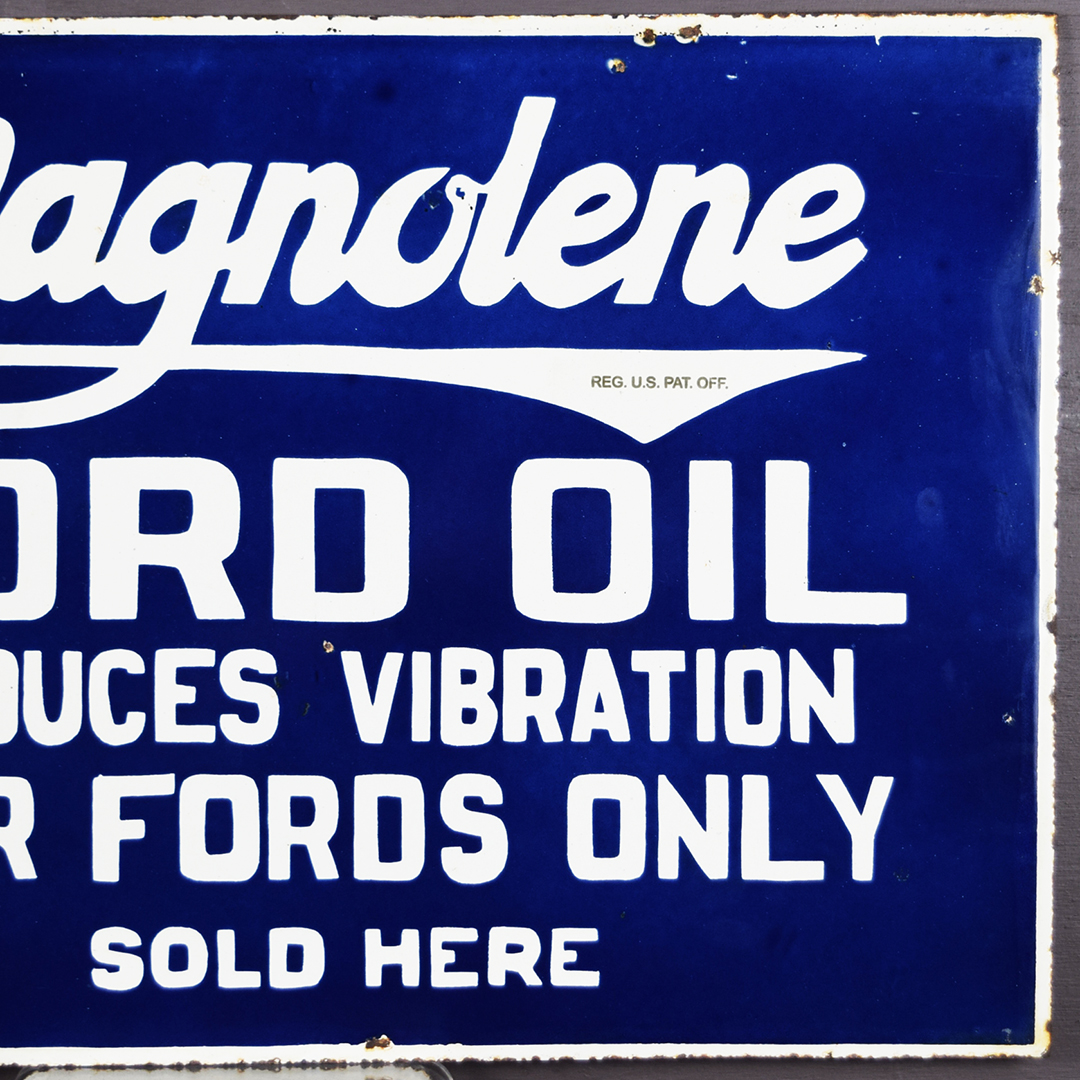 Dating from the 1930s, this Magnolene Ford Oil flange is double-sided and features a glossy porcelain finish on each side. The oil was designed for Ford products only and was intended to reduce engine vibrations. It measures 16 inches tall by 22.5 inches wide with a 2.25-inch flange on the side. The colors pop nicely on this flange, with nice porcelain shelving on each side. Minor chips are visible on each side, with no touch-up applied, and there are minor chips around the outer edges as well. Larger porcelain chips are visible inside the curved flange area and on the opposite side. 21581-QEWP