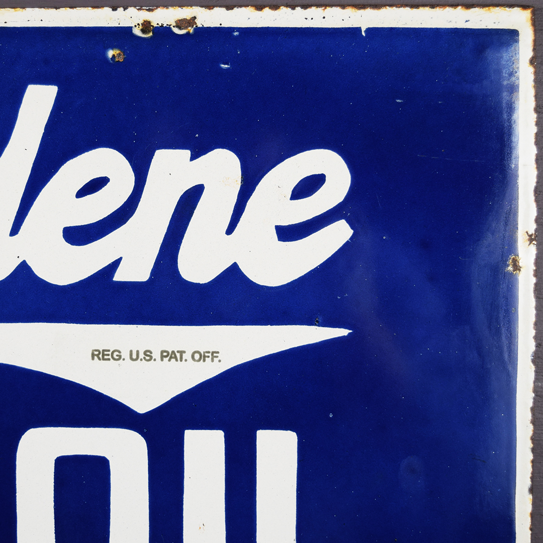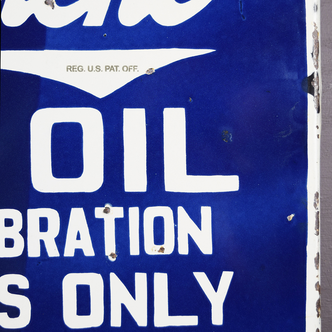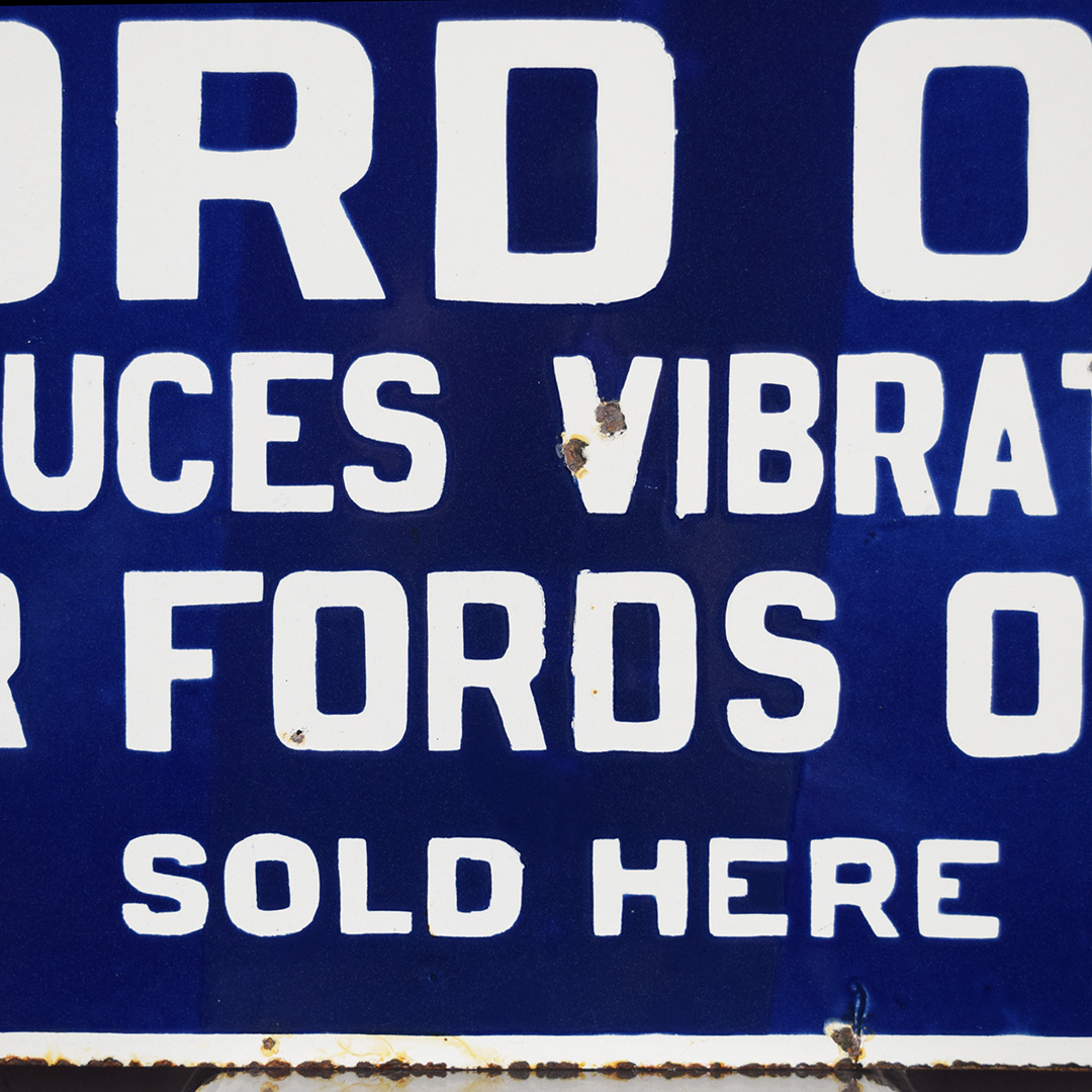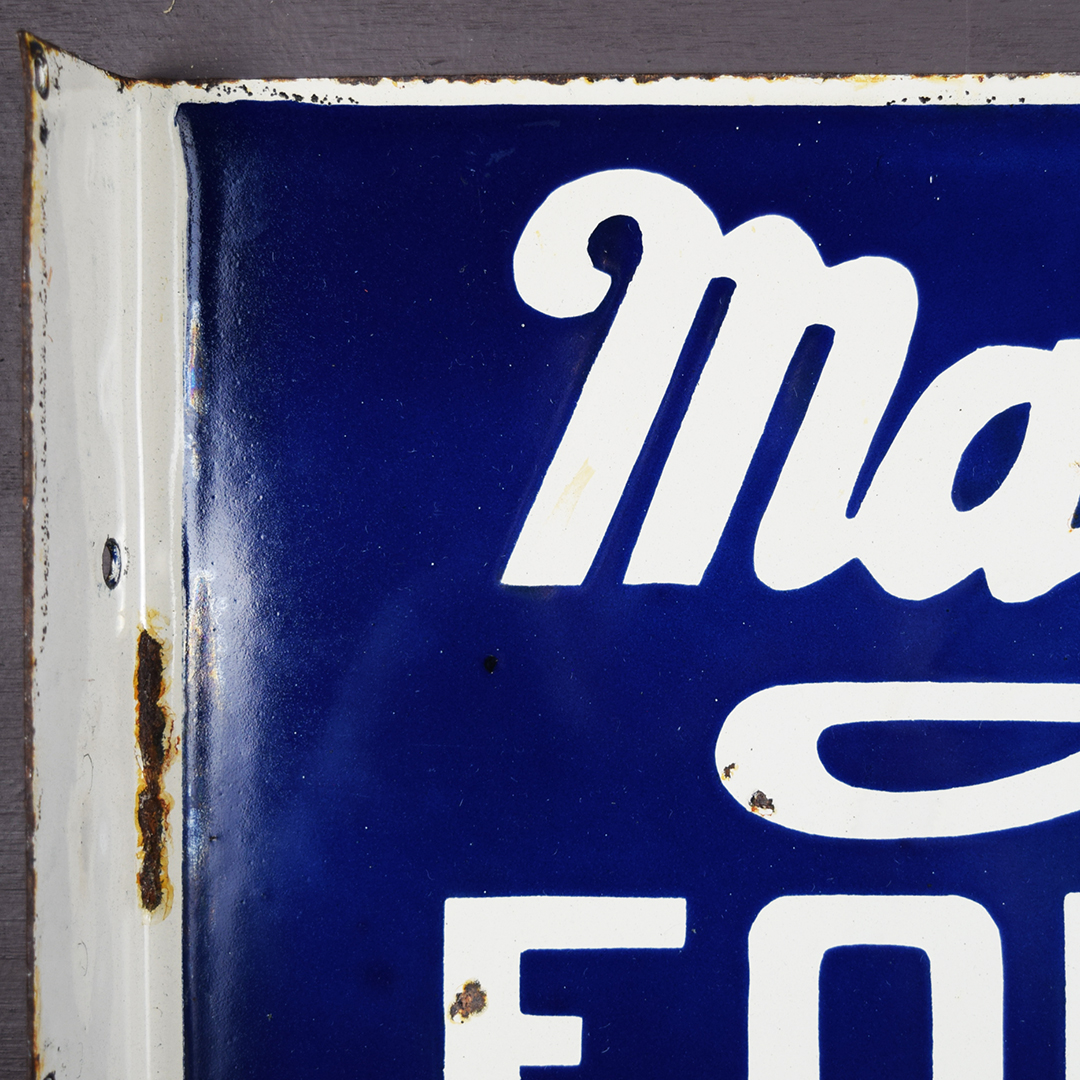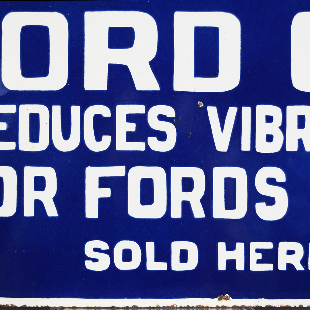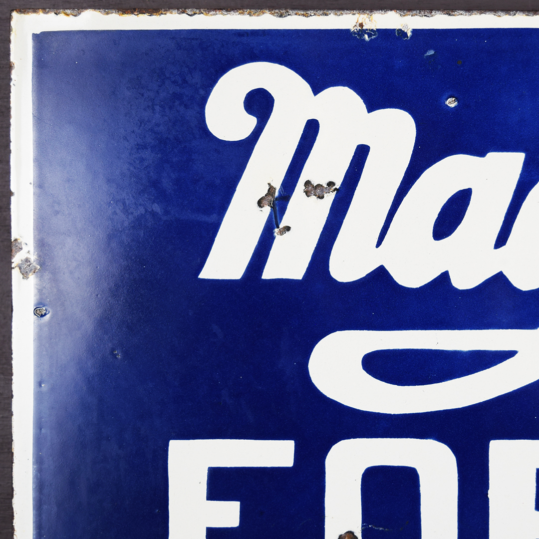 Dating from the 1930s, this Magnolene Ford Oil flange is double-sided and features a glossy porcelain finish on each side. The oil was designed for Ford products only and was intended to reduce engine vibrations. It measures 16 inches tall by 22.5 inches wide with a 2.25-inch flange on the side. The colors pop nicely on this flange, with nice porcelain shelving on each side. Minor chips are visible on each side, with no touch-up applied, and there are minor chips around the outer edges as well. Larger porcelain chips are visible inside the curved flange area and on the opposite side. 21581-QEWP