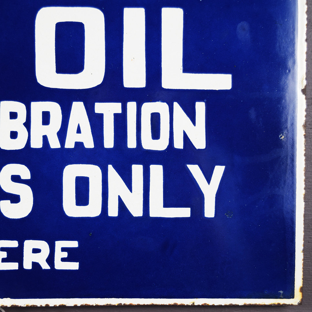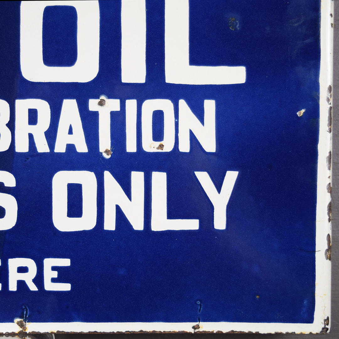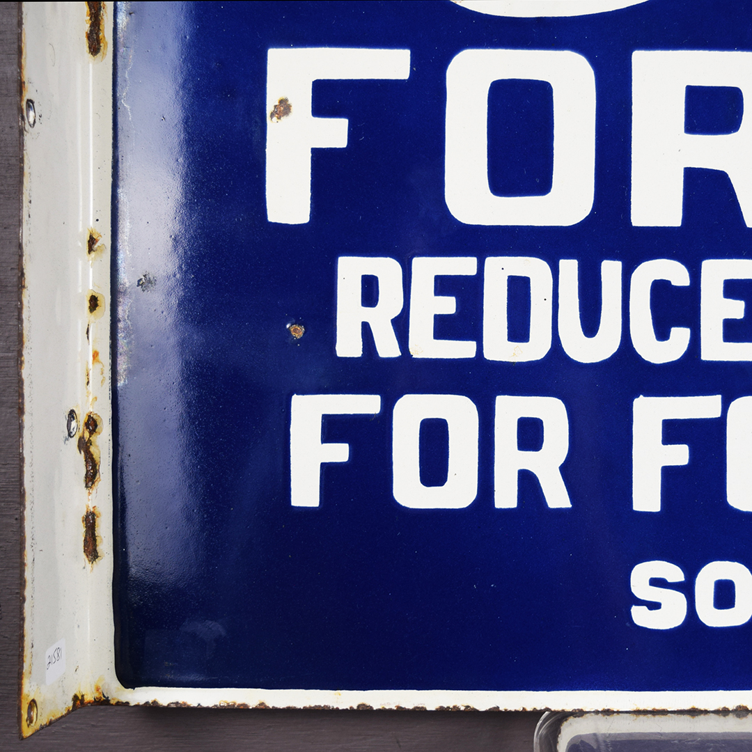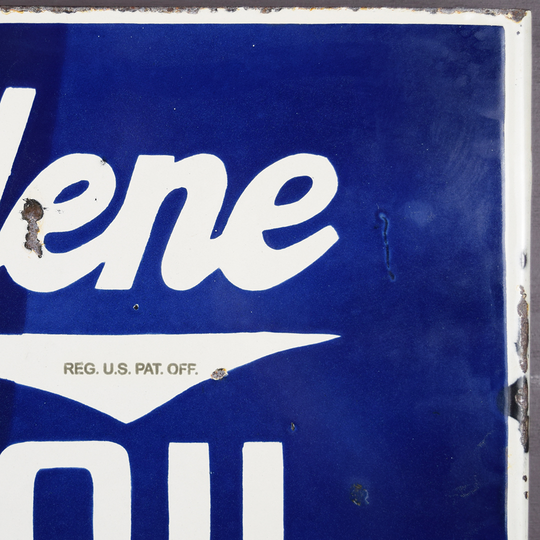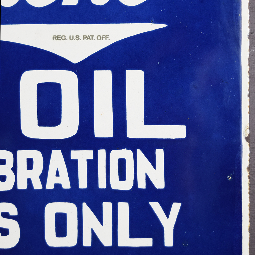 Dating from the 1930s, this Magnolene Ford Oil flange is double-sided and features a glossy porcelain finish on each side. The oil was designed for Ford products only and was intended to reduce engine vibrations. It measures 16 inches tall by 22.5 inches wide with a 2.25-inch flange on the side. The colors pop nicely on this flange, with nice porcelain shelving on each side. Minor chips are visible on each side, with no touch-up applied, and there are minor chips around the outer edges as well. Larger porcelain chips are visible inside the curved flange area and on the opposite side. 21581-QEWP
