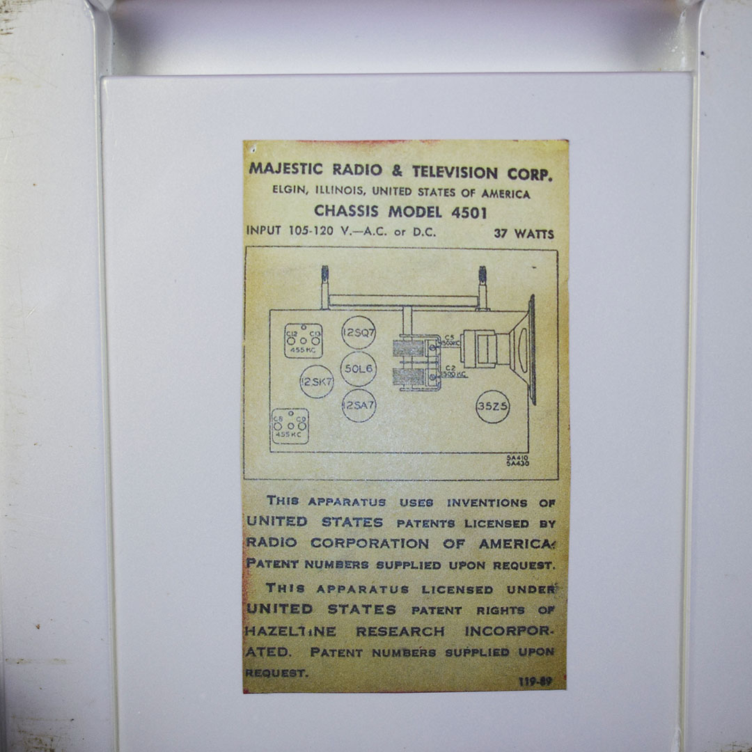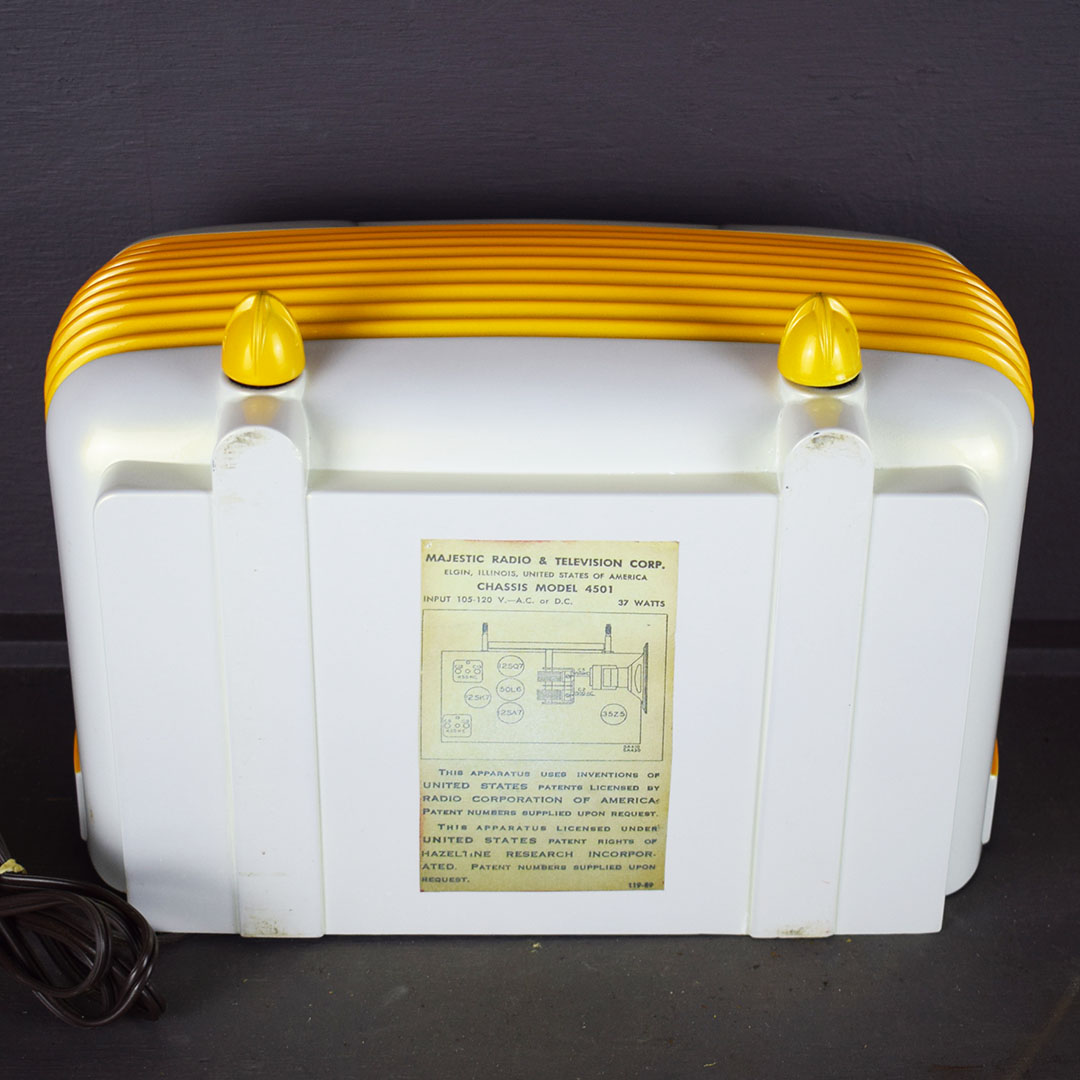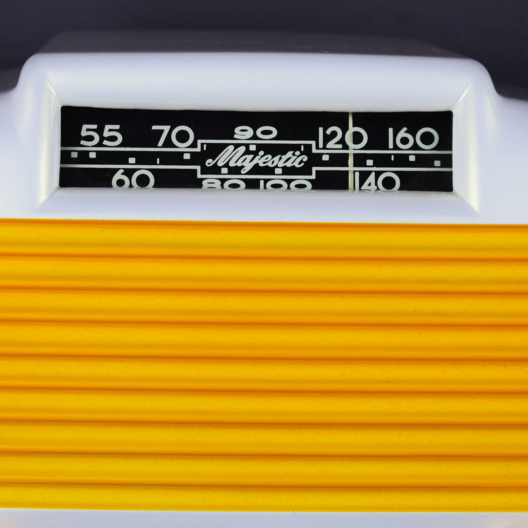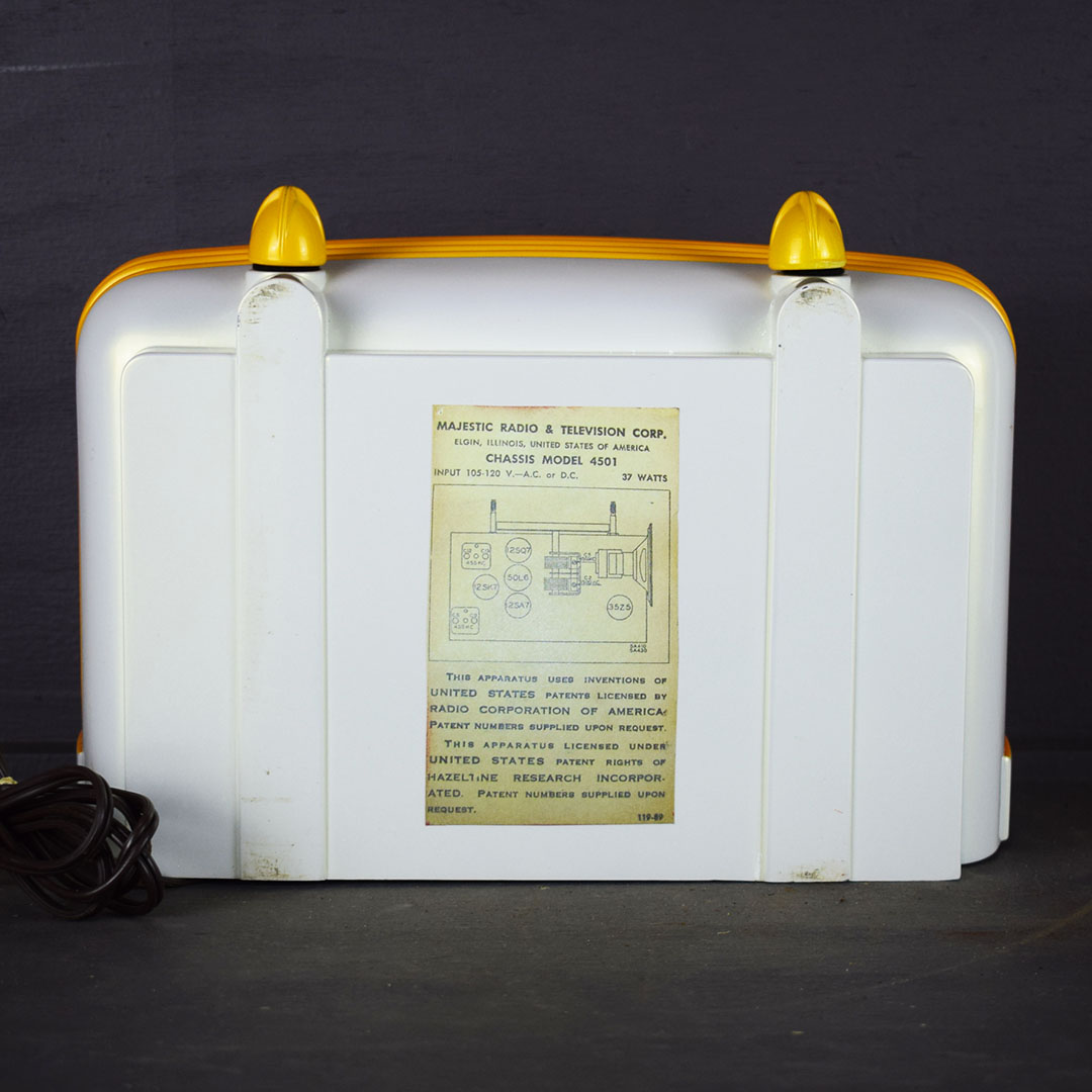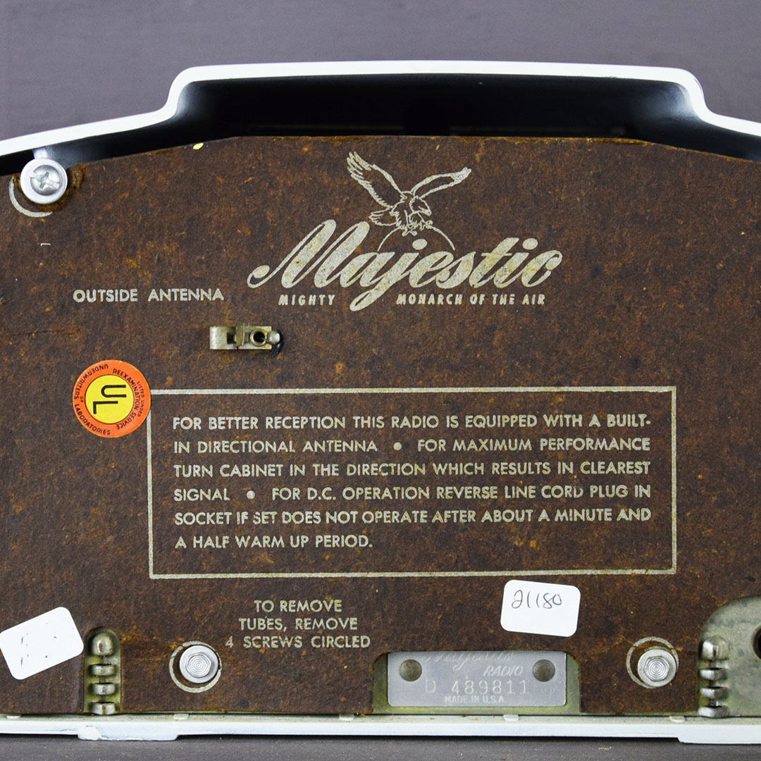 Before TV became the norm in every house in America, people received their entertainment and news from AM Radios. This Majestic Bakelite Zephyr AM Radio oozes art deco style with spectacular colors on the case itself. The pearl paint colors make this beauty stand out and be eye-catching in your home. Once plugged in and warmed up, it plays nicely and provides ample volume. Each knob has a few minor chips, along with some slight scuffs on the base. The original cardboard backer is on the back of the unit, and the schematic decal is on the base. 21180-WPP
