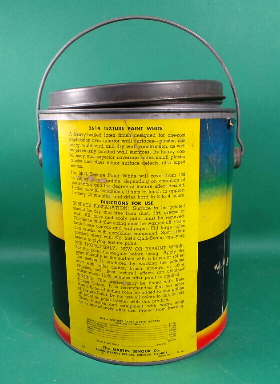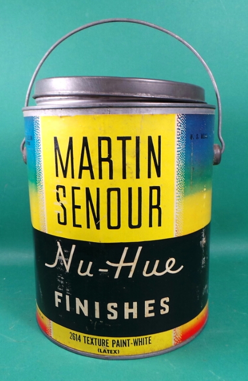This clean one gallon bail handled paint can dates from the 1950’s. It has a colorful paper label inscribed “Martin Senour Nu – Hue Finishes 2614 Texture Paint – White (Latex).” The can is complete with the lid and is in excellent condition with light scuffing and a couple of small tears on the label. This can has never had paint and I assume it was used in a store display. Very colorful and unusual. It measures eight and a quarter inches tall by six and a half inches in diameter. 9829-WT