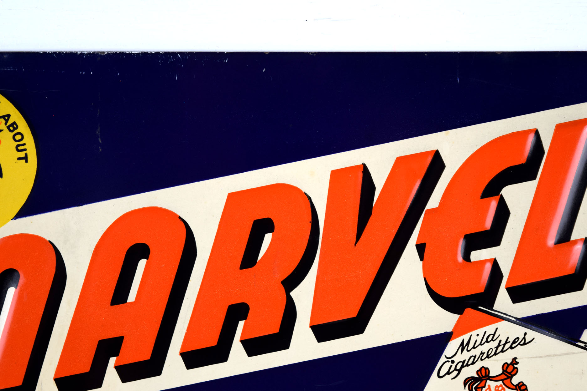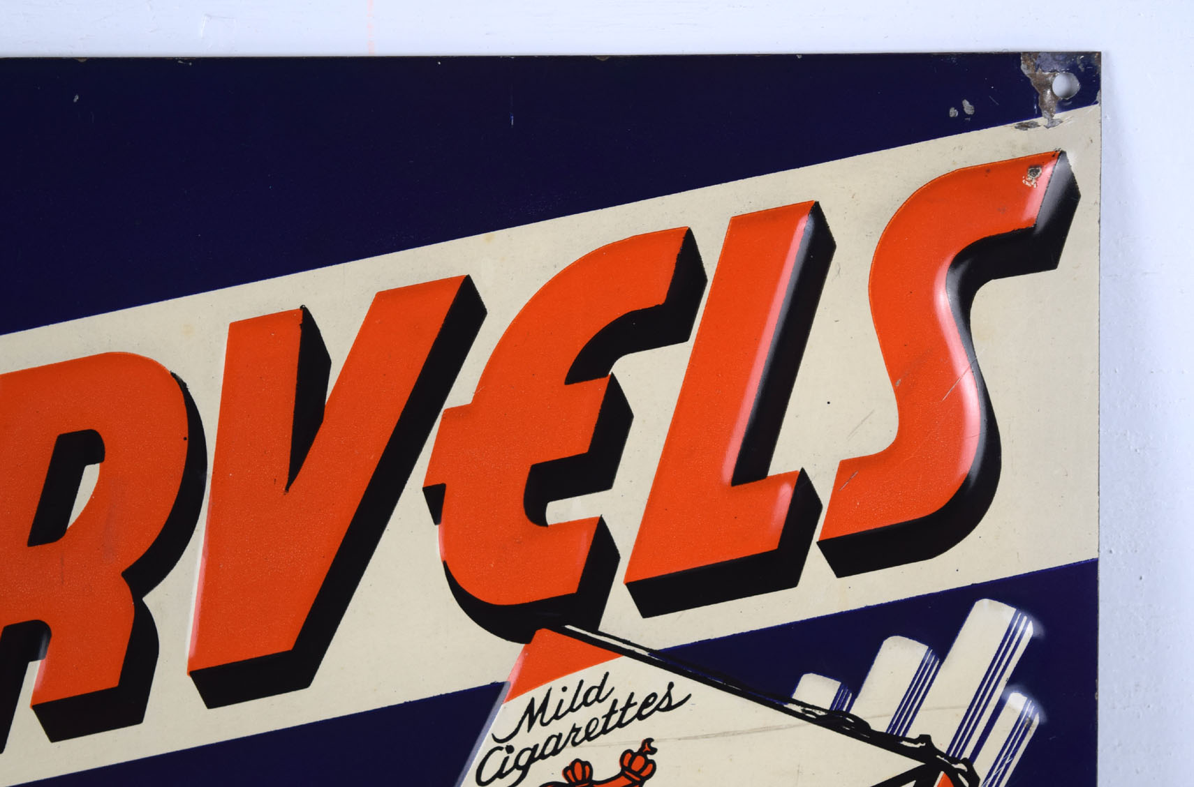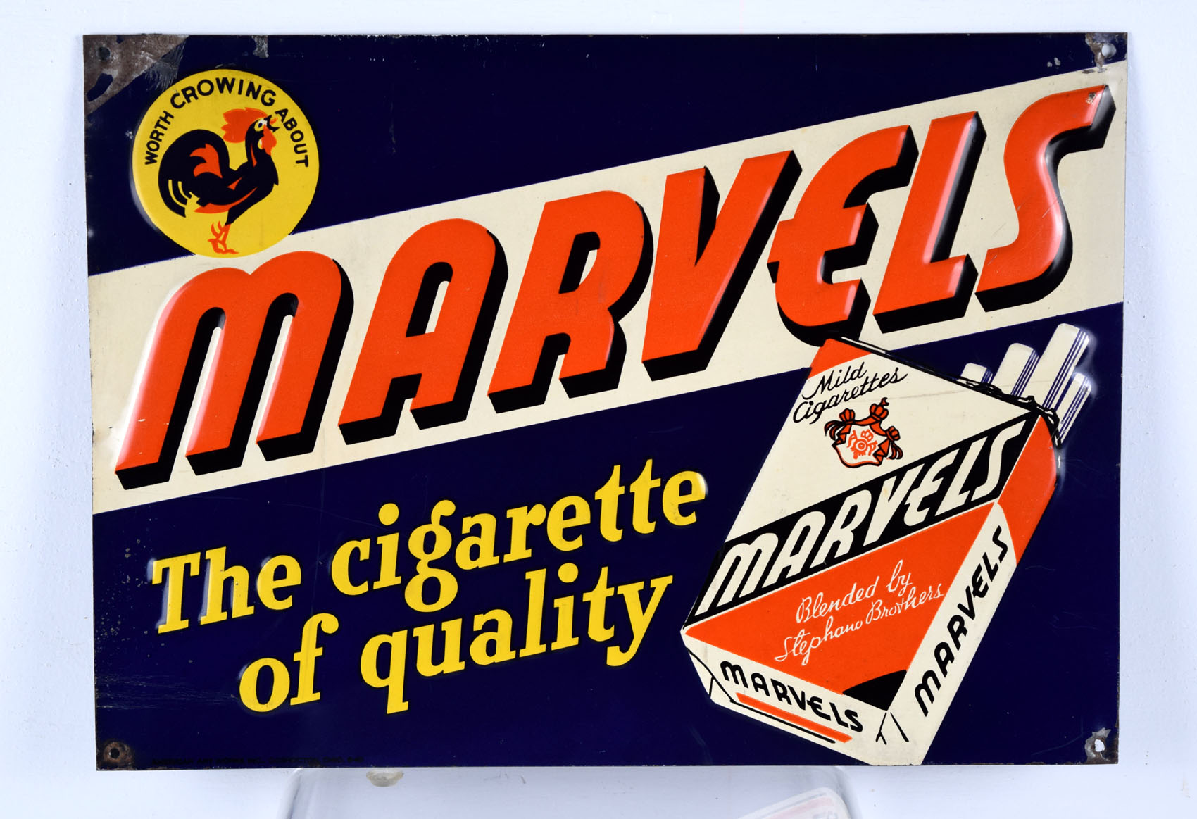 It is hard to find vintage tobacco signs, especially in this size! Measuring 9.75 inches tall by 13.75 inches wide, this Marvels Mild Cigarettes sign comes to us from the 1930’s and is in excellent shape! The letters on the sign are embossed, as is the pack of cigarettes, and the circle in the upper left corner. Inside the circle is a rooster with “Worth Crowing About” above him. The orange Marvels letters have a black drop shadow and are on a white background. “The cigarette of quality” is in yellow and stands out nicely against the blue background. It has a mounting hole in each corner, and all of the corners have some minor paint loss and some bends. The lower left corner has a horizontal bend that has cracked the paint, along with some chipping. A few scratch marks are visible up close. Super rare sign to find! 19034-WTP