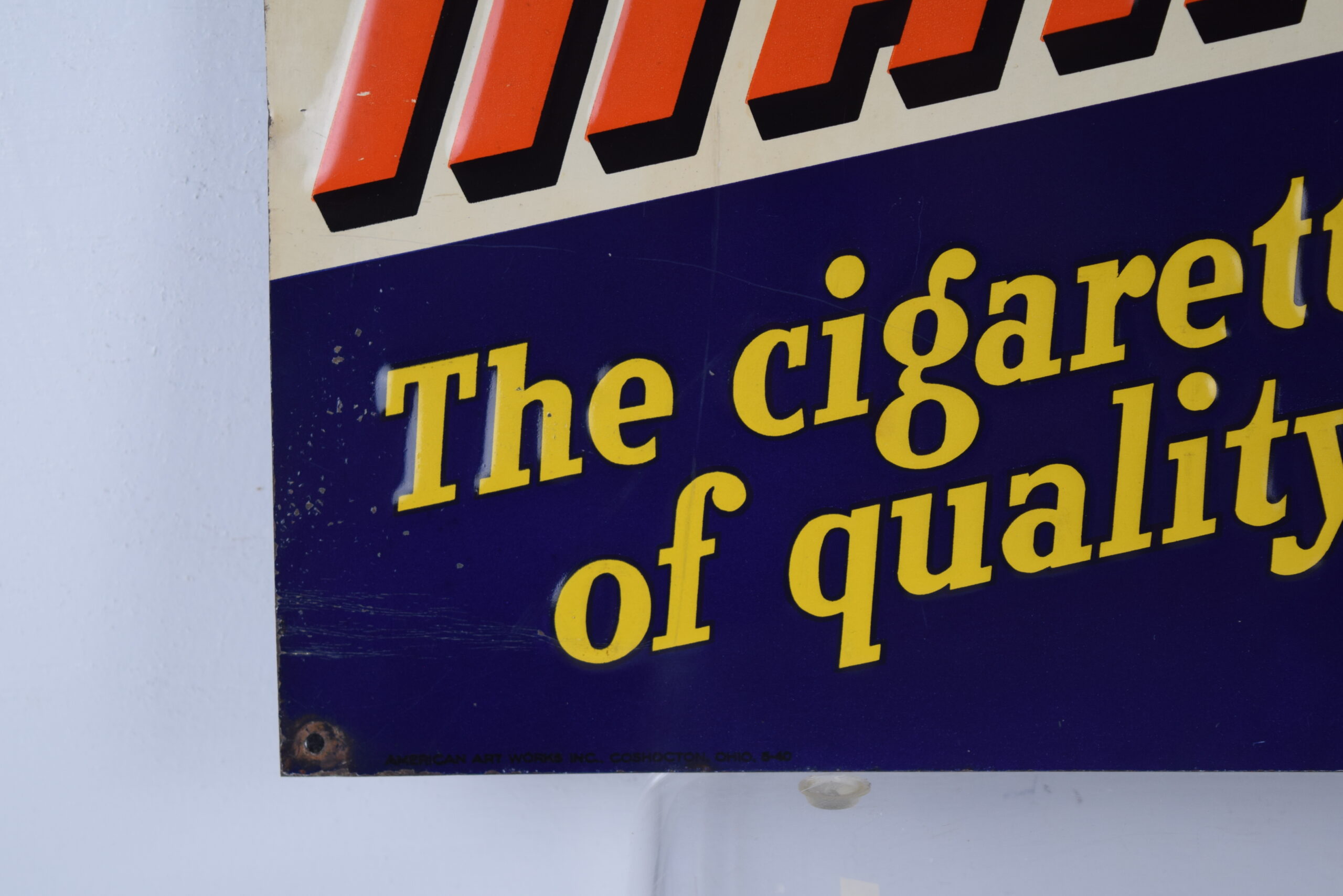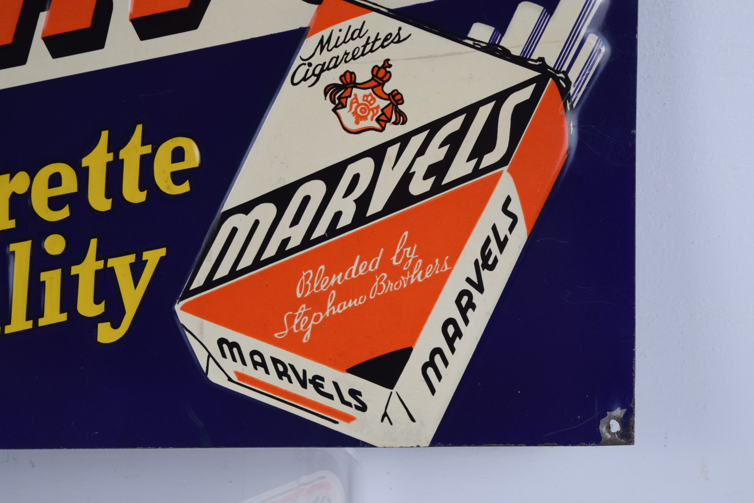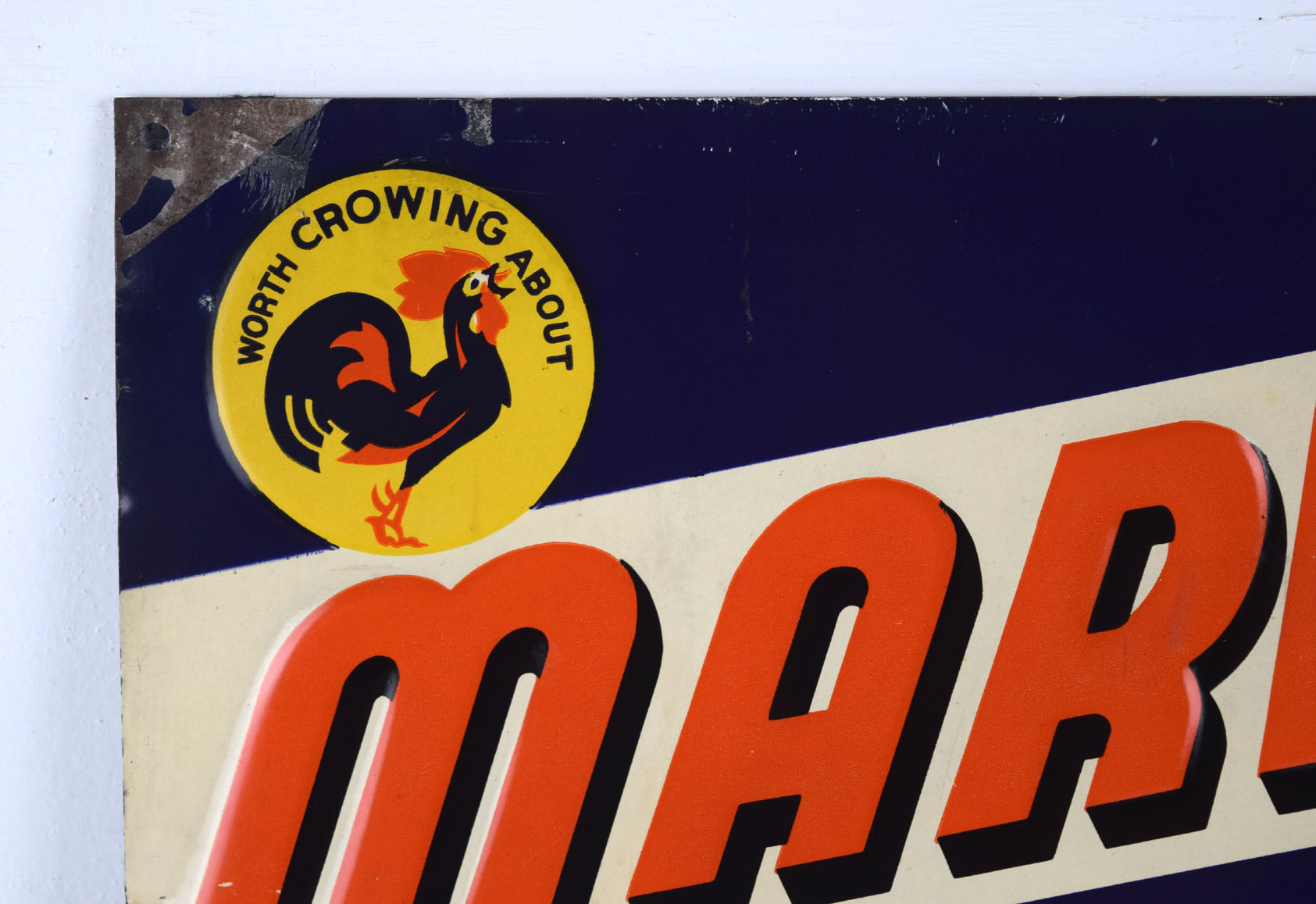 It is hard to find vintage tobacco signs, especially in this size! Measuring 9.75 inches tall by 13.75 inches wide, this Marvels Mild Cigarettes sign comes to us from the 1930’s and is in excellent shape! The letters on the sign are embossed, as is the pack of cigarettes, and the circle in the upper left corner. Inside the circle is a rooster with “Worth Crowing About” above him. The orange Marvels letters have a black drop shadow and are on a white background. “The cigarette of quality” is in yellow and stands out nicely against the blue background. It has a mounting hole in each corner, and all of the corners have some minor paint loss and some bends. The lower left corner has a horizontal bend that has cracked the paint, along with some chipping. A few scratch marks are visible up close. Super rare sign to find! 19034-WTP