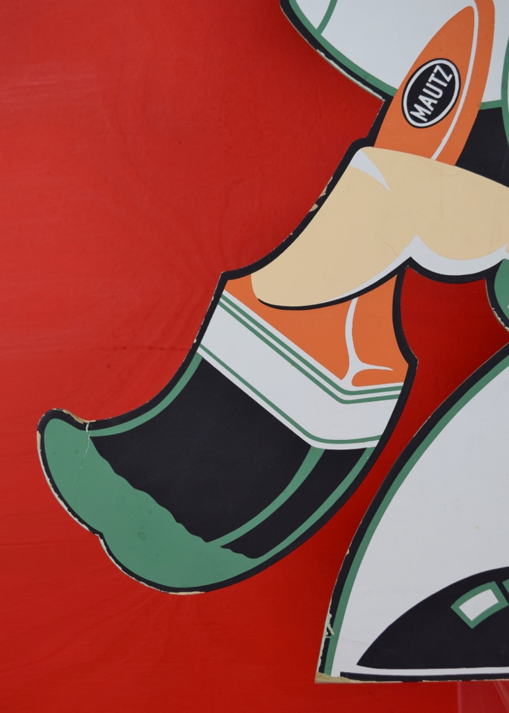 Perfect for your country store display, this Mautz Paint die cut easel back cardboard display sign stands twenty-seven and a half inches tall by twenty inches wide. This sign is made of medium gauge cardboard and is die cut around the outer edges. Some minor wear can be seen on the outer edges and in various places on the cardboard graphics. Two small bends are on his hand and paintbrush. The easel back has separated slightly from the top and has been taped. Great colors and nice graphics on this seldom seen piece 2061-TP