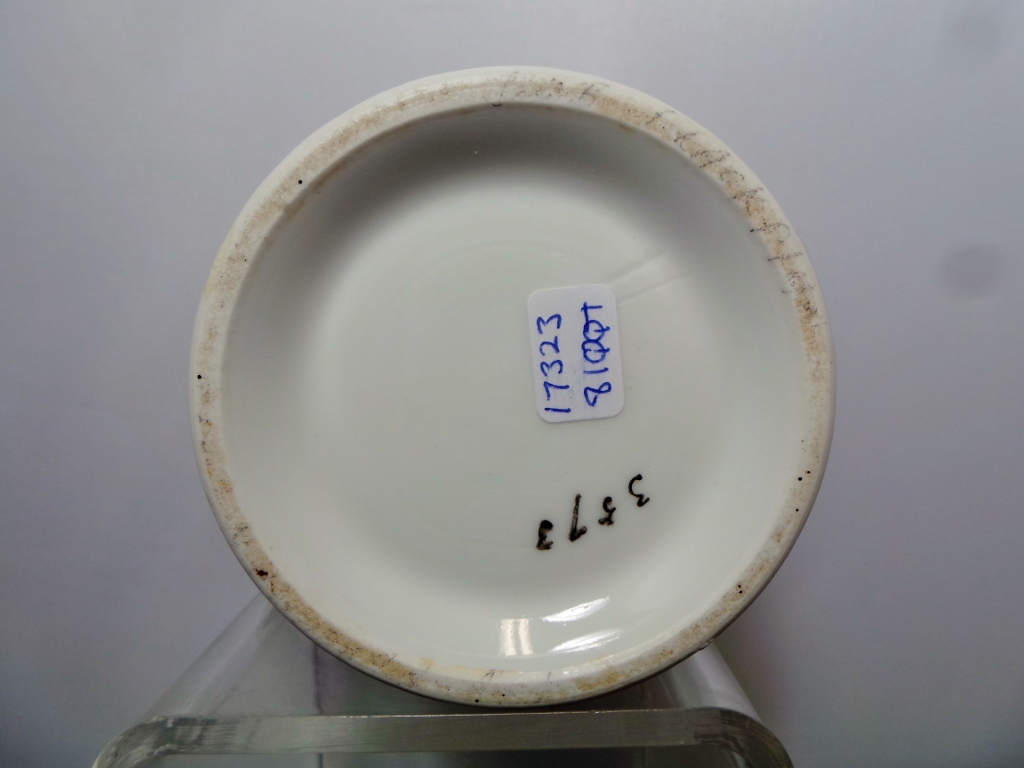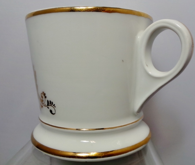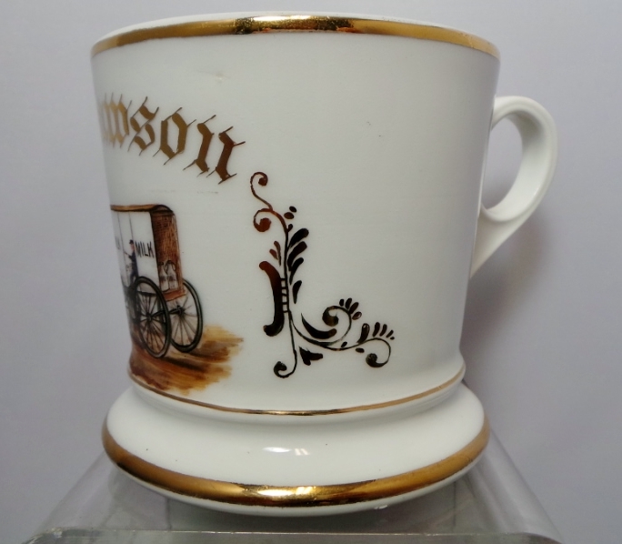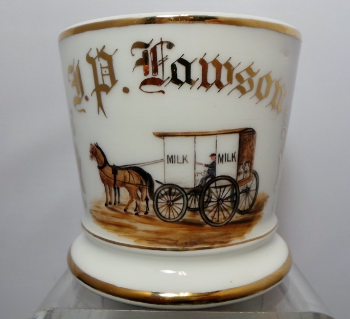 Back in the late 19th and early 20th centuries, when a gentleman needed a shave, he visited his local barbershop, where the barber kept each customer’s shaving mug, inscribed with his name and often decorated with an image related to his occupation, in a cabinet. This example, inscribed “J. P. Lawson” in gold letters above an image of a horse drawn milk wagon, indicates that he was a milkman. The shaving mug measures 3 3/8 inches tall by 3 1/2 inches in diameter and is in near mint condition. 17323-81QQT