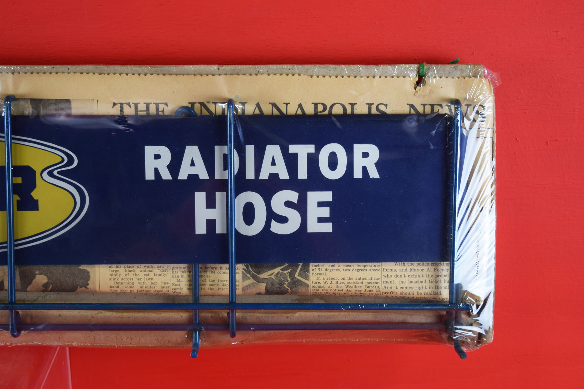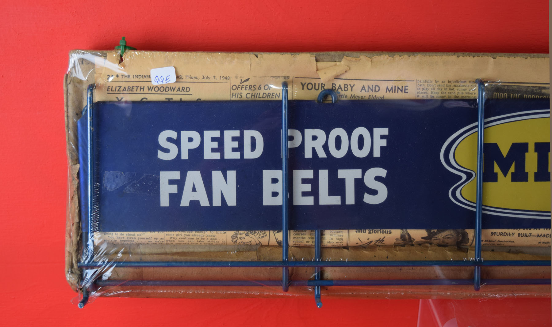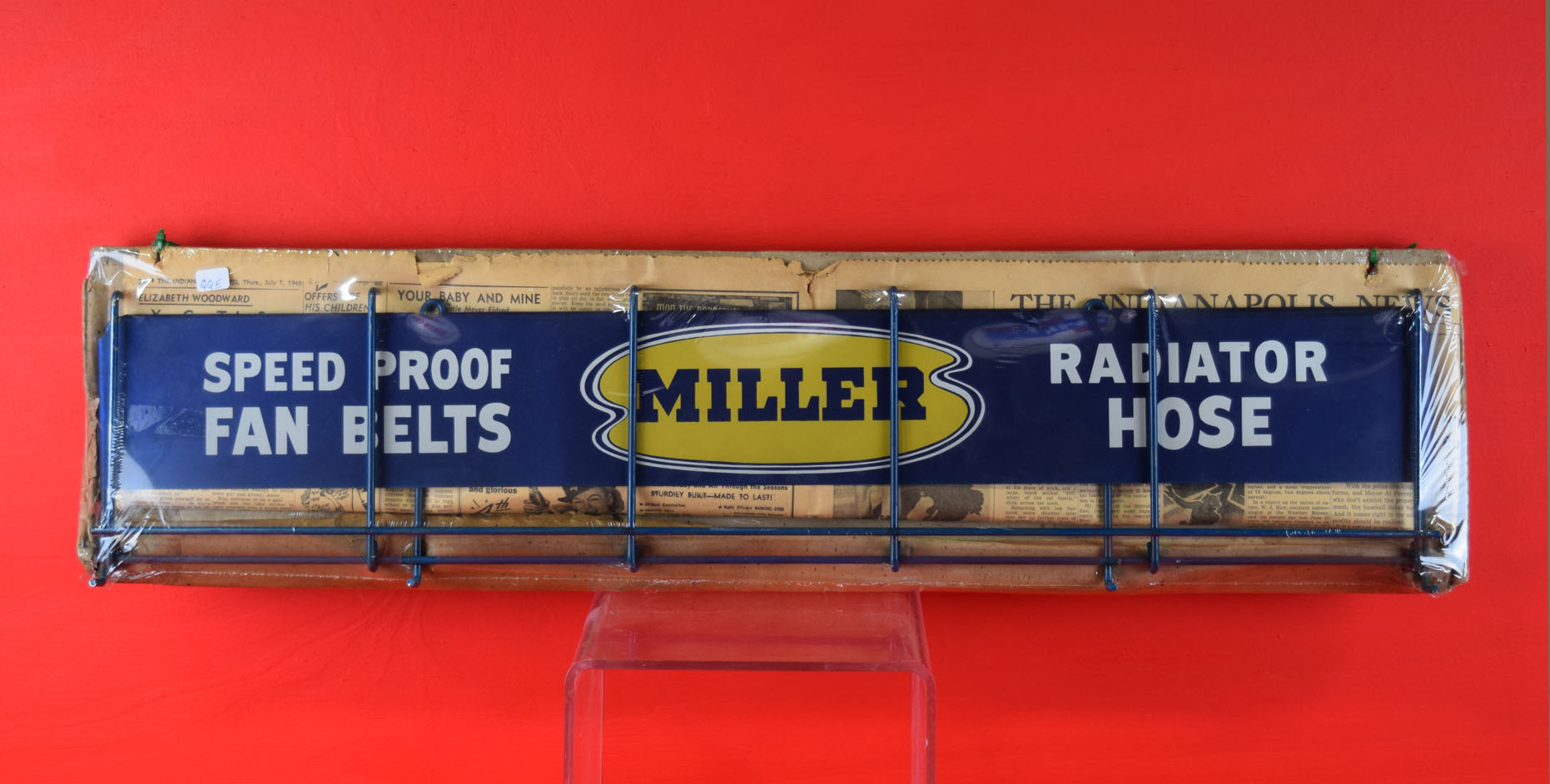 Walk into any parts store in the 1940’s to 1960’s and you may have seen one of these metal display racks hanging on the back wall with plenty of fan belts and radiator hoses hanging from it. Back in those days there was not multiple options on vehicles and one fan belt fit many different vehicles. Same goes with radiator hoses, plus it a hose was an inch too long, you just trimmed it to fit! This Miller rack appears to be new old stock with the original cardboard box that it arrived in. A previous owner wanted to make sure the box stayed with the rack, so they sealed both pieces in plastic to keep them together. Over the years the metal ends have poked out of the plastic and have some minor chips on them, and we see a small chip on the right upper part of the sign. Great piece of history that you can display or keep sealed! 18975-QQE