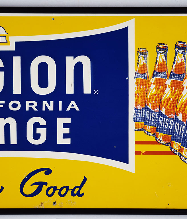 Super colorful and ready for your wall, this beautiful embossed Mission Orange soda sign features seven cascading full bottles of Mission Of California orange soda for your viewing pleasure. “Naturally Good” is the tag line below the large logo taking up much of the left side of the sign. Sharp colors and great graphics make this beauty a keeper! A few light rust pits can be seen in the lower portion of this 1960’s sign, which was produced by Stout Sign Company, in St. Louis. A simple black frame has been added to give you a perfect way to hang and enjoy this great piece of sign history. 20302-UTP