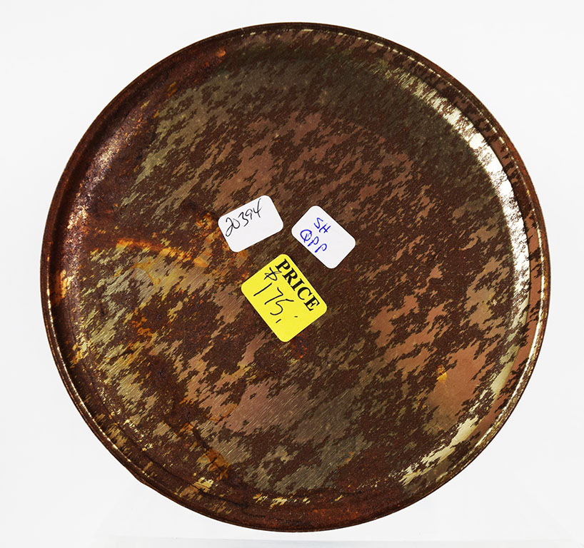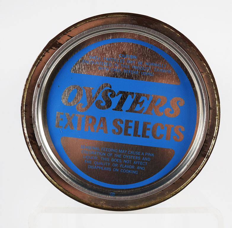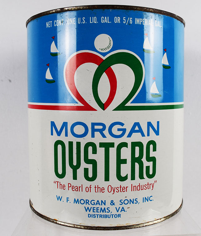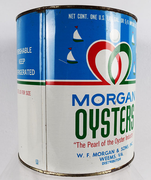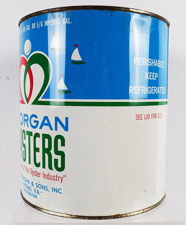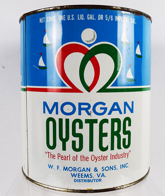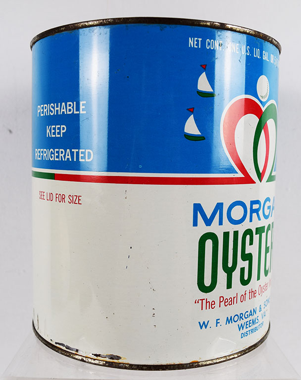 Oyster cans are a nice way to decorate your kitchen or your sitting area. Many different colors and a few different sizes, this metal can once contained a gallon of shucked oysters from W. F. Morgan & Sons, located in Weems, Virginia. The can and lid are in excellent shape, with just some slight paint loss around the bottom and top lip. It is stamped NJ 1 on the side. 20394-QPP