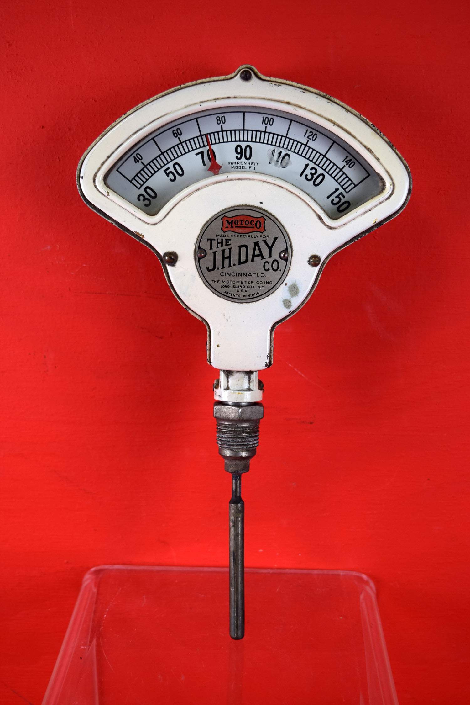 This industrial application Motoco radiator temperature gauge was used in a variety of applications, which let the user know exactly the temperature of the water inside the unit. It is in good shape with some minor chipping on the outer edges, with a mark on the glass at 110 degrees. The finish has two marks on the front with some crazing on the reverse. Super neat piece to collect, or even use if needed! 19935-WWT