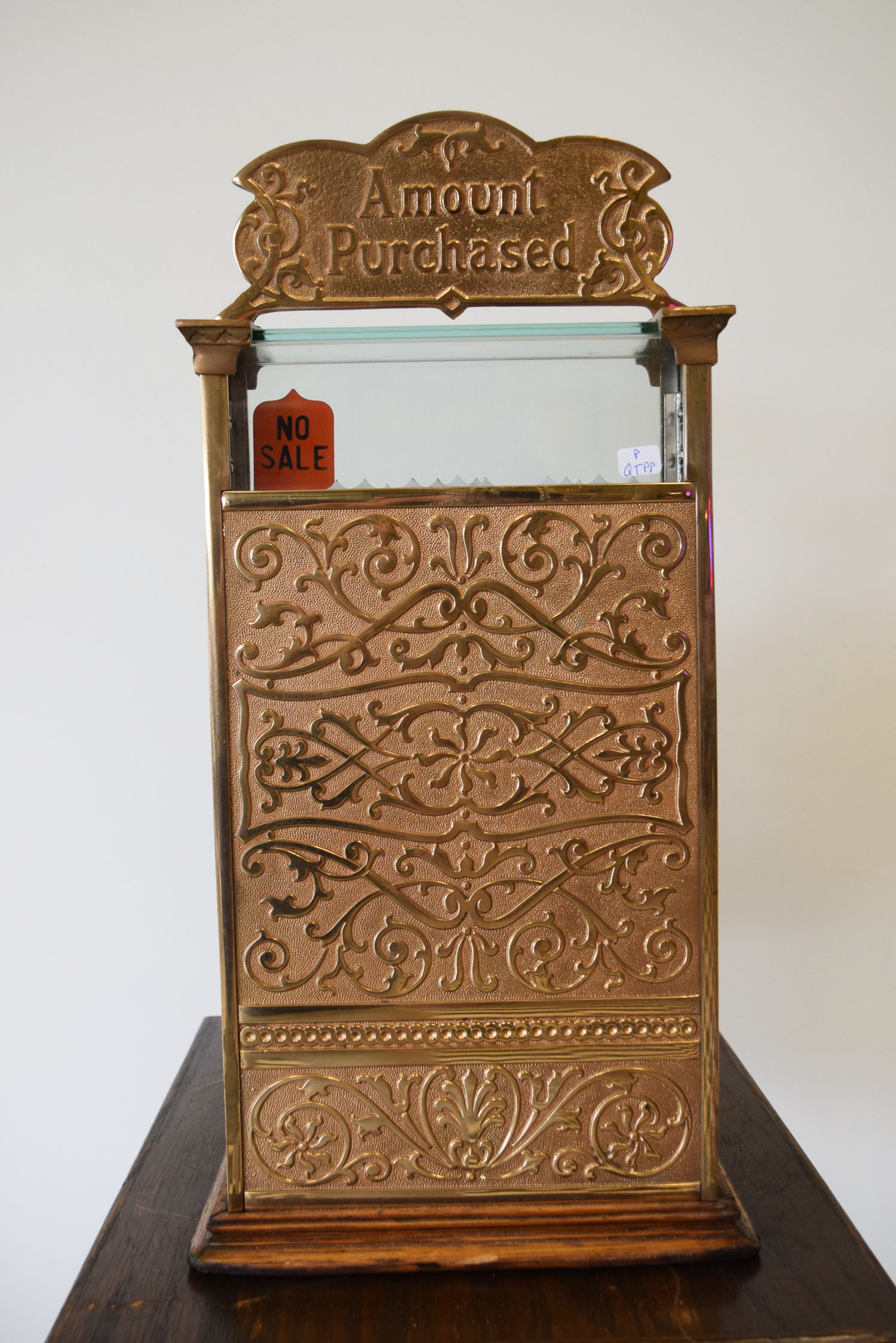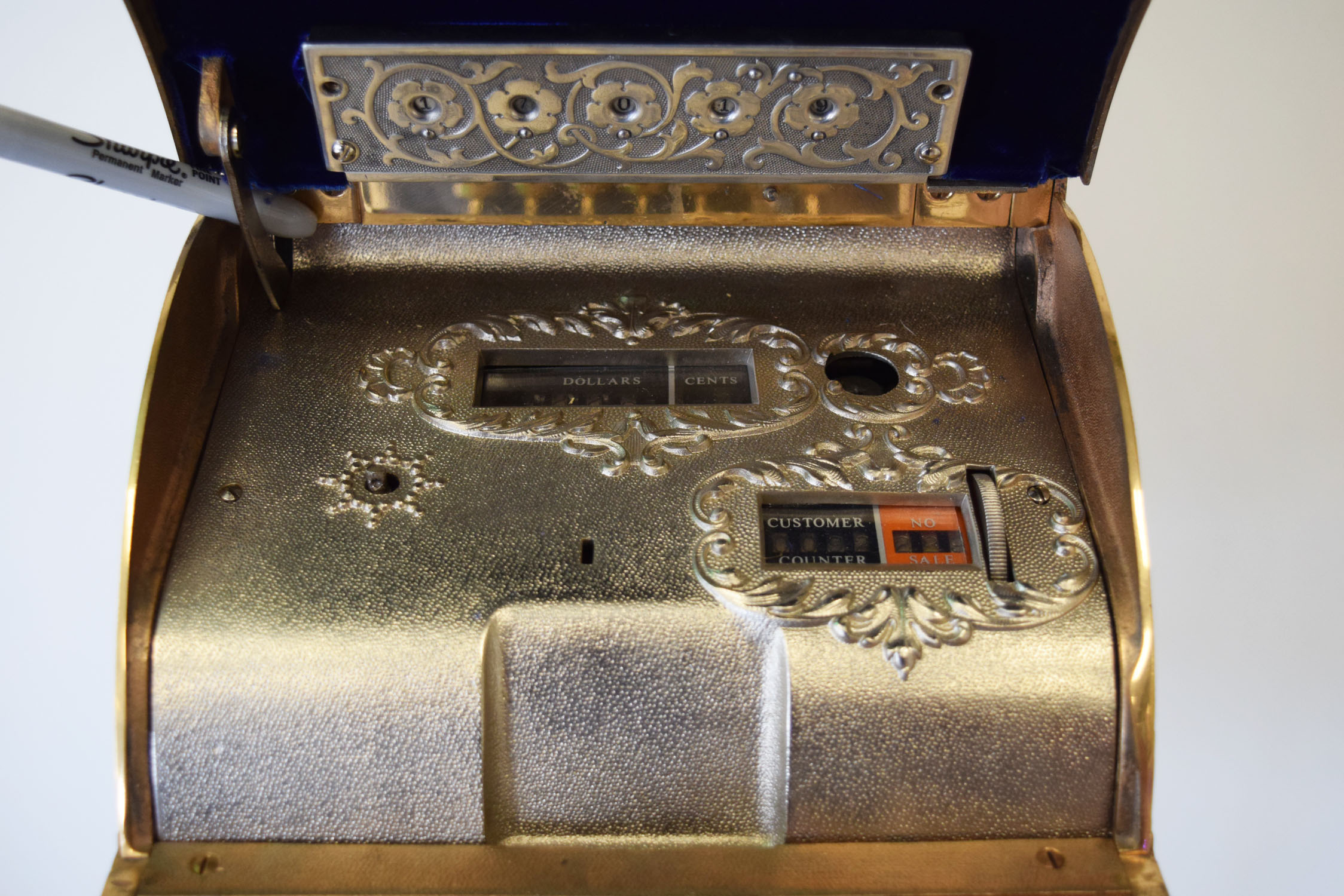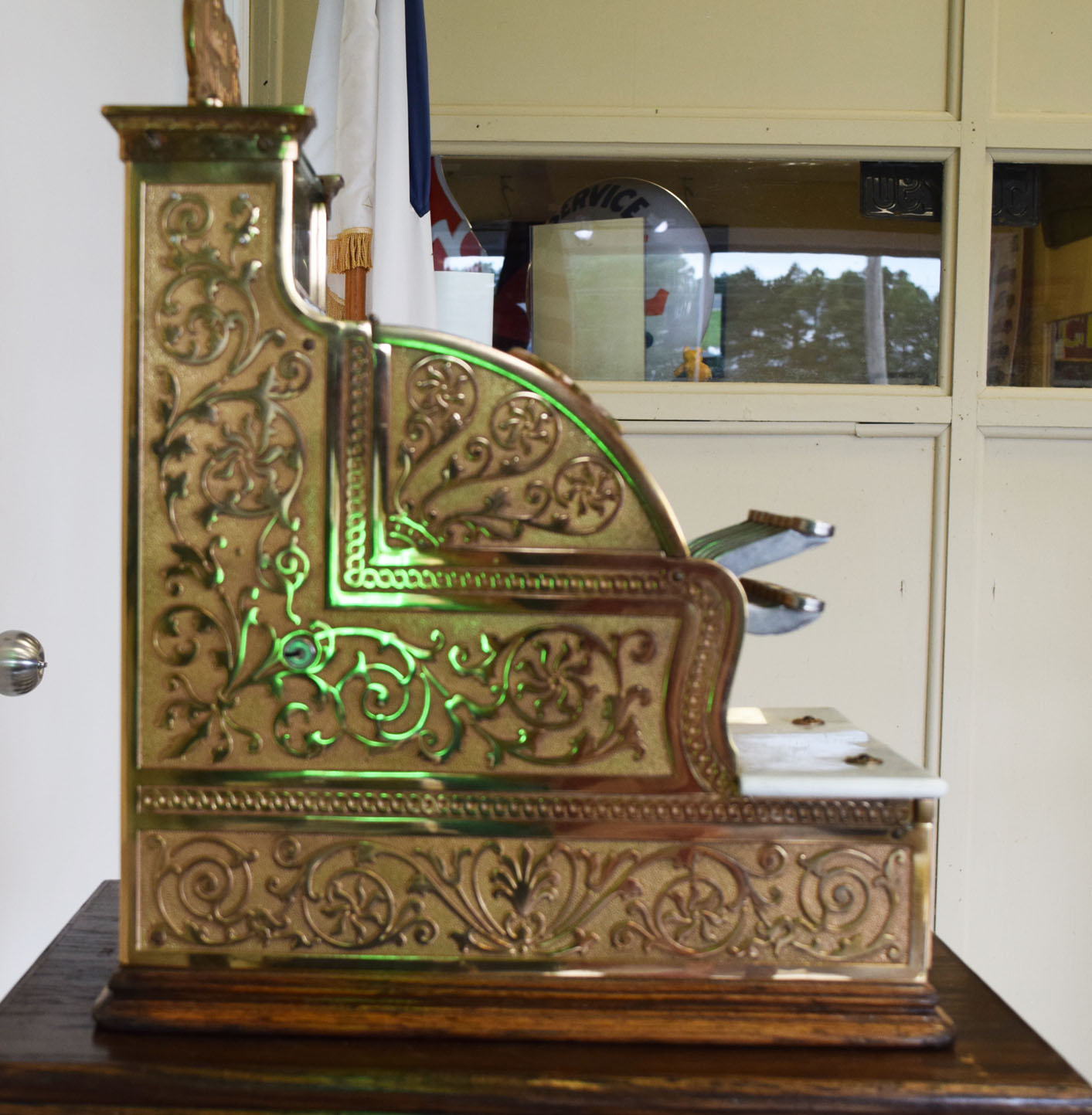 A staple in many general stores in the early 1900’s, this National Cash Register is a model 251 and has the Louisiana state name in the front lift door. We do not have the key, but the lift door is unlocked and you can see the numbers inside. It works as it should, but the keys stick at times. The gold is amazing on this rare piece, and this register has a rare addition as well! The original stand that it sits on is made for this machine, and complete with a brass base that is complete with the National Cash Register logo on it. This item is larger than UPS will allow. Please contact us for shipping or delivery quote. 19740-QTPP