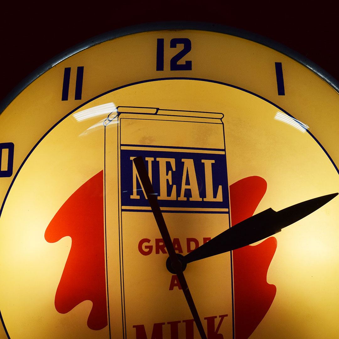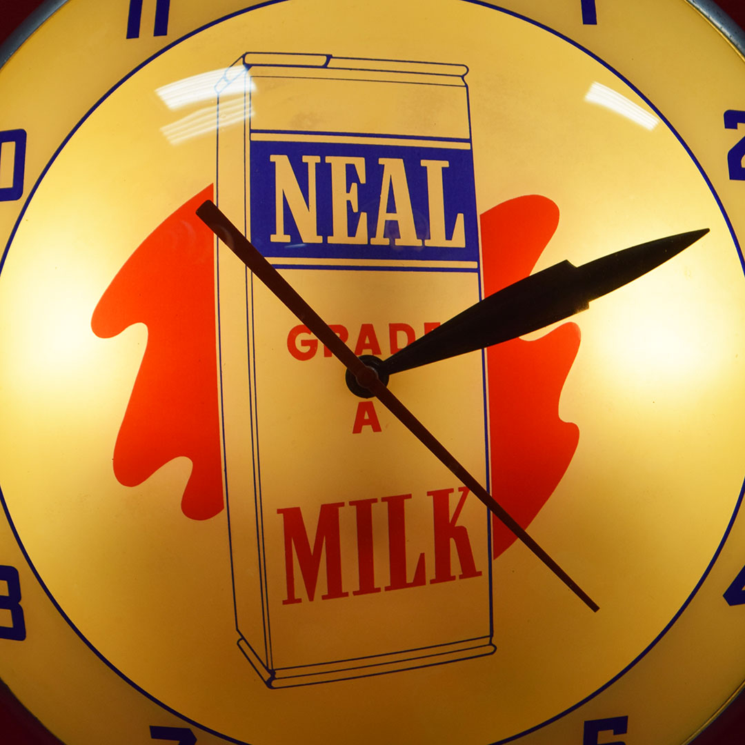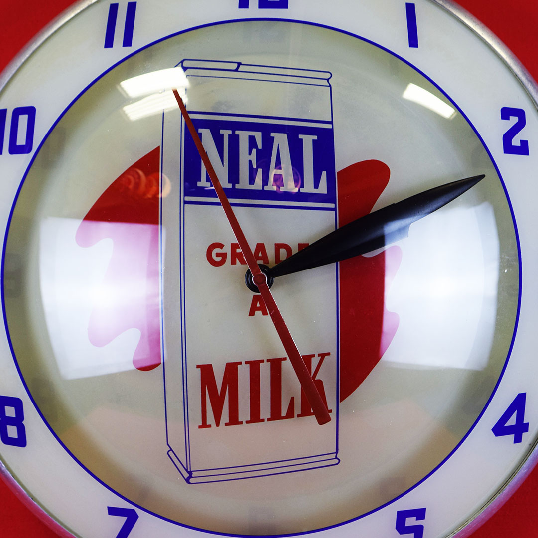 Produced by Advertising Products Inc., this Neal Grade A Milk double bubble glass clock will fit perfectly in your country store setting! Once plugged in, this 15-inch clock lights just as it should and works perfectly. The reverse glass inside shows a carton of Neal Grade A Milk with a red accent behind it. The blue numbers on the outer glass bubble are color-coordinated with the blue on the carton and give this clock a nice look. The metal band around the outer edge is slightly loose but keeps everything together as it should. The outer glass is free of chips and cracks, which gives it a grade of 9.0 out of 10. 20960-YOP