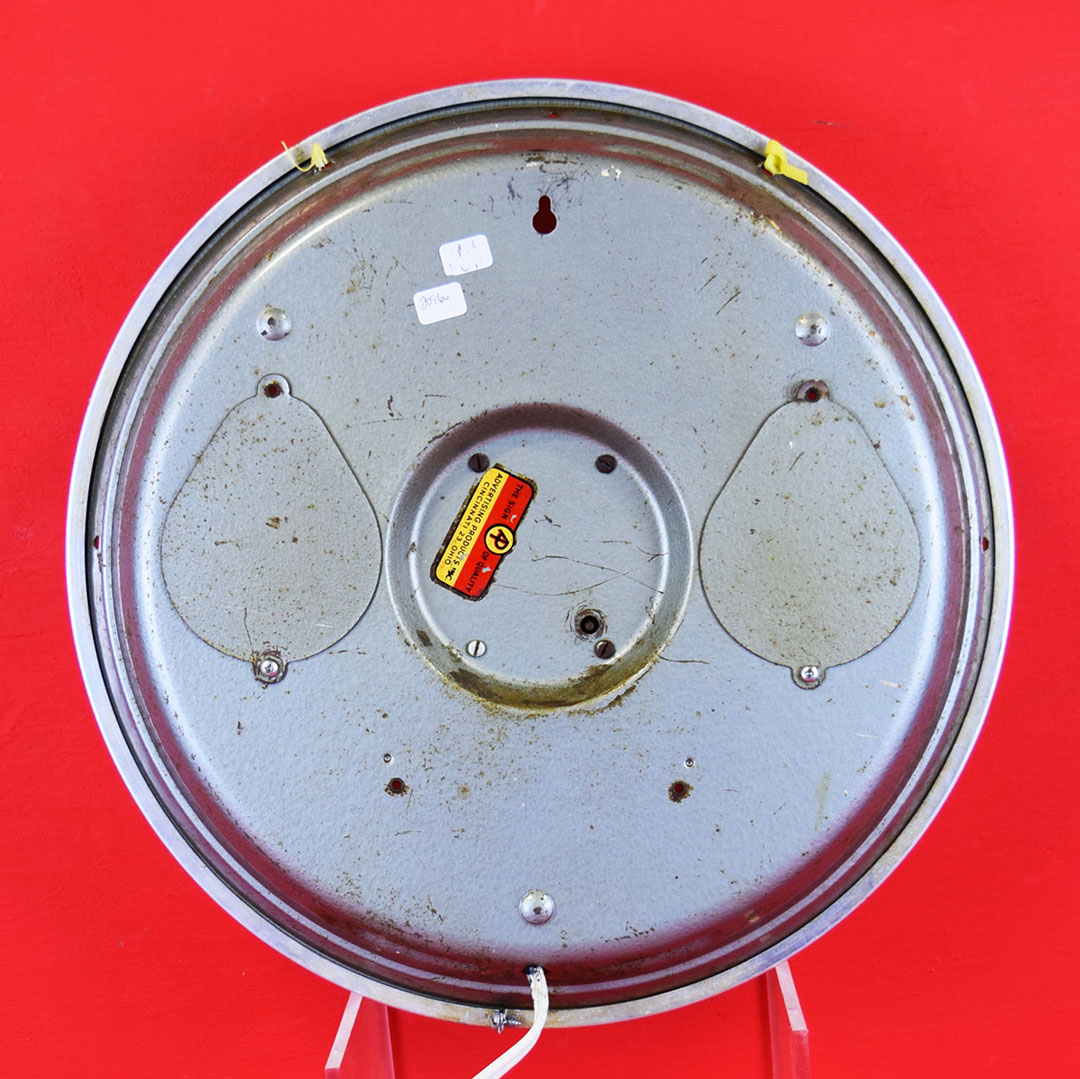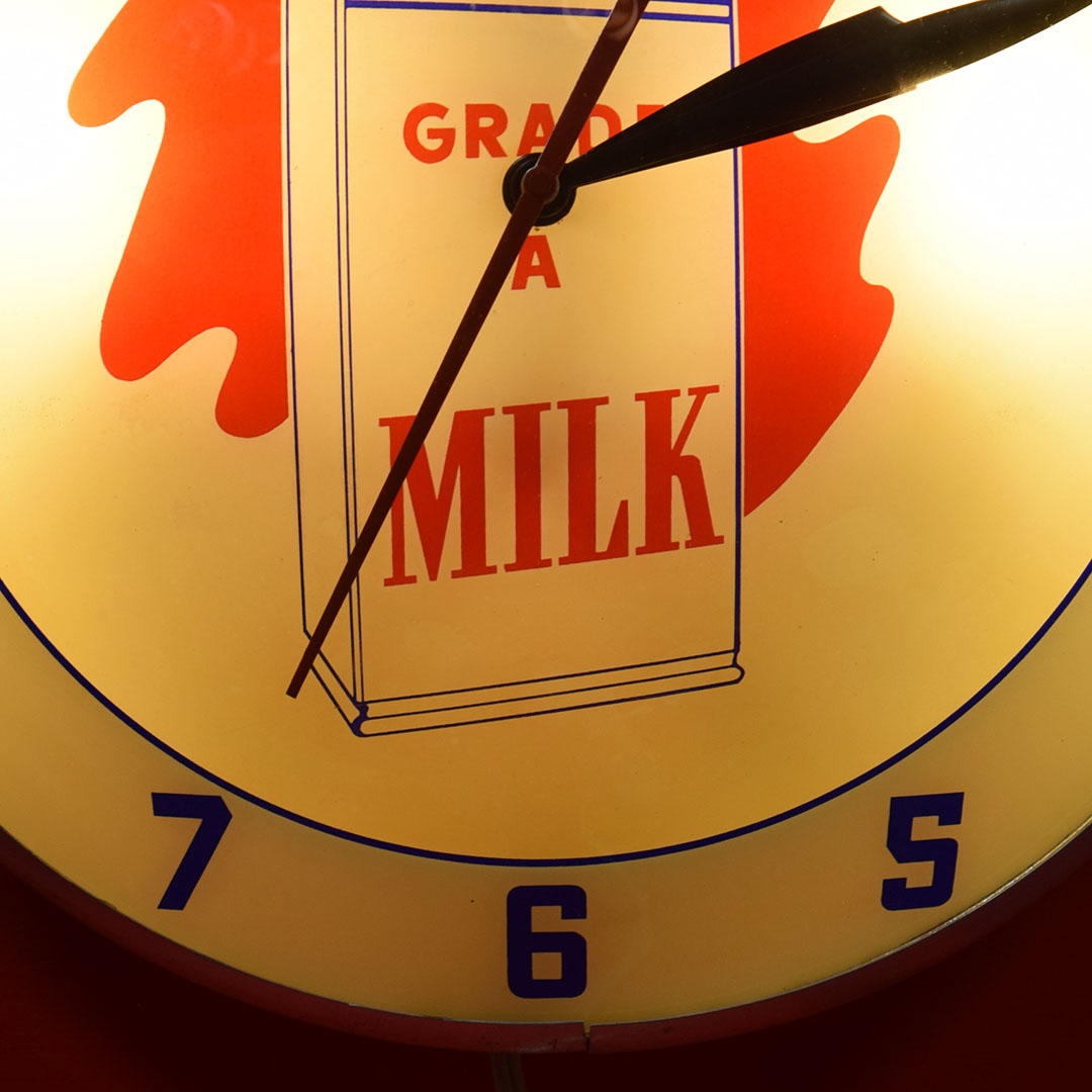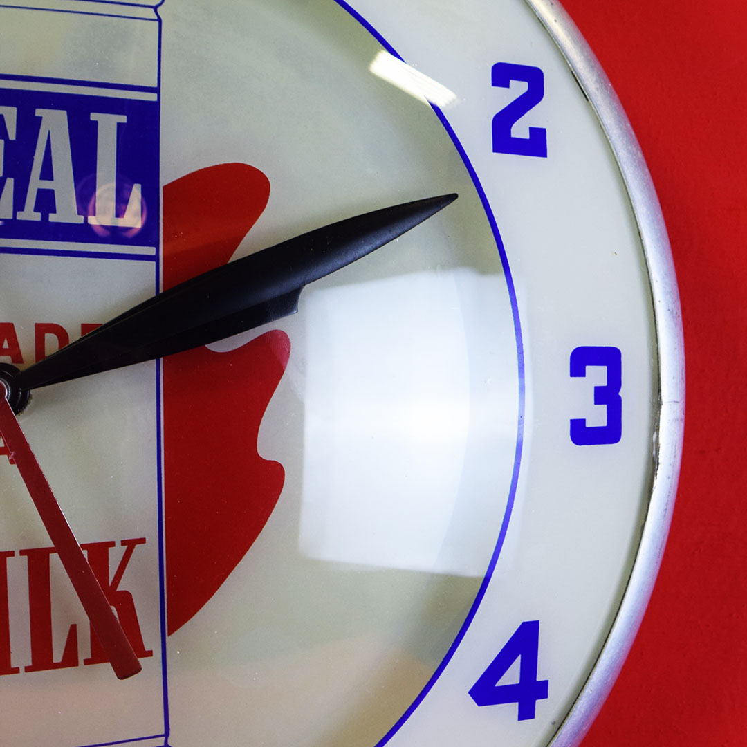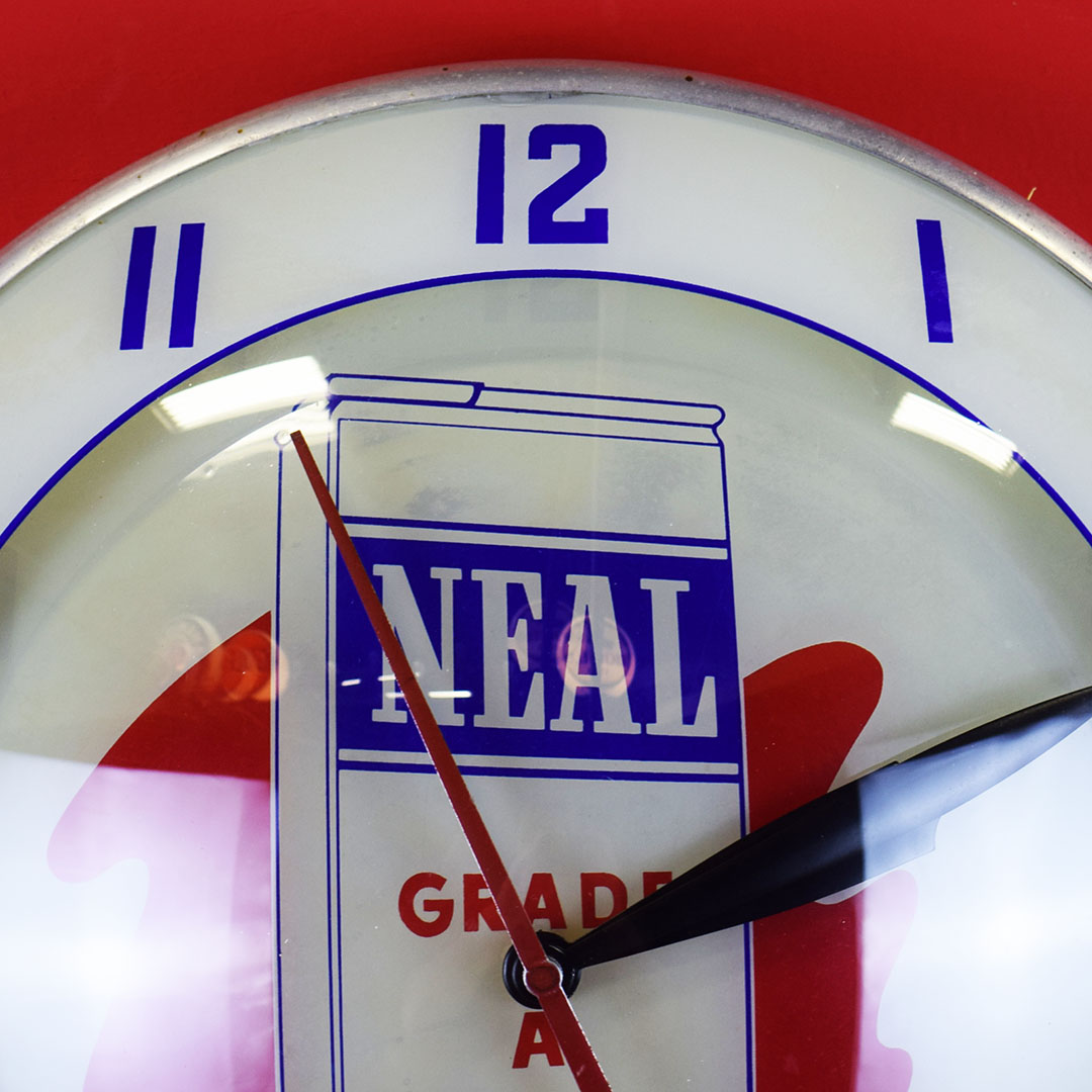 Produced by Advertising Products Inc., this Neal Grade A Milk double bubble glass clock will fit perfectly in your country store setting! Once plugged in, this 15-inch clock lights just as it should and works perfectly. The reverse glass inside shows a carton of Neal Grade A Milk with a red accent behind it. The blue numbers on the outer glass bubble are color-coordinated with the blue on the carton and give this clock a nice look. The metal band around the outer edge is slightly loose but keeps everything together as it should. The outer glass is free of chips and cracks, which gives it a grade of 9.0 out of 10. 20960-YOP