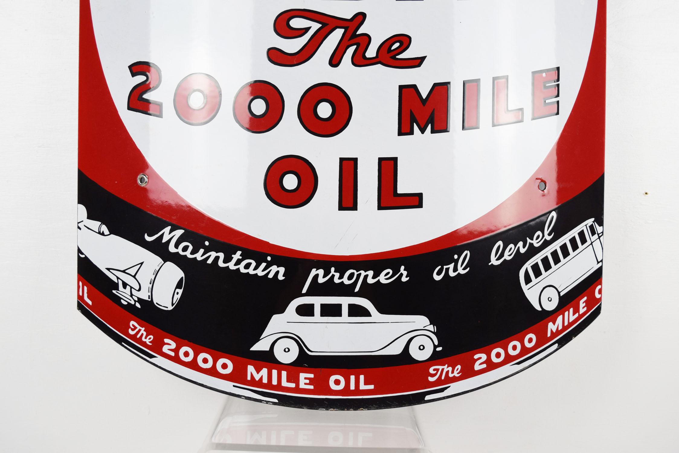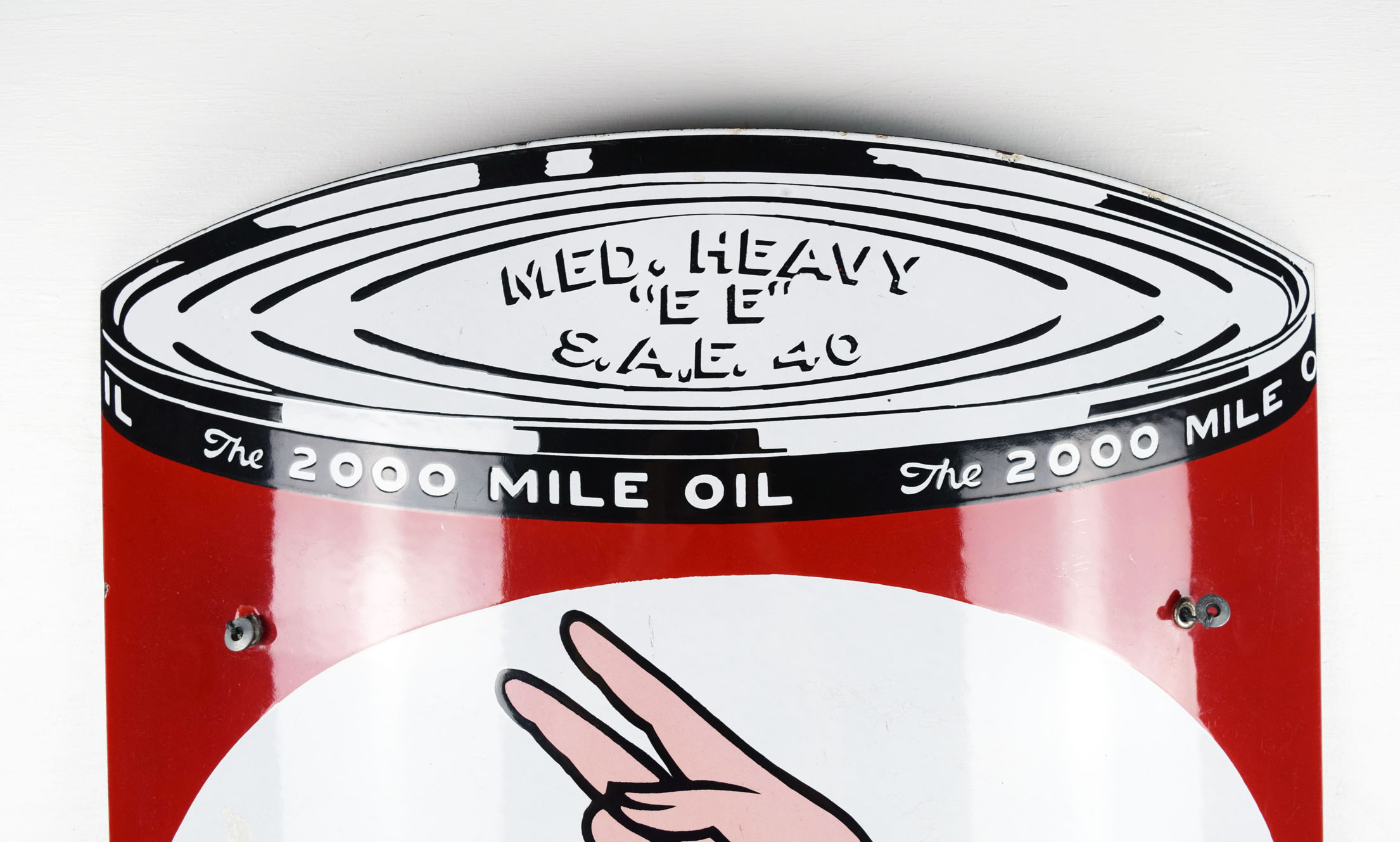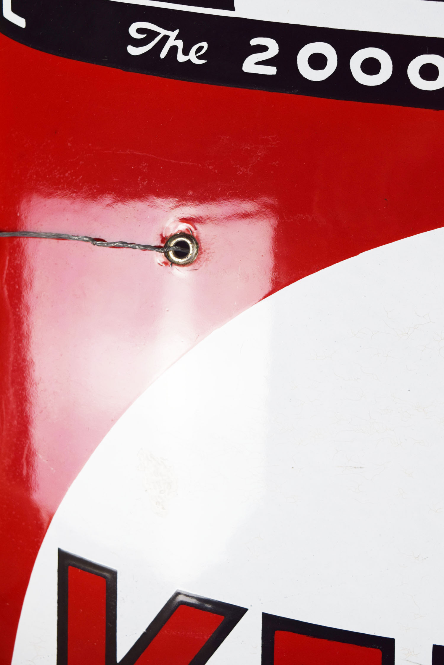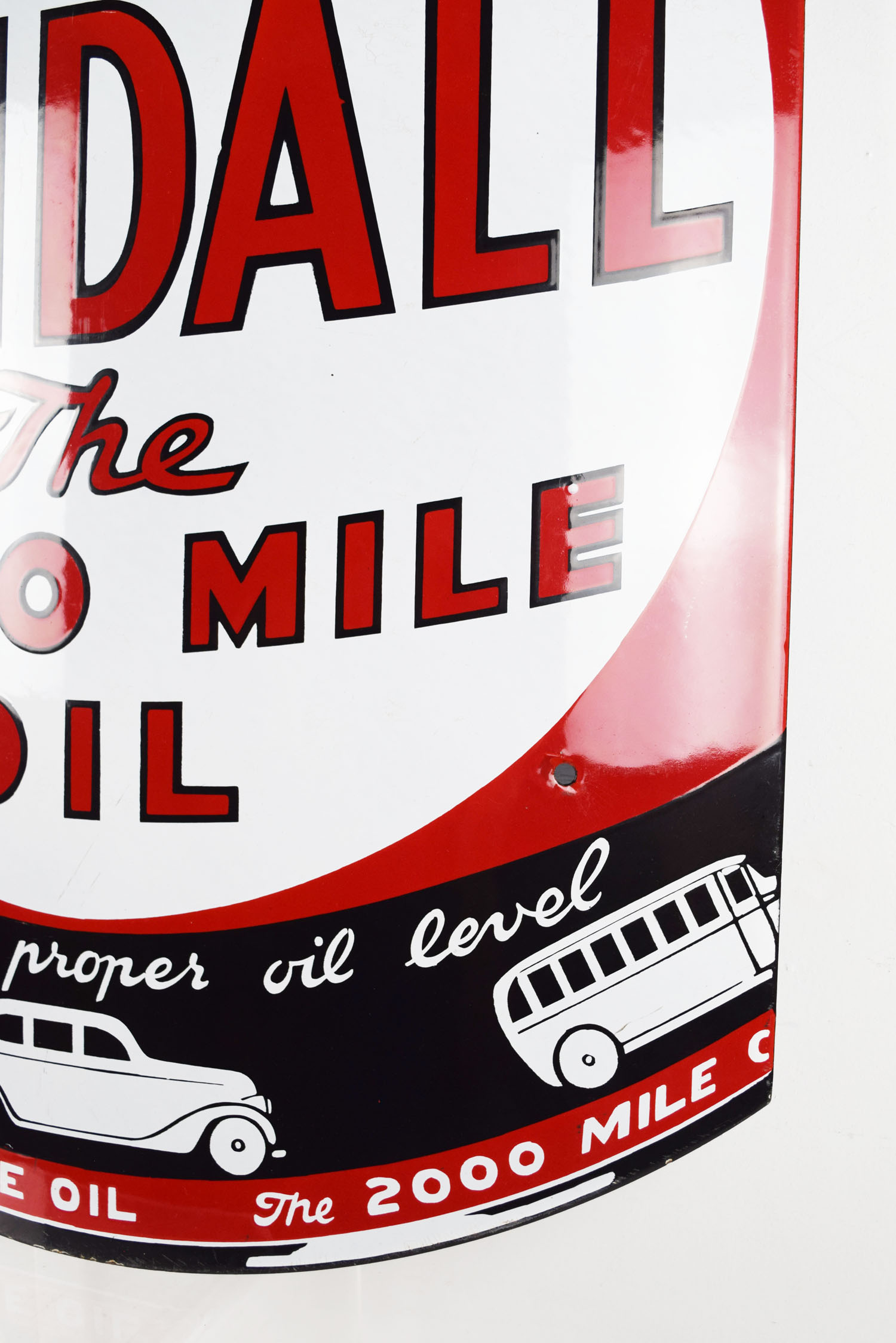 One of the harder to find Kendall Motor Oil signs, this curved porcelain sign is in amazing shape and ready for your collection. It measures thirty inches tall by nineteen inches wide with great color and sharp gloss. Produced to mimic a can of Kendall “The 2000 Mile Oil” this sign has die cut edges top and bottom, with a convex curvature in the center. Some minor chips can be seen on the top and bottom edges, with three of the four original grommets still attached to the sign. Up close you can see some very minor marks on the slick porcelain finish which do not take away from the value. Amazing example of this very rare sign. 19854-QRTPP