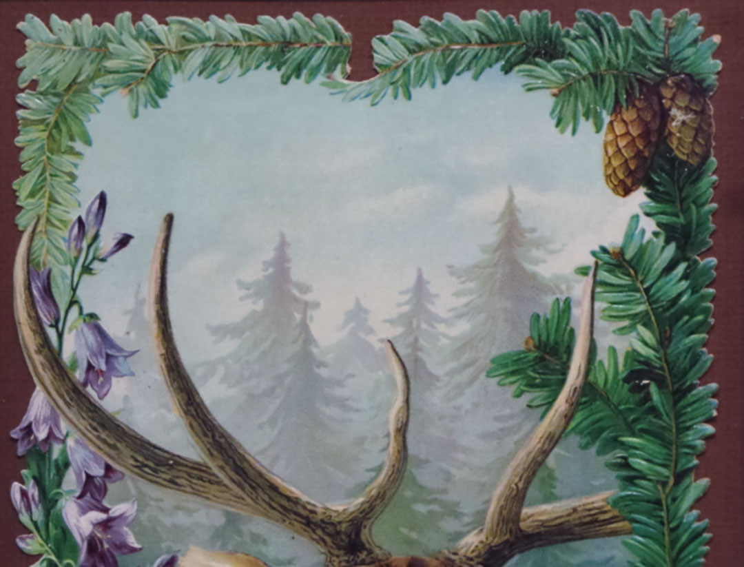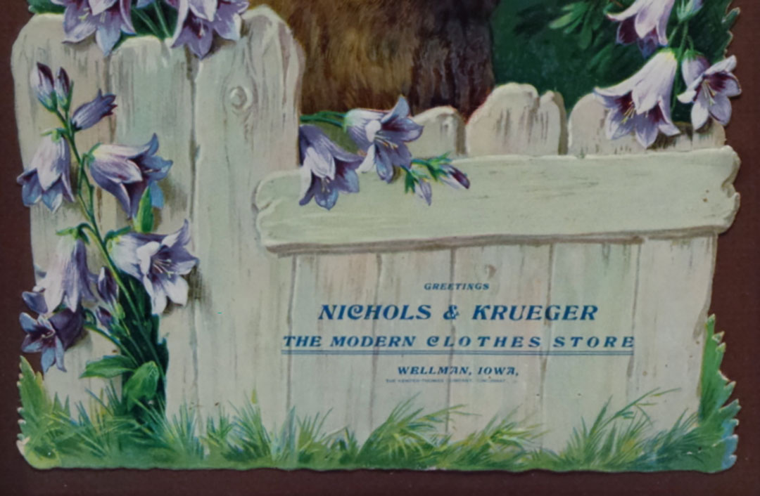 Manufactured by the Kemper-Thomas Company in Cincinnati and dating from the late 19th or early 20th century, this die-cut cardboard calendar top features an image of a stag peering over a garden fence and is inscribed at the bottom, “Greetings Nichols & Krueger, The Modern Clothes Store, Wellman, Iowa.” The calendar top measures about 15 1/2 inches tall by 8 1/2 inches wide and is in excellent condition with a torn hanging hole at the top and minor edge wear. It has been framed for display and protection. 16922-71WPP