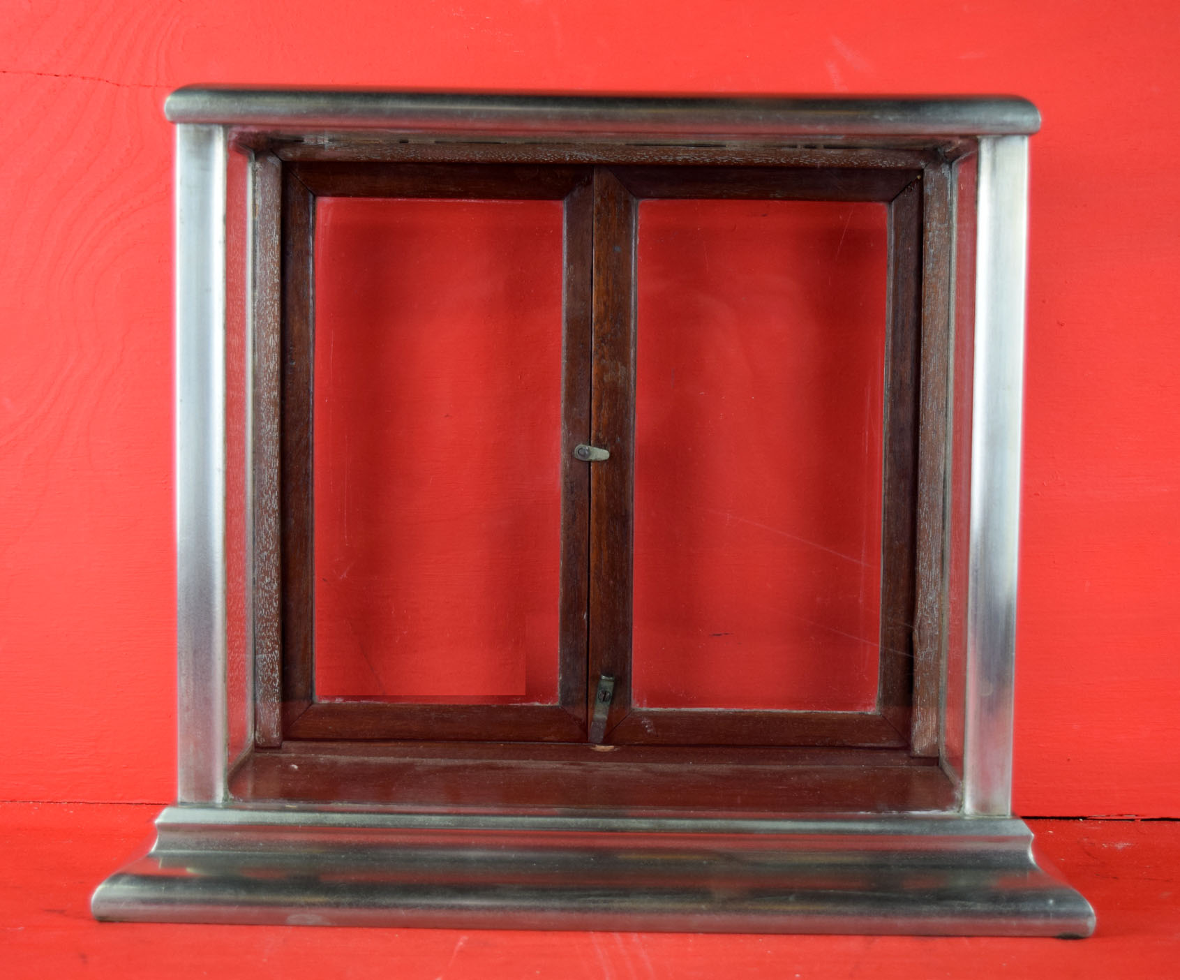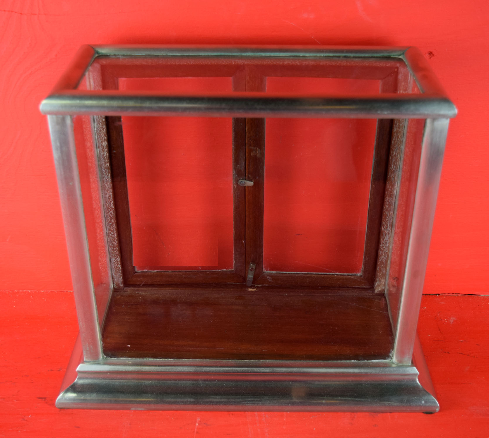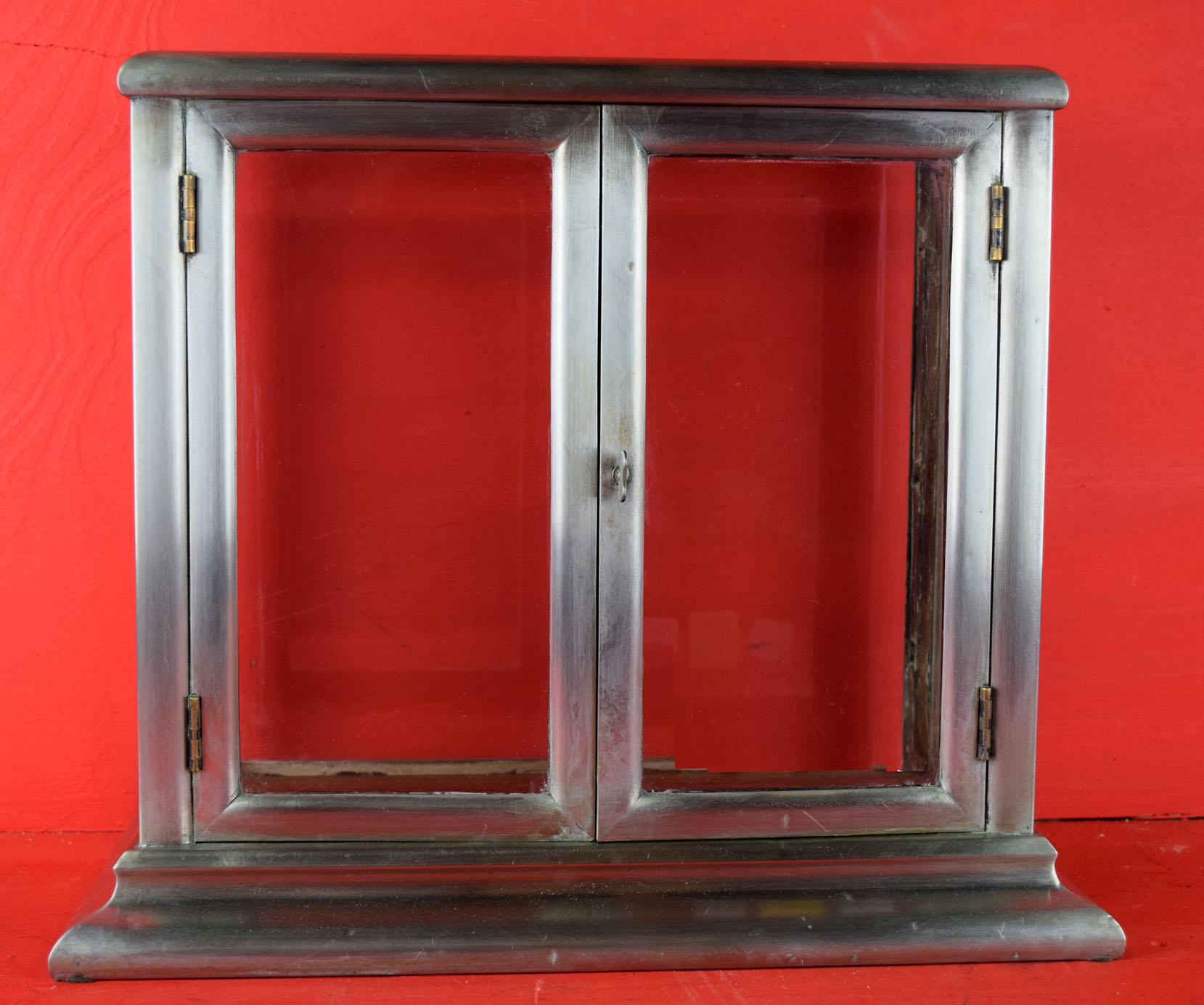 This salesman sample showcase needs to be on your ‘must have’ list for your collection! Standing only twelve inches tall, it features glass front, top, sides, and double doors in the rear. It has beautiful nickel trim on each corner, along with the bottom. The rear glass doors swing open with ease and have a small knob to keep them closed. Some minor wear can be seen on the nickel trim, but nothing major. Great piece to display with your salesman sample collection, or use to showcase your prized possession! This is an oversized shippable item. Please contact us for shipping quote. 19822-QEPP