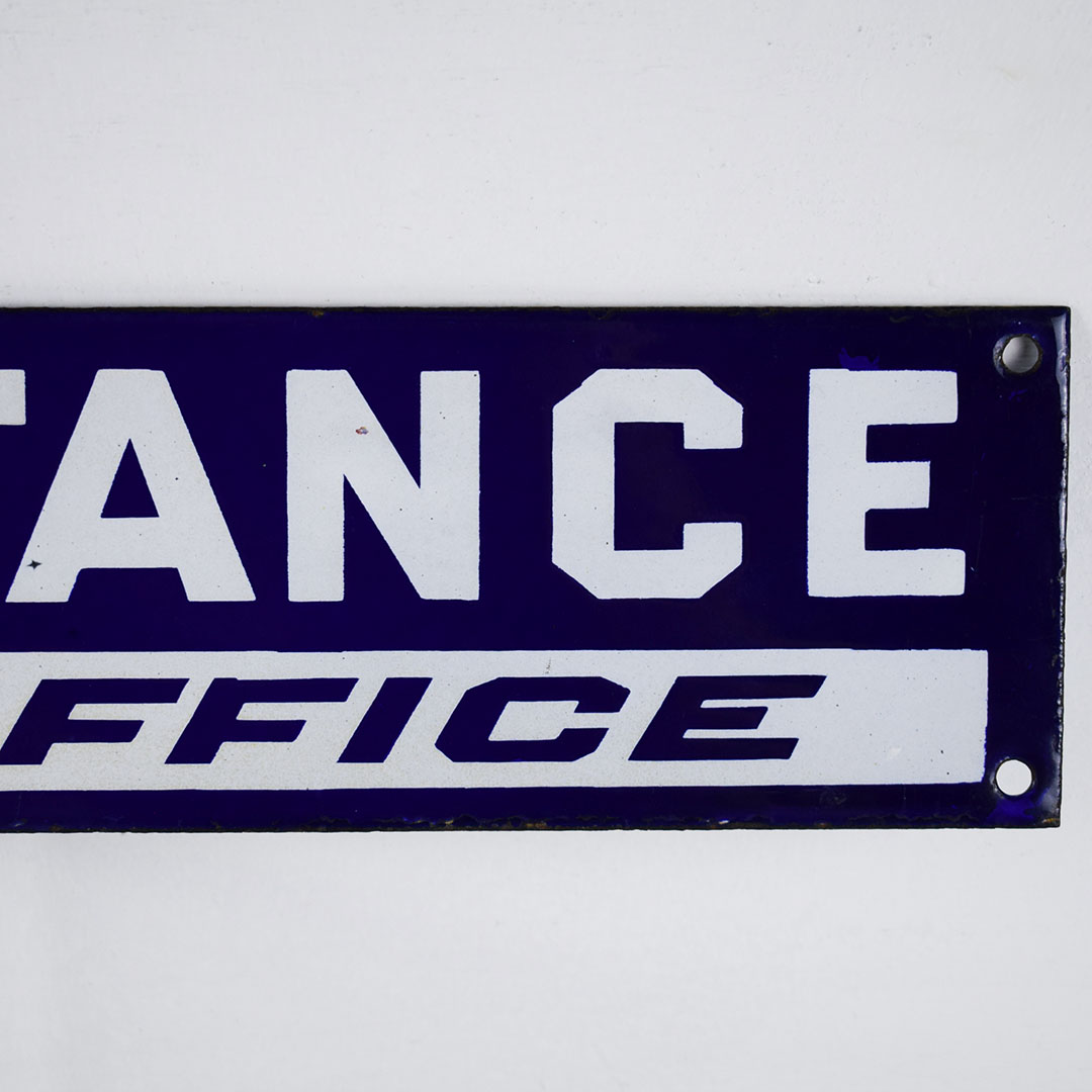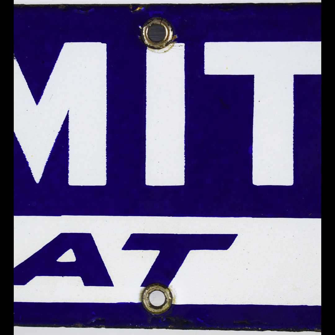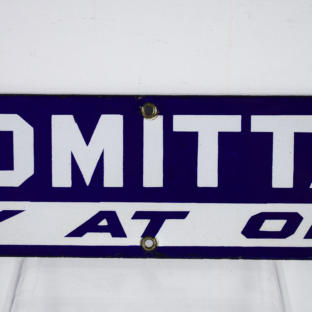 Just right to keep those pesky salespeople away from your door! This porcelain “No Admittance” sign measures 24 inches long by 4 inches tall. It features a beautiful cobalt blue background with white letters. It retains four original grommets, with two on the right side missing. Chips around the outer edges show the age of this piece. The gloss is excellent and sharp. 21275-QTP