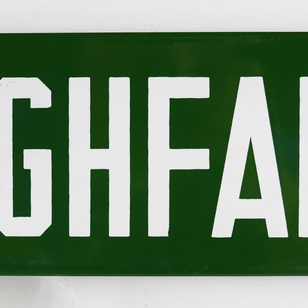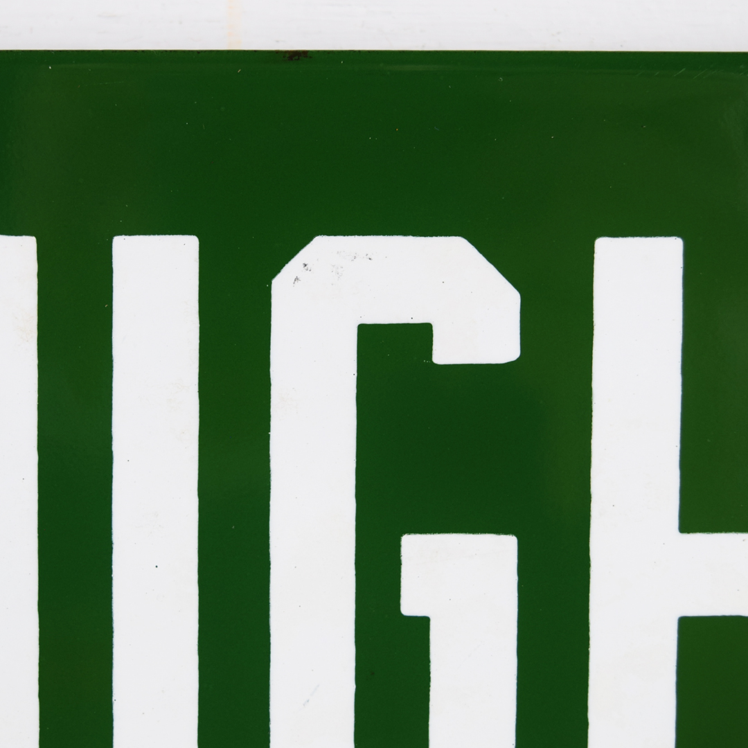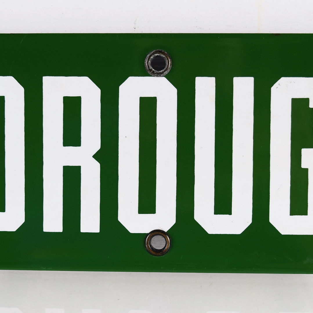 Measuring 4 inches tall by 24 inches, this vintage No Thoroughfare porcelain sign is a wonderful find for collectors. Its white letters pop against a vibrant green background, and the six original grommets around its outer edge make displaying it a breeze. You’ll love the excellent gloss of the porcelain finish, which is smooth and free of chips in the field. At the very top of the ‘G’ in Thoroughfare, a touch of missing white material from production adds unique character. With its outstanding condition, this unused sign is ready to be a standout addition to your collection. 21449-QQP