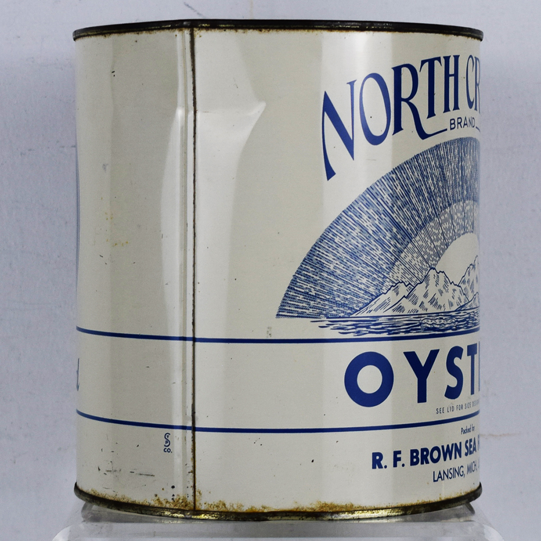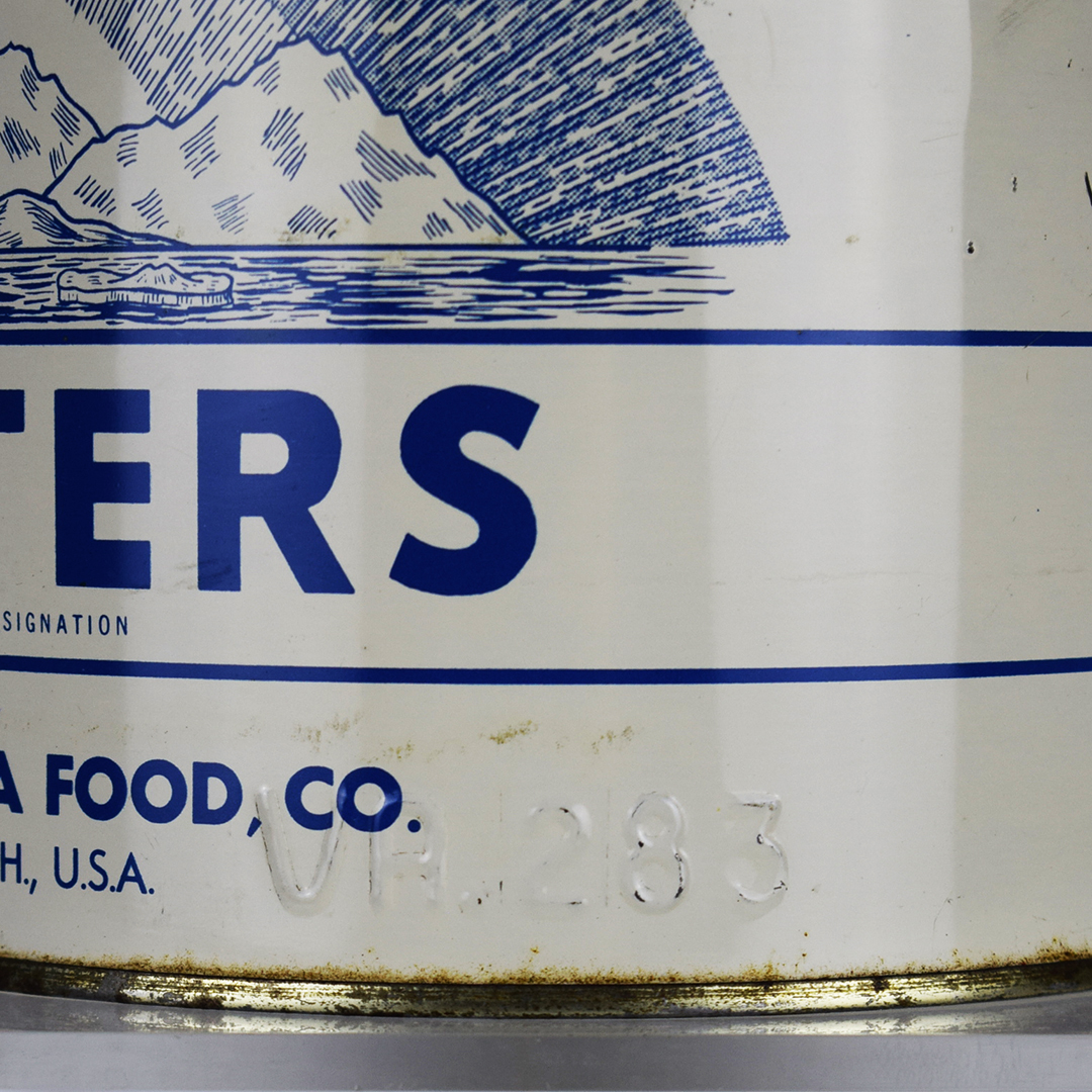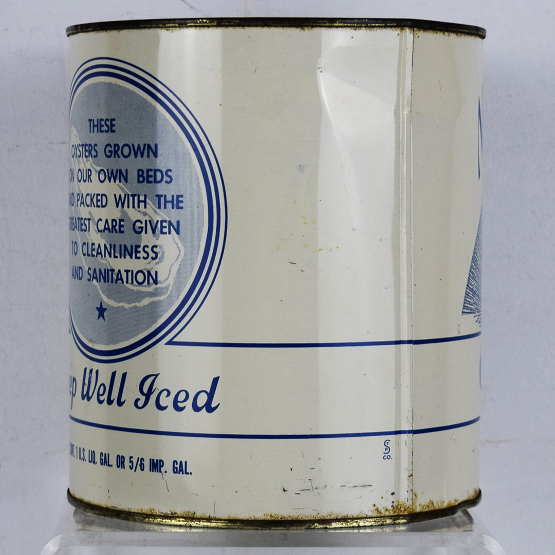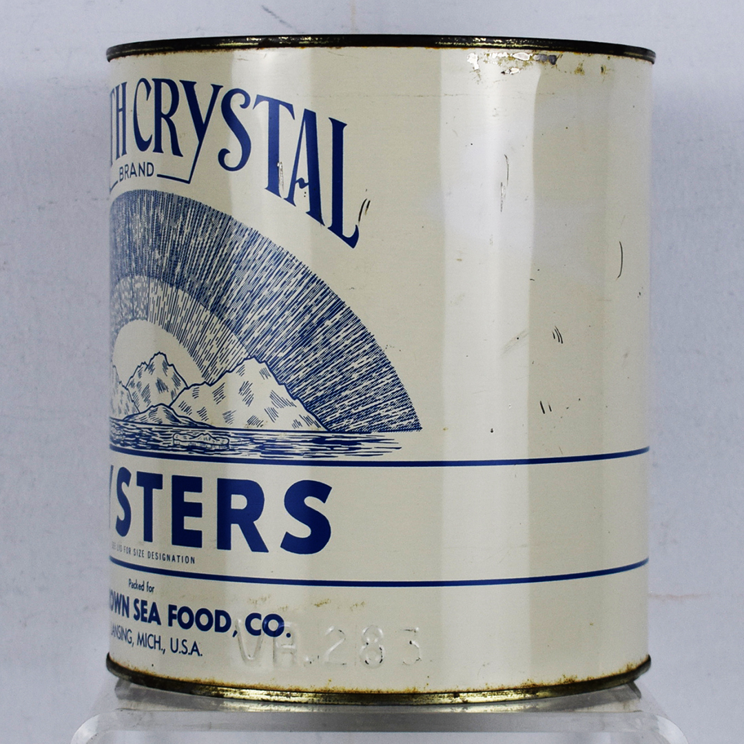 Many vintage oyster cans featured spectacular graphics that set them apart and captured the attention of consumers. These cans were made of thin tin to allow shippers to keep the oysters cold by packing them in ice during transport. This North Crystal Brand oyster can feature a white can with blue letters, along with an image of icebergs below a curved sky. It measures 7.5 inches tall by 6.75 inches wide and is stamped “VA. 283” along the bottom lip. Some minor dents are along the top and bottom lips, along with typical paint loss. The lid is not original, but it looks good on the can. 21346-OT
