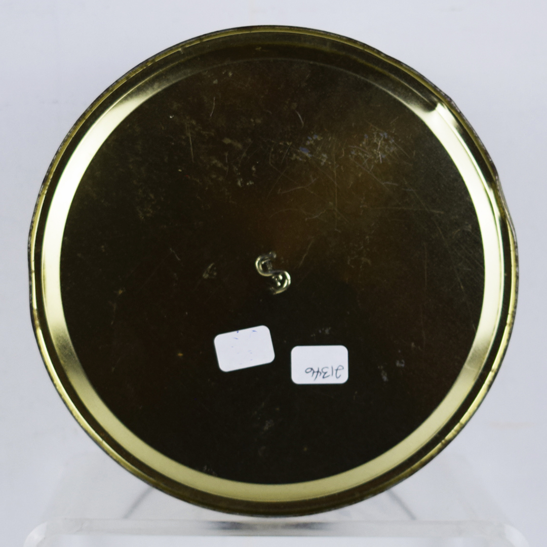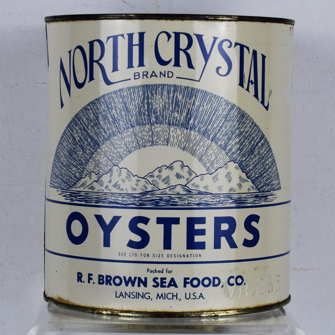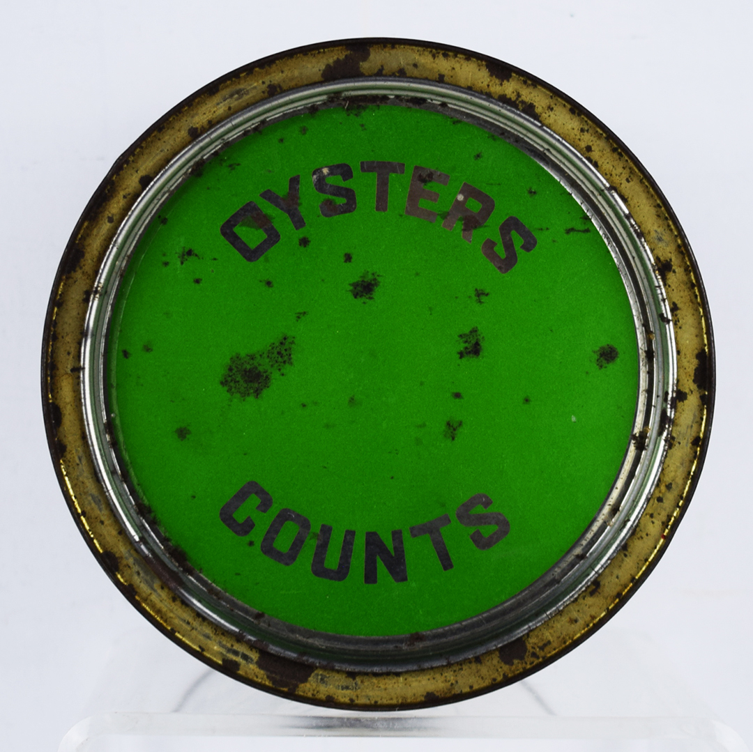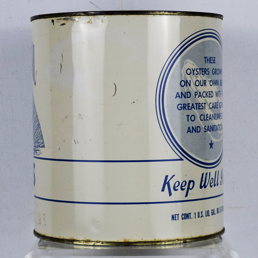 Many vintage oyster cans featured spectacular graphics that set them apart and captured the attention of consumers. These cans were made of thin tin to allow shippers to keep the oysters cold by packing them in ice during transport. This North Crystal Brand oyster can feature a white can with blue letters, along with an image of icebergs below a curved sky. It measures 7.5 inches tall by 6.75 inches wide and is stamped “VA. 283” along the bottom lip. Some minor dents are along the top and bottom lips, along with typical paint loss. The lid is not original, but it looks good on the can. 21346-OT