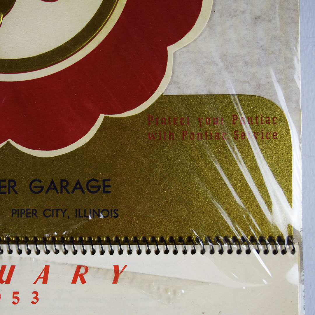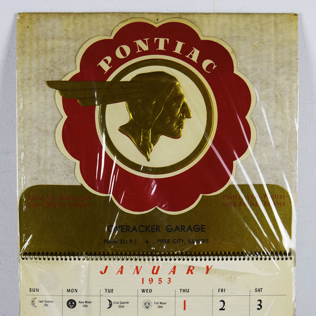 Calendars given at Christmas time were a way for businesses to say “Thank You” to their customers for their business over the past year. This paper calendar is in new old stock condition and features a full 1953 calendar pad with the iconic Pontiac Indian Head logo on the top. The raised golden Pontiac logo looks fantastic against the die-cut calendar top, with “Overacker Garage” below. Overacker Garage was a small Pontiac dealership located in Piper City, Illinois. This calendar is still in the original cellophane on the cardboard backer. 20928-QPP