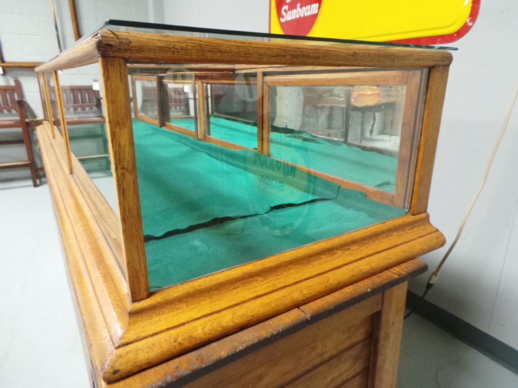 Dating from the late 19th or early 20th century, this oak framed glass counter top showcase has 4 mirror fronted sliding rear doors and 3 glass front panels. Although it originally had 2 separate glass panels at the top, they have been replaced with a single sheet of heavier plate glass that rests on top of the wooden frame. The showcase measures 16 inches tall by 96 inches wide by 26 3/8 inches deep and is in excellent condition with an older refinish. Also,1 front glass and 1 side glass and 2 mirrors have been replaced, due to chips and just needing replacing. This item will require a 3rd party shipper or pickup. Please contact us for more information. 17380-81EPP