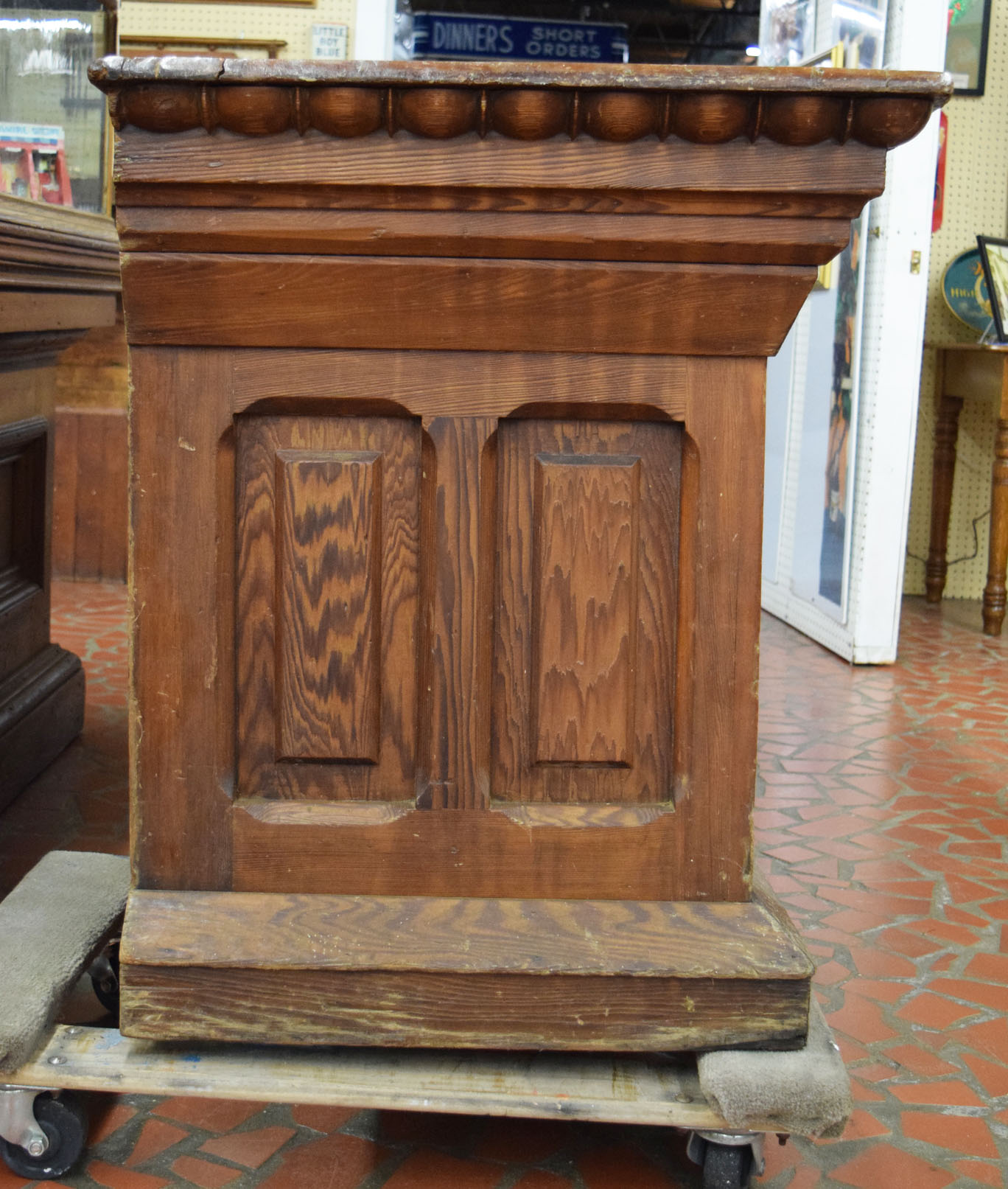 Just the right size for your home or office, this oak general store counter measures 6 feet long and has excellent detail on the front and sides. The raised panels on the front and sides add the proper accent to the piece, along with the pinwheel trim in the center front. Just under the one-piece wood top, you can see scallop trim. Some small cracks can be seen on the top, along with typical wear on the outer edges. Measurements of this piece are 72 inches long, 31.5 inches tall, and 26 inches wide. This item is pickup or 3rd party shipping, so don’t hesitate to contact us for more information. 19850-QIPP