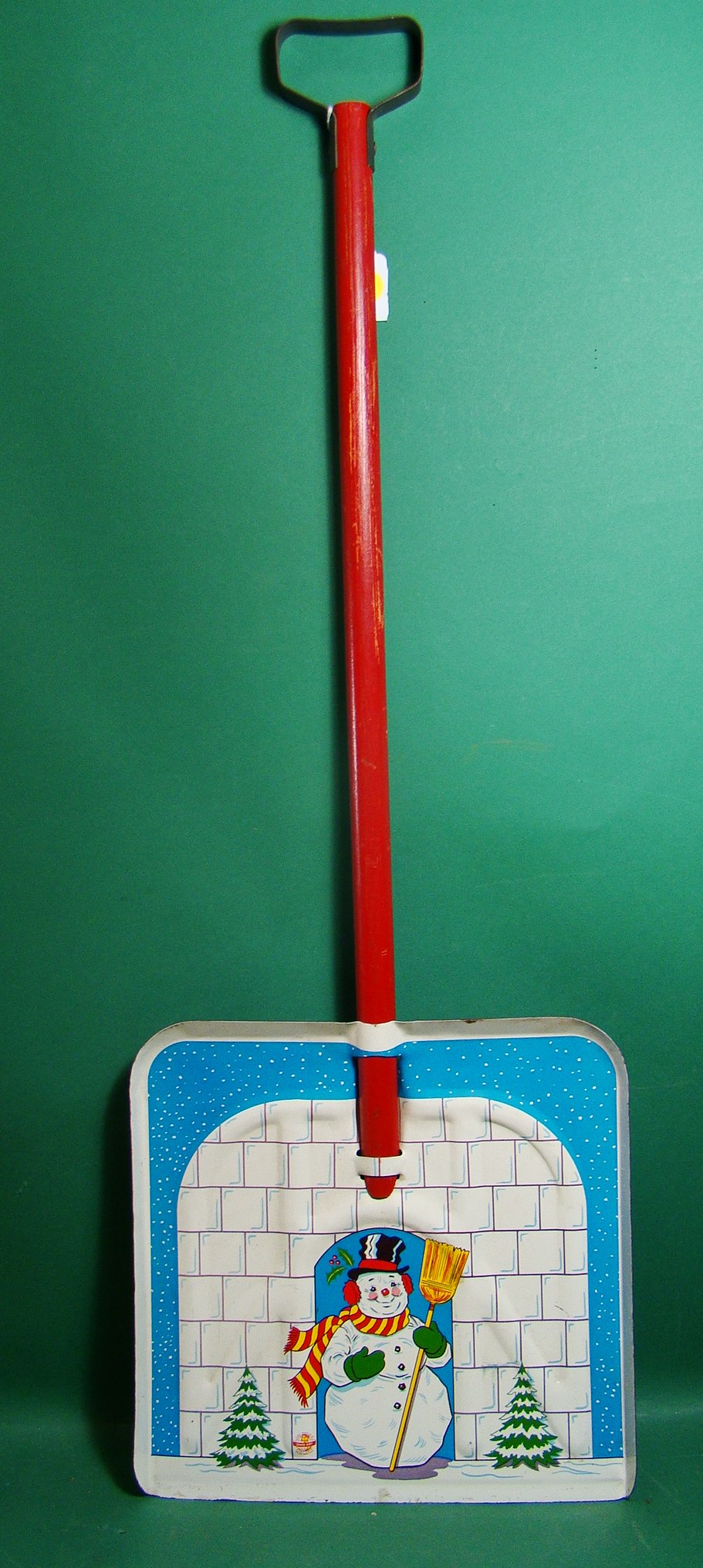 This great full color shovel is large and would be a wonderful for a winter wall decoration. Circa 1960 all original with colorful snowman with broom. Looks never to have been played with. Hard to find one of these very large shovels in this condition with no rust or wear. 2759-QUT