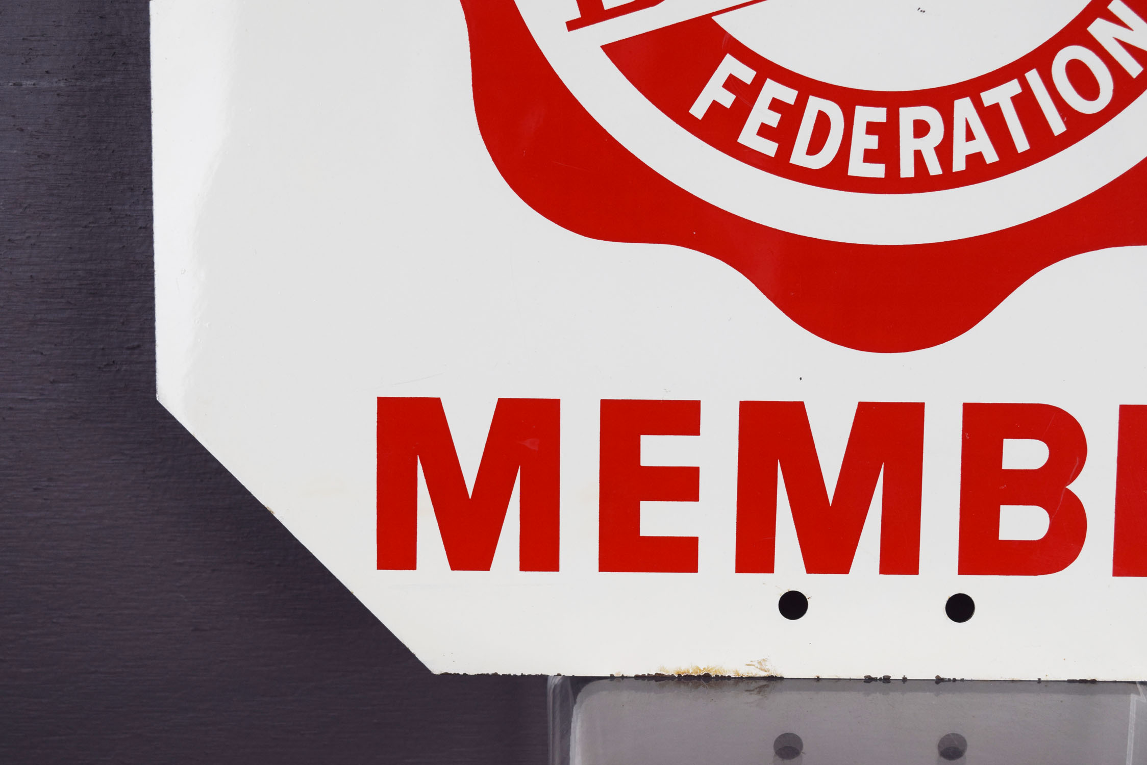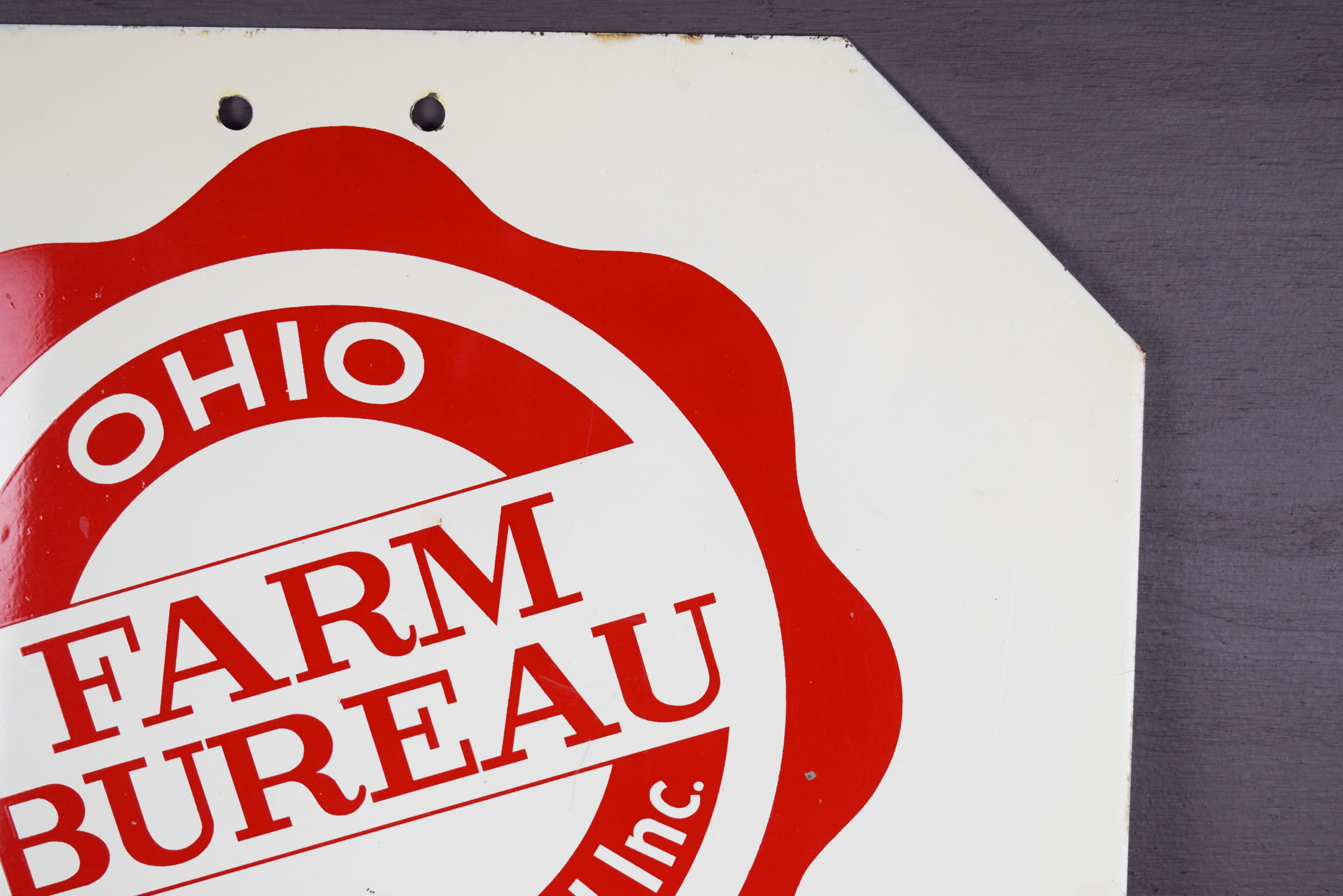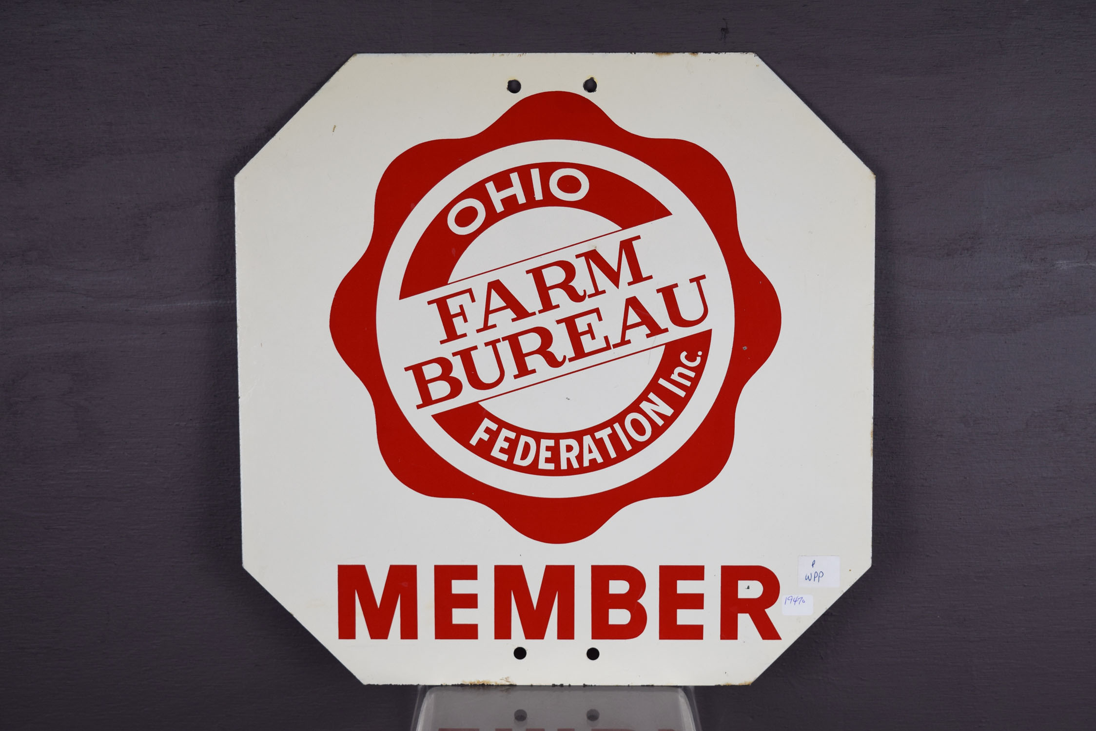 Farm bureau signs are super collectible right now and just about every state had one with different sizes and styles. This one is super neat because it is a double sided that the farmer could use on their farm for traffic flow! One side features the Ohio Farm Bureau Federation logo with Member at the bottom, and the opposite side is a super useful Stop sign. Some light scratches can be seen on both sides with some chipping on the top and bottom edges. The gloss looks great on this fifteen inch sign that will make a nice addition to your collection! 19470-WPP