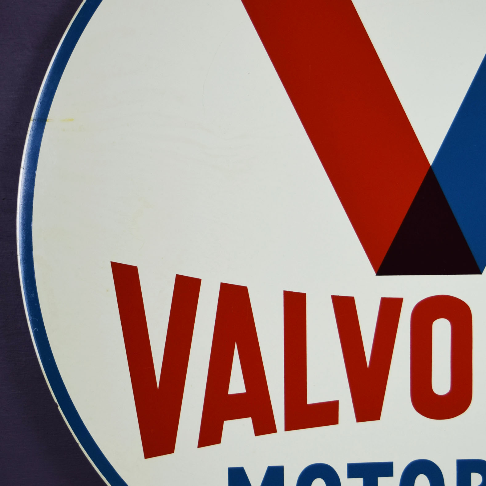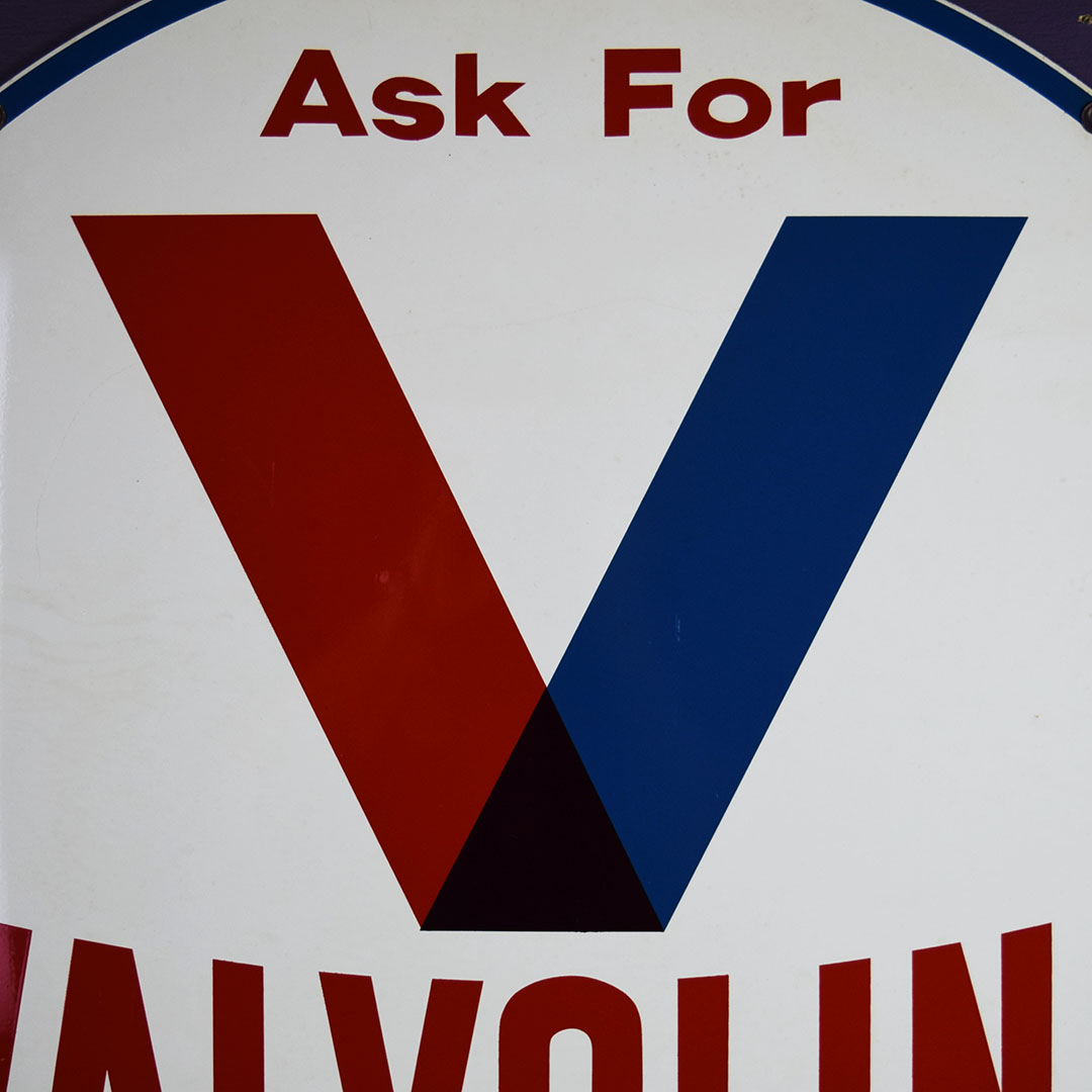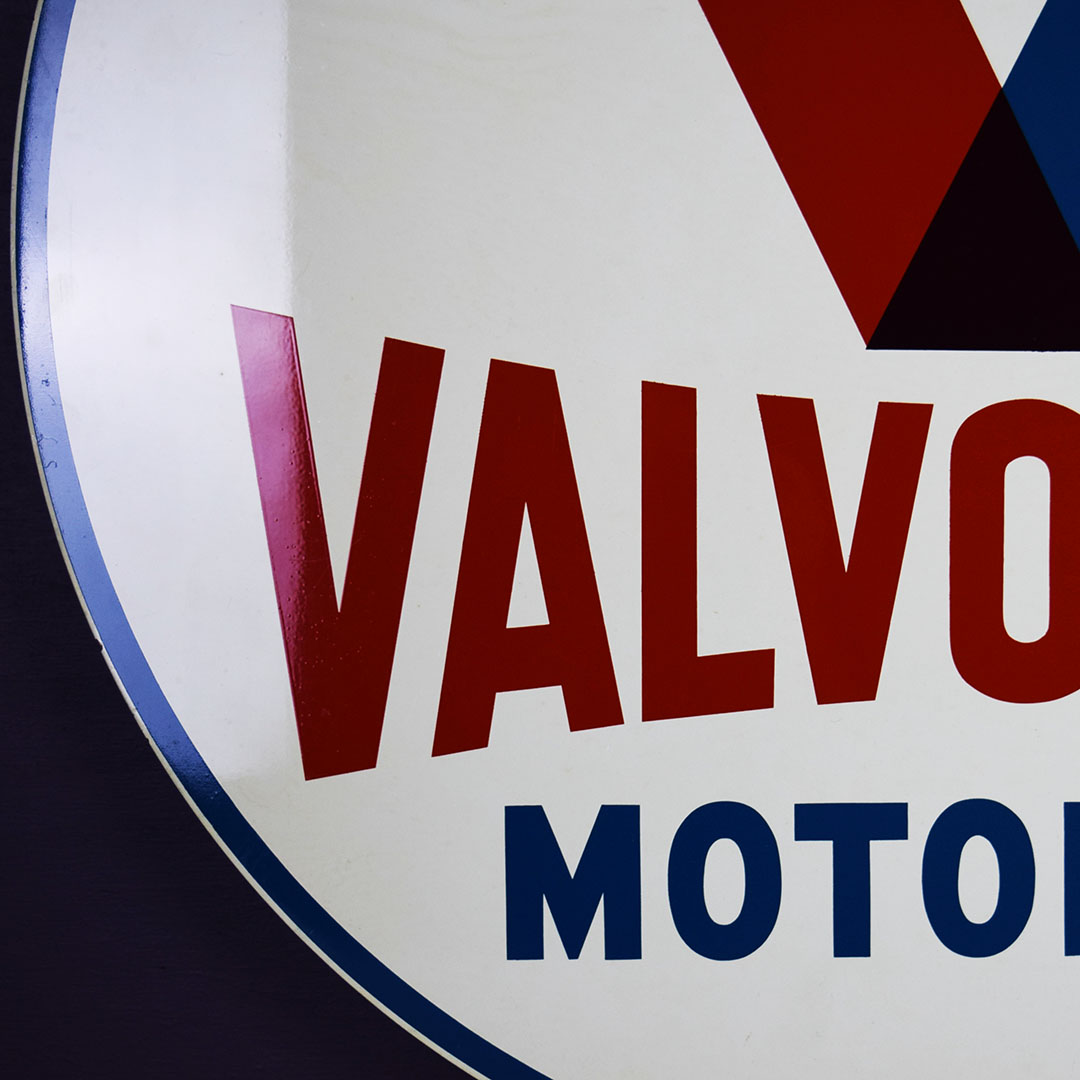 Whew! Time capsule alert! This beautiful original Valvoline Motor Oil sign is dated 5-60 and produced by Allen-Morrison in Lynchburg, Virginia. Sharp colors on both sides and impeccable gloss make this a solid keeper and one you will not have to upgrade. Typical small chips around the outer edge, this sign retains the original brass grommets that allowed it to hang in a sidewalk frame outside the service station, attracting attention. Two small chips are on one side, with slight color discoloration on the other. There is some crazing in the paint finish along the bottom edge, with tiny chips. It measures 30 inches tall by 30 inches wide and will be an excellent addition to anyone’s collection. 21059-QRPP