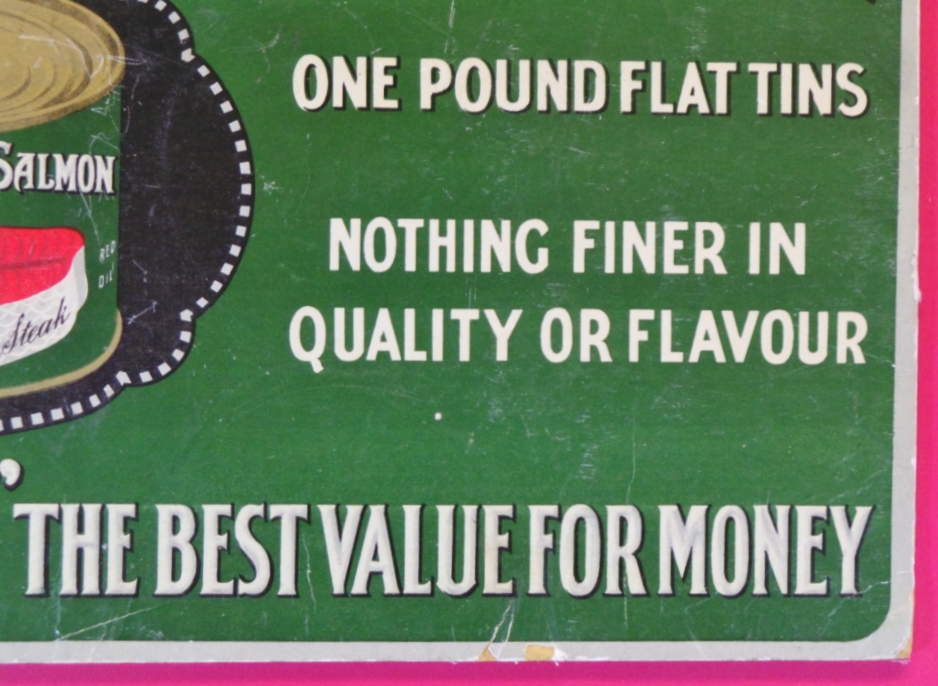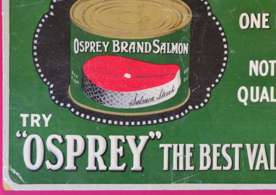Dating from the late 19th or early 20th century, this rare cardboard sign is decorated in green with white lettering and an image of a can of Opsrey Brand Salmon. The sign is inscribed “Osprey Finest Red Salmon in rich oil One Pound Flat Tins Nothing Finer In Quality Or Flavor Try ‘Osprey’ The Best Value For Money.” The sign measures 10 3/4 inches tall by 14 1/2 inches wide and is in excellent condition with wear and creases on the edges and light scuffs and scratches on the surface. It has been framed for display and protection. 1409-81WTP