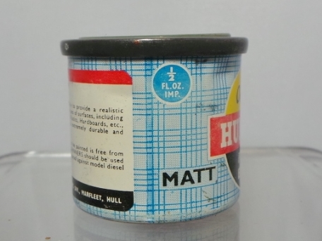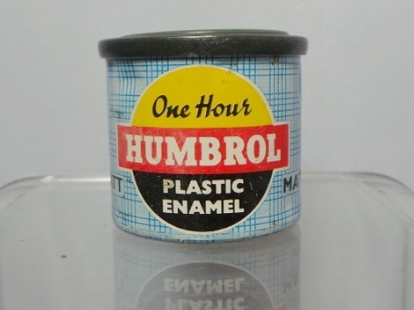 From the 1950s, this tiny, unopened tin holds 1/2 ounce of “One Hour Humbrol Plastic Enamel” paint. A product of the Great Britain-based Humber Oil Company, these paints were developed for painting model cars and airplanes, thus making them small. The tin measures 1 1/8 inches tall by 1 1/4 inches in diameter and is in excellent condition with minor dings on the sides. 1223-81QP