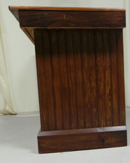 Circa 1900, painted pine counter with an open back and no shelves. It has recessed wainscot panels on the front and sides and a top of 13 boards of tongue and groove flooring. It is painted in a brown stain over white, giving it a honey-amber look. It is in excellent condition with typical wear on the top and sides and measures 34 1/4″ tall by 89.25″ wide by 32″ deep. THIS IS NOT A STANDARD SHIPPING ITEM. IT WILL REQUIRE A THIRD PART SHIPPER. Of course, we love customers, so you can pick it up at our location and browse our two stores! 6950-ETP