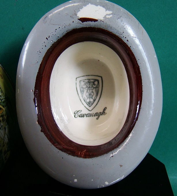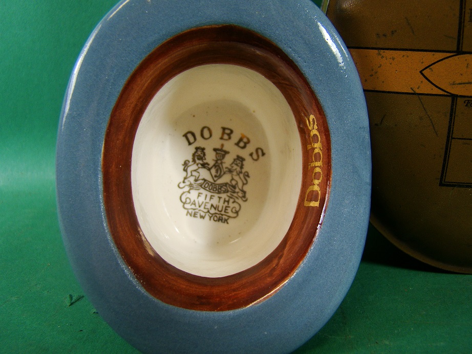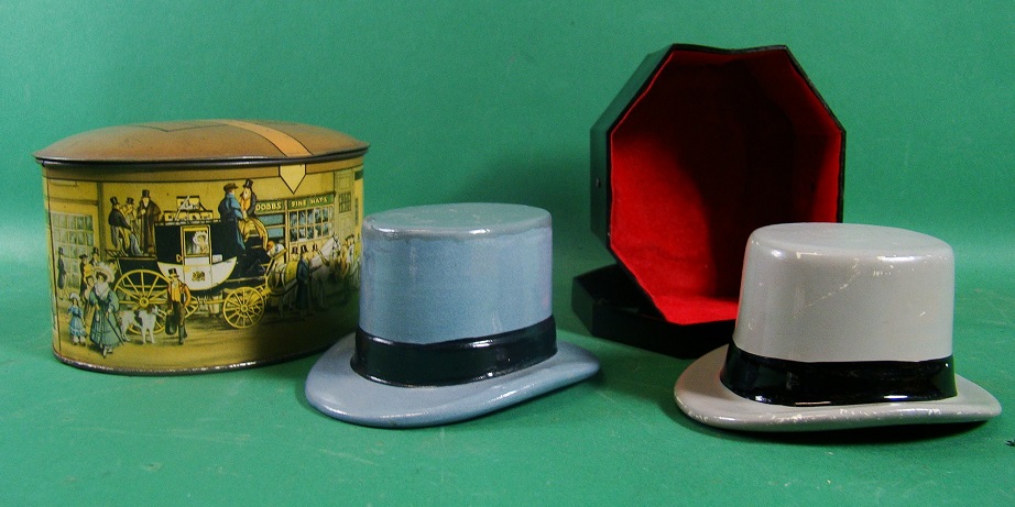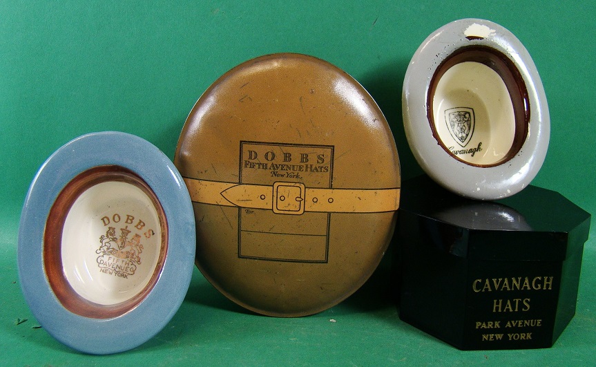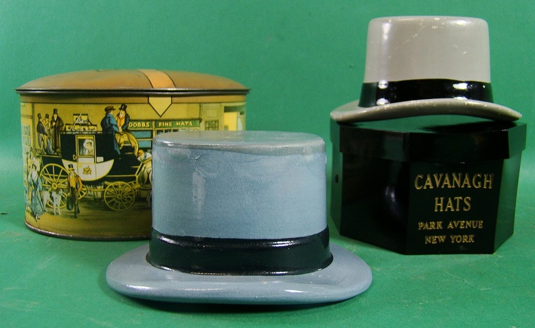 The first is an unusual tin miniature hat gift box that dates from the 1920s or 1930s and comes with a miniature ceramic top hat inscribed on the inside, “Dobbs Fifth Avenue New York,” on a lion coat of arms. The tin is decorated with a lithograph of a busy nineteenth-century urban street scene, and the hat is in near-mint condition. The second is an elegant miniature octagonal hat box made of shiny black plastic, which looks like lacquer, and inscribed “Cavanagh Hats Park Avenue New York” on the ends. It contains a man’s stoneware hat, painted gray and inscribed with a lion, shield emblem, and “Cavanagh” inside. These miniatures were given as gifts to be redeemed for a fitted hat at the clothing store. The hat has some areas of wear and paint loss. 9462-5175