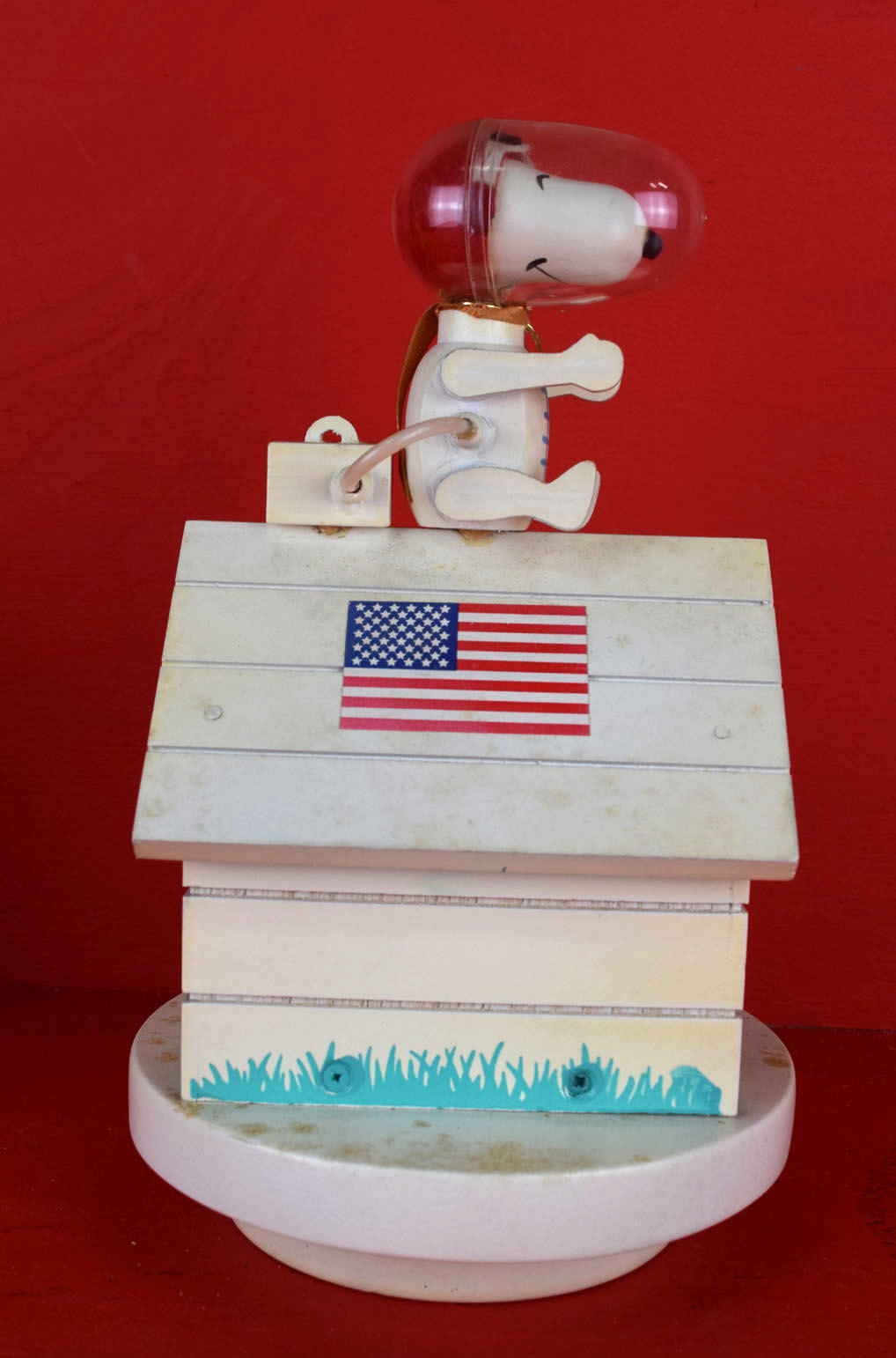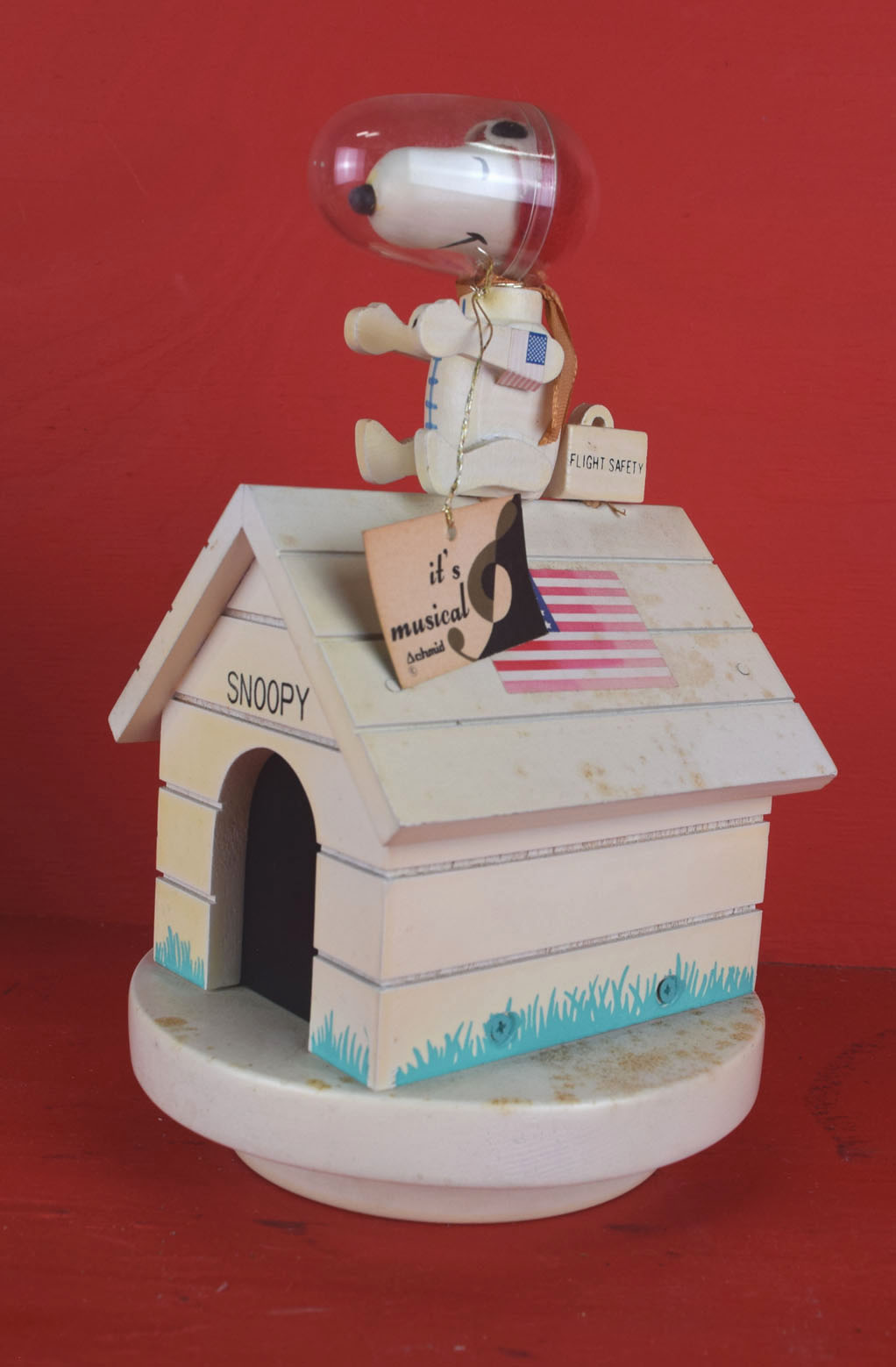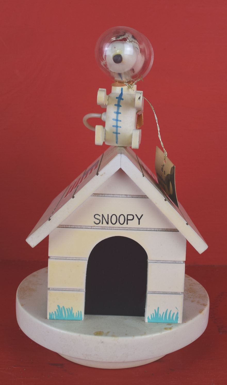 Dating from the late 1960’s, everyone’s favorite Peanuts character is poised atop his dog house and ready for action. The two music boxes work perfectly and are in great shape. The astronaut Snoopy has Snoopy in his space suit along with the American flag on each side of his white dog house. It plays “Fly Me To The Moon” when wound. The Red Baron Snoopy is dressed in his goggles and red scarf atop his yellow dog house. Snoopy’s left arms have been glued on, and it plays “Over There”. Both music boxes work like they should and have the original tags still attached. They both could use some light cleaning, and are all original. 2040-