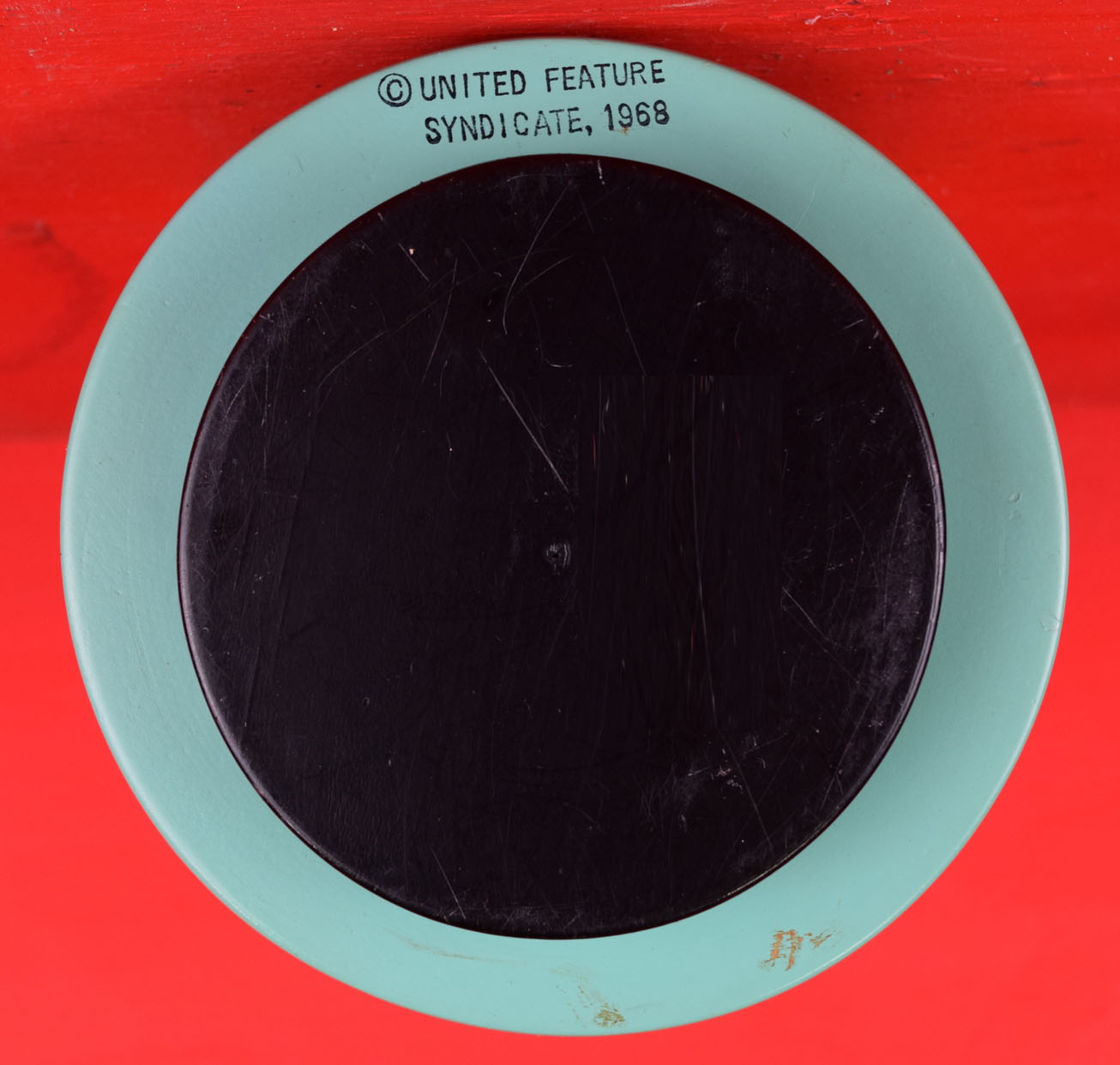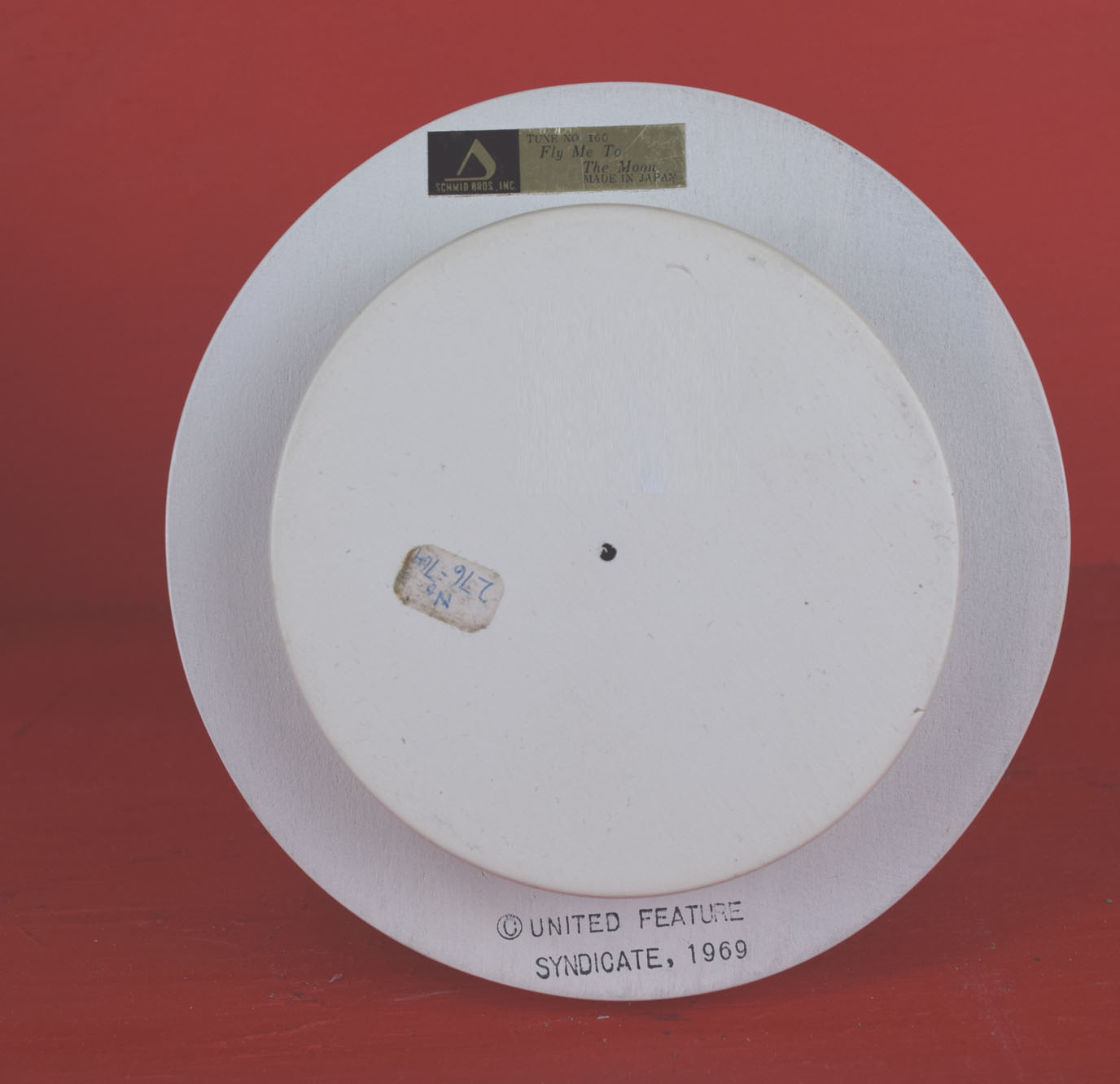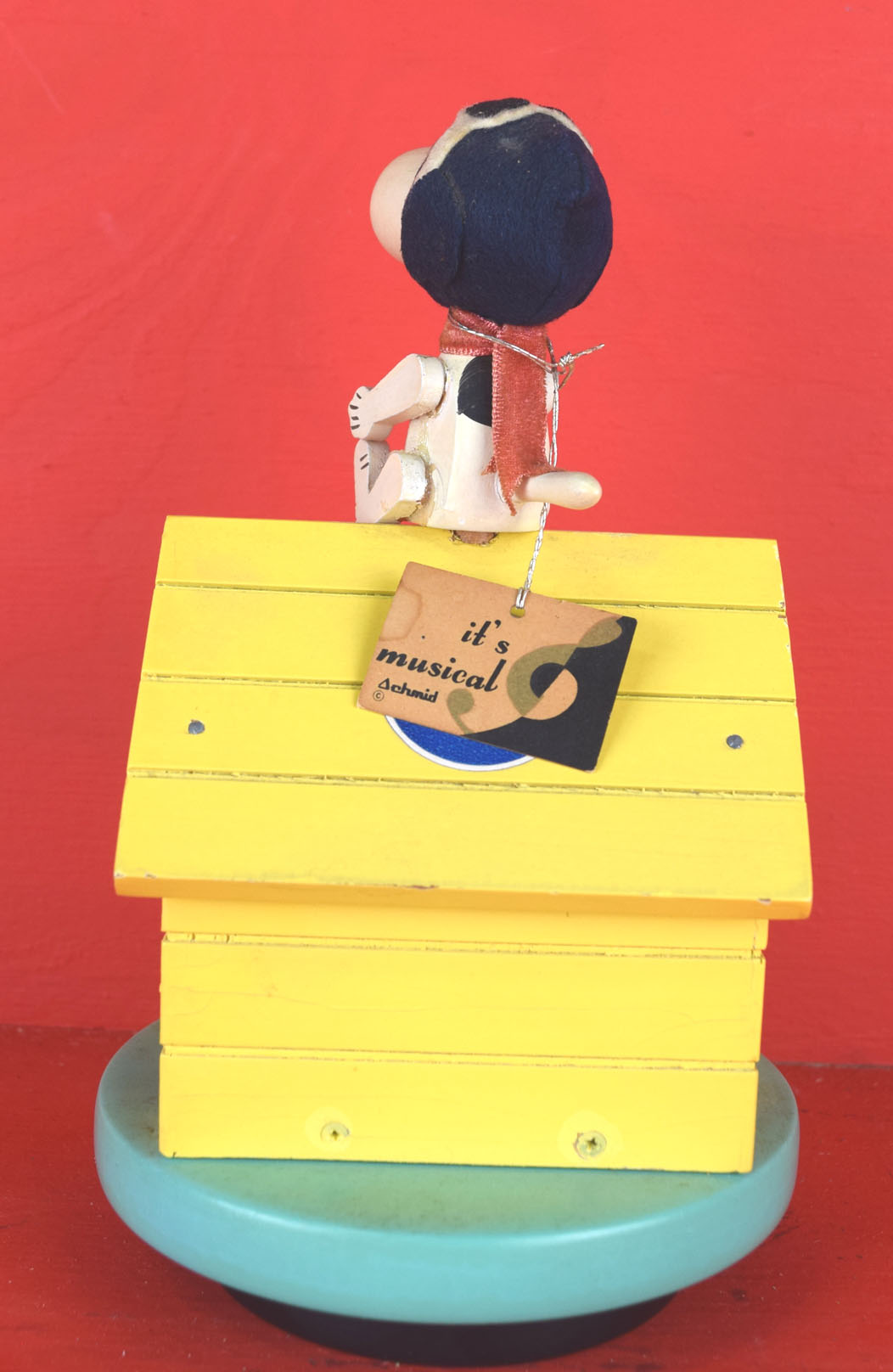 Dating from the late 1960’s, everyone’s favorite Peanuts character is poised atop his dog house and ready for action. The two music boxes work perfectly and are in great shape. The astronaut Snoopy has Snoopy in his space suit along with the American flag on each side of his white dog house. It plays “Fly Me To The Moon” when wound. The Red Baron Snoopy is dressed in his goggles and red scarf atop his yellow dog house. Snoopy’s left arms have been glued on, and it plays “Over There”. Both music boxes work like they should and have the original tags still attached. They both could use some light cleaning, and are all original. 2040-