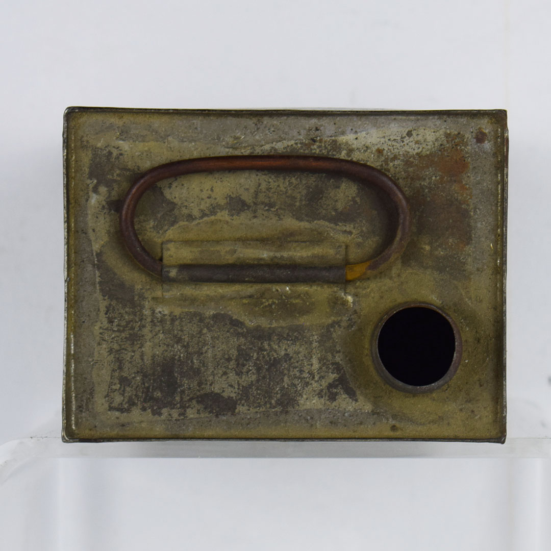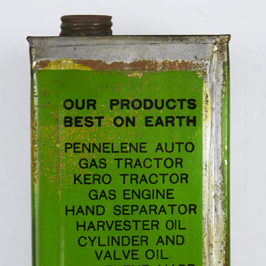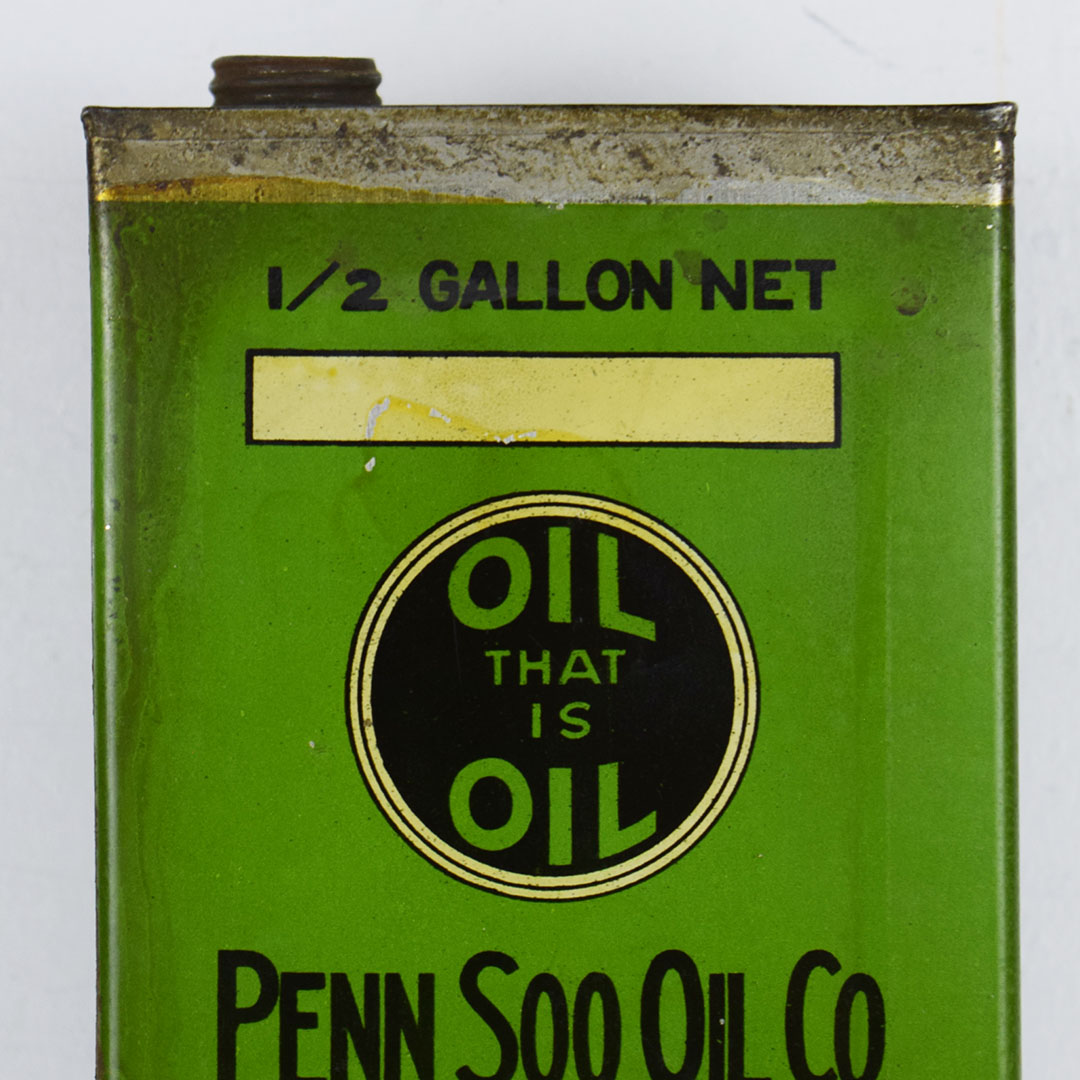 Seldom seen, this rare Penn Soo Oil Company half-gallon metal can features solder seams on a graphic can. It has excellent colors and shine, with a few minor nicks on the sides. The original cap is gone, but the original handle is on top. The front and back feature Penn Soo Oil Co. and Sioux Falls, South Dakota, along with their slogan, “Oil That Is Oil,” and the sides list all the oils that Penn Soo Oil Co. produces. It is a nice smaller rectangle can that will feel right at home in your collection. 20999-RPP