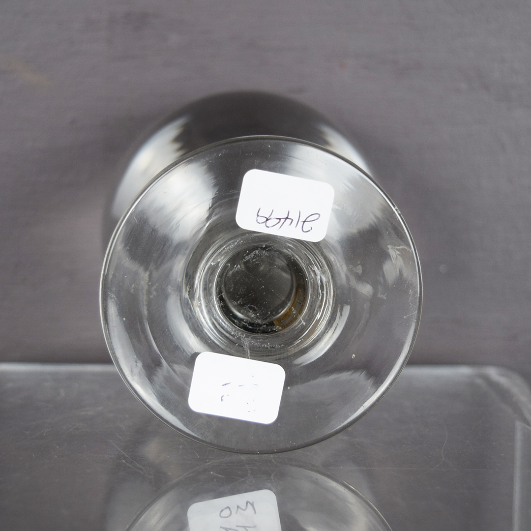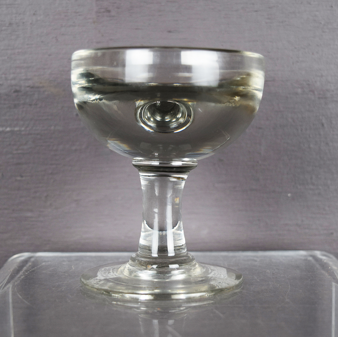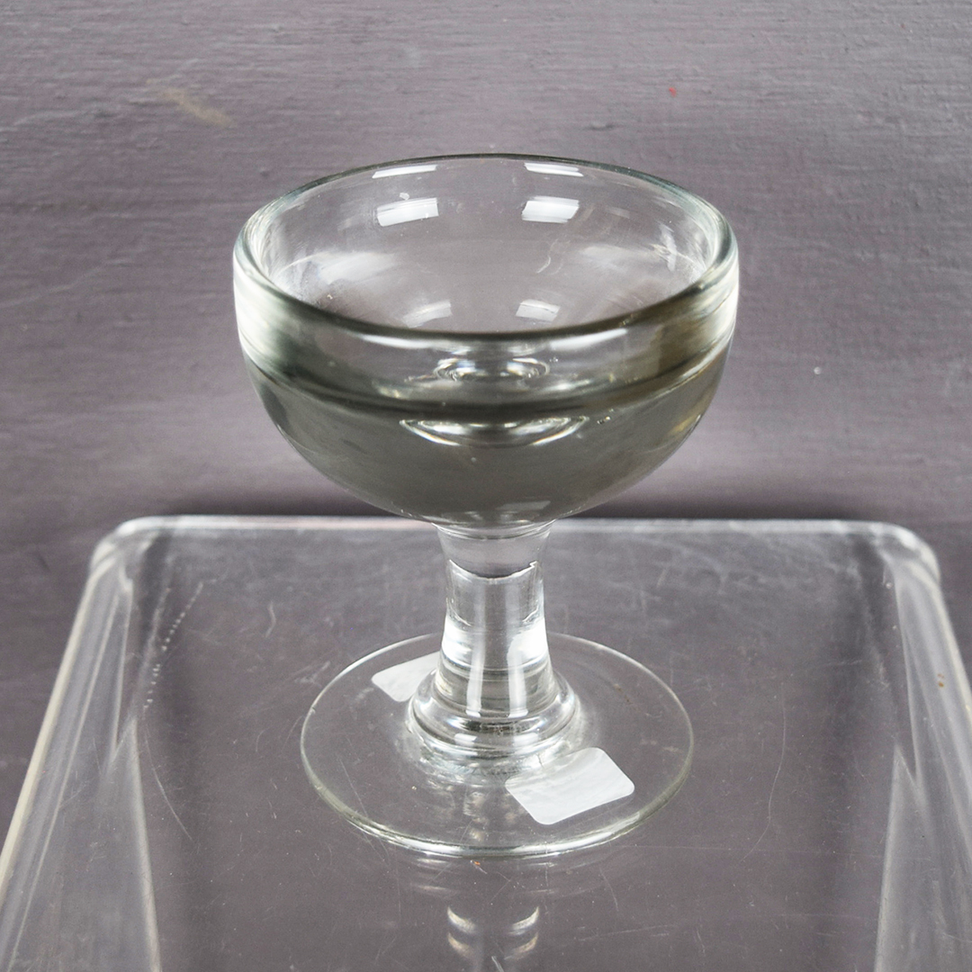 Originally used in London, England, this small glass let customers buy a penny’s worth of ice cream, eat it, and then lick the glass clean. The street salesman would rinse the glass in water, towel-dry it, and reuse it—a practice so unsanitary it was banned in 1898. The glass’s thickness made the contents look larger, so customers felt they got more for their penny. Measuring 3 3/4 inches tall with a 3 1/8 inch round top, this glass remains in excellent condition. The depth of this penny lick is only 1 inch, but it appears larger, creating an optical illusion. It has a tiny air bubble in the glass. Like other penny-lick glasses, it has no markings. 21499-TT